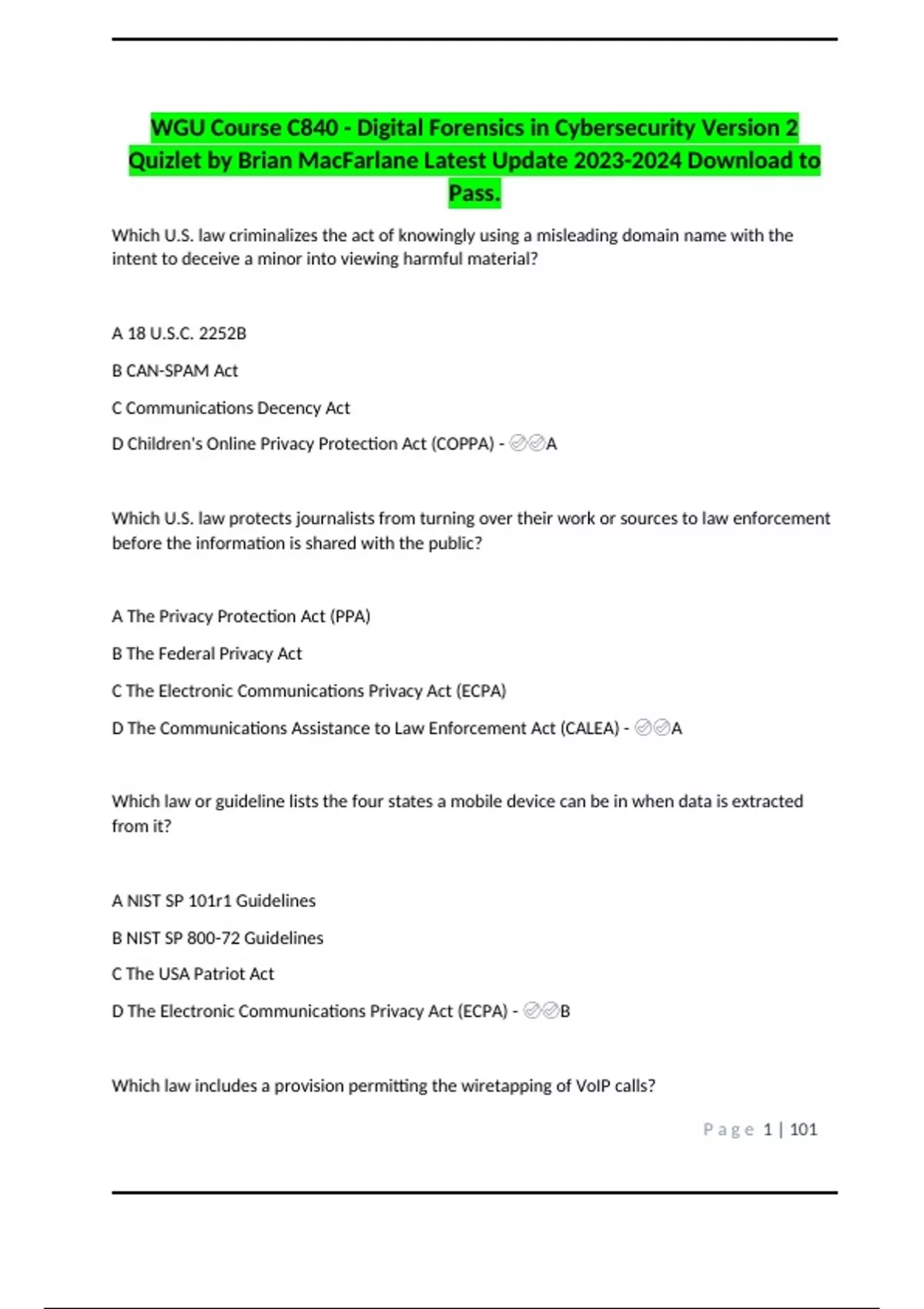 WGU Course C840 - Digital Forensics in Cybersecurity Version 2 Quizlet by Brian MacFarlane Latest Update Download to Pass..docx
