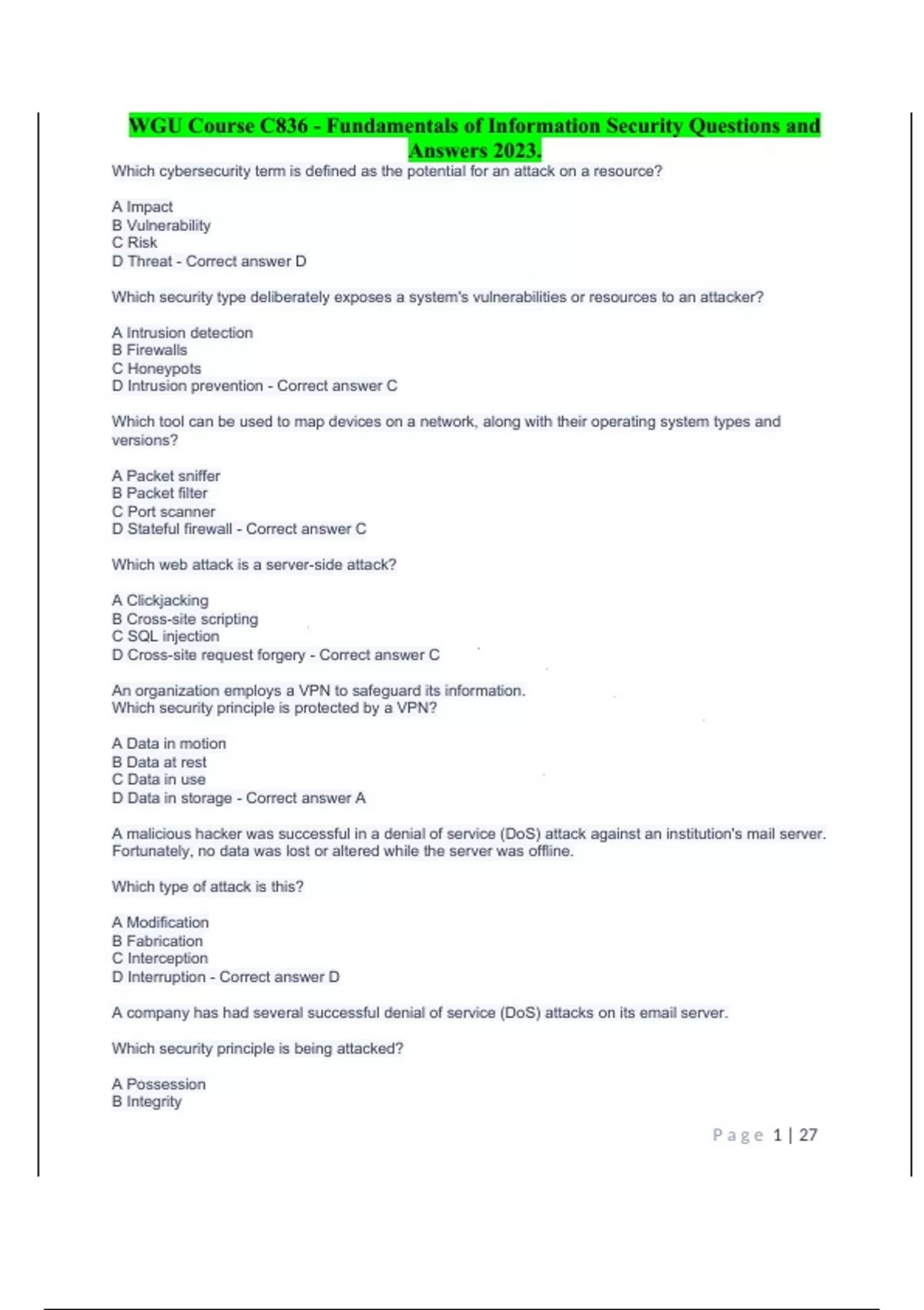 WGU Course C836 - Fundamentals of Information Security Questions and Answers 2023..WGU Course C836 - Fundamentals of Information Security Questions and Answers 2023..