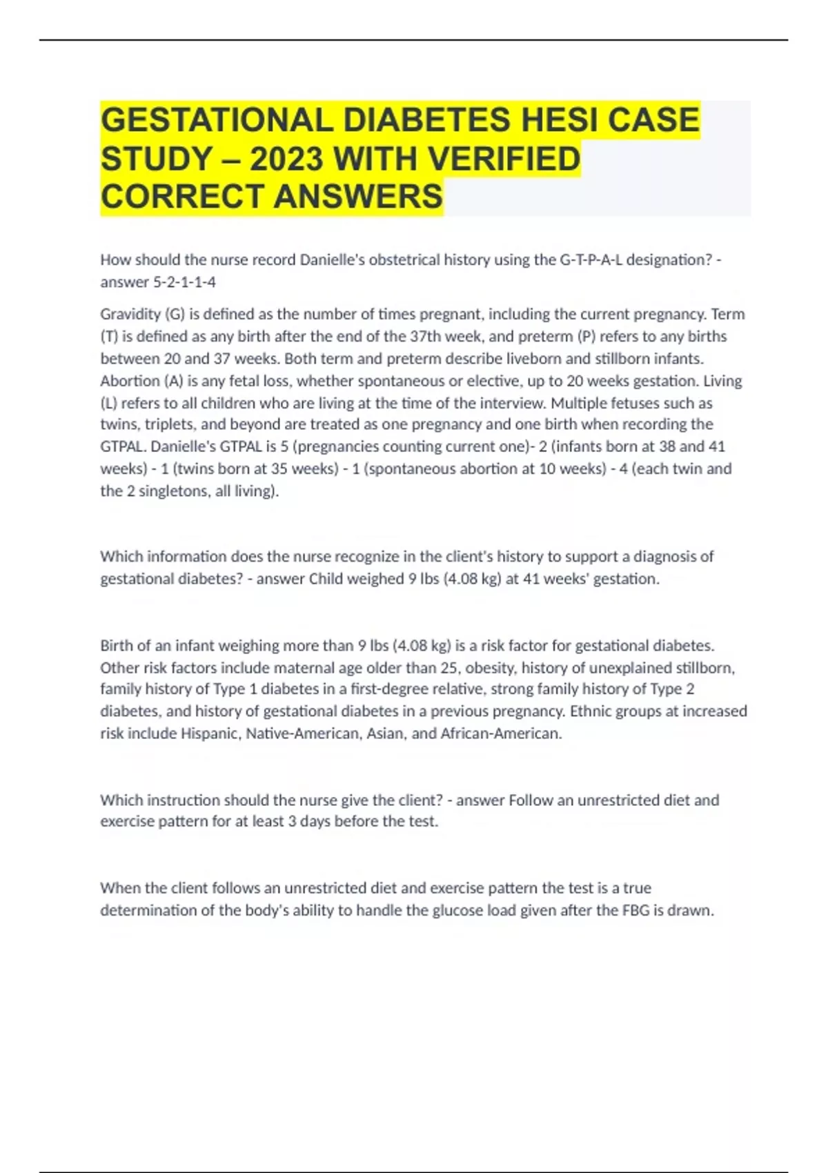GESTATIONAL DIABETES HESI CASE STUDY – 2023 WITH VERIFIED CORRECT ANSWERS.