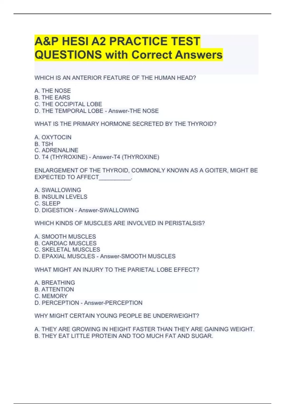 WHICH IS AN ANTERIOR FEATURE OF THE HUMAN HEAD? A. THE NOSE B. THE EARS C. THE OCCIPITAL LOBE D. THE TEMPORAL LOBE - Answer-THE NOSE WHAT IS THE PRIMARY HORMONE SECRETED BY THE THYROID? A. OXYTOCIN B. TSH C. ADRENALINE D. T4 (THYROXINE) - Answer-T4 (THYROXINE) ENLARGEMENT OF THE THYROID, COMMONLY KNOWN AS A GOITER, MIGHT BE EXPECTED TO AFFECT__________. A. SWALLOWING B. INSULIN LEVELS C. SLEEP D. DIGESTION - Answer-SWALLOWING WHICH KINDS OF MUSCLES ARE INVOLVED IN PERISTALSIS? A. SMOOTH MUSCLES B. CARDIAC MUSCLES C. SKELETAL MUSCLES D. EPAXIAL MUSCLES - Answer-SMOOTH MUSCLES WHAT MIGHT AN INJURY TO THE PARIETAL LOBE EFFECT? A. BREATHING B. ATTENTION C. MEMORY D. PERCEPTION - Answer-PERCEPTION WHY MIGHT CERTAIN YOUNG PEOPLE BE UNDERWEIGHT? A. THEY ARE GROWING IN HEIGHT FASTER THAN THEY ARE GAINING WEIGHT. B. THEY EAT LITTLE PROTEIN AND TOO MUCH FAT AND SUGAR. C. THEY EAT SEVERAL MEALS A DAY AND FAIL TO EXERCISE ENOUGH. D. THEY SELDOM EAT A MEAL THAT CONTAINS FOODS FROM ALL FOOD GROUPS. - Answer-THEY ARE GROWING IN HEIGHT FASTER THAN THEY ARE GAINING WEIGHT. HOW DOES THE DIGESTIVE SYSTEM WORK WITH THE URINARY SYSTEM? A. THE DIGESTIVE SYSTEM CONTROLS THE FUNCTIONS OF THE URETER. B. THE URINARY SYSTEM REMOVES TOXINS FROM THE PRODUCTS OF URINATION. C. THE DIGESTIVE SYSTEM MANUFACTURES HORMONES THAT INFLUENCE URINATION. D. THE URINARY SYSTEM ELIMINATES SOME WASTE PRODUCTS OF DIGESTION. - Answer-THE URINARY SYSTEM ELIMINATES SOME WASTE PRODUCTS OF DIGESTION. WHICH GLAND IS LOCATED SUPERIOR TO THE KIDNEY? A. PITUITARY B. ADRENAL C. HYPOTHALAMUS D. PANCREAS - Answer-ADRENAL TO WHAT TWO SYSTEMS MIGHT THE URETHRA BELONG? A. REPRODUCTIVE AND ENDOCRINE B. URINARY AND REPRODUCTIVE C. ENDOCRINE AND URINARY D. DIGESTIVE AND CARDIOVASCULAR - Answer-URINARY AND REPRODUCTIVE THE AXIAL SKELETAL SYSTEM CONTAINS ALL OF THESE EXCEPT_______________.