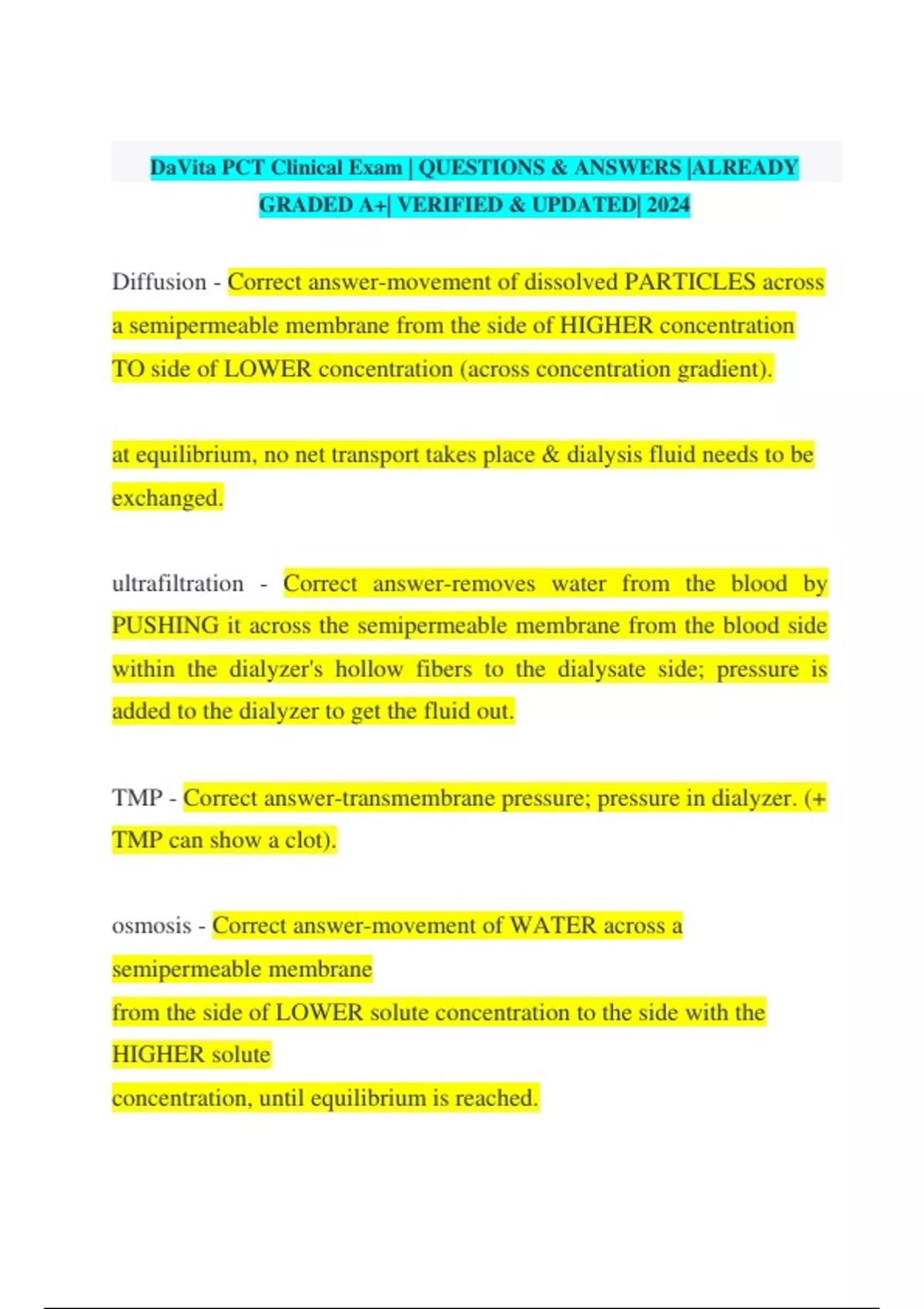 DaVita PCT Clinical Exam | QUESTIONS & ANSWERS |ALREADY GRADED A+| VERIFIED & UPDATED| 2024 Diffusion - Correct answer-movement of dissolved PARTICLES across a semipermeable membrane from the side of HIGHER concentration TO side of LOWER concentration (across concentration gradient). at equilibrium, no net transport takes place & dialysis fluid needs to be exchanged. ultrafiltration - Correct answer-removes water from the blood by PUSHING it across the semipermeable membrane from the blood side within the dialyzer's hollow fibers to the dialysate side; pressure is added to the dialyzer to get the fluid out. TMP - Correct answer-transmembrane pressure; pressure in dialyzer. (+ TMP can show a clot). osmosis - Correct answer-movement of WATER across a semipermeable membrane from the side of LOWER solute concentration to the side with the HIGHER solute concentration, until equilibrium is reached