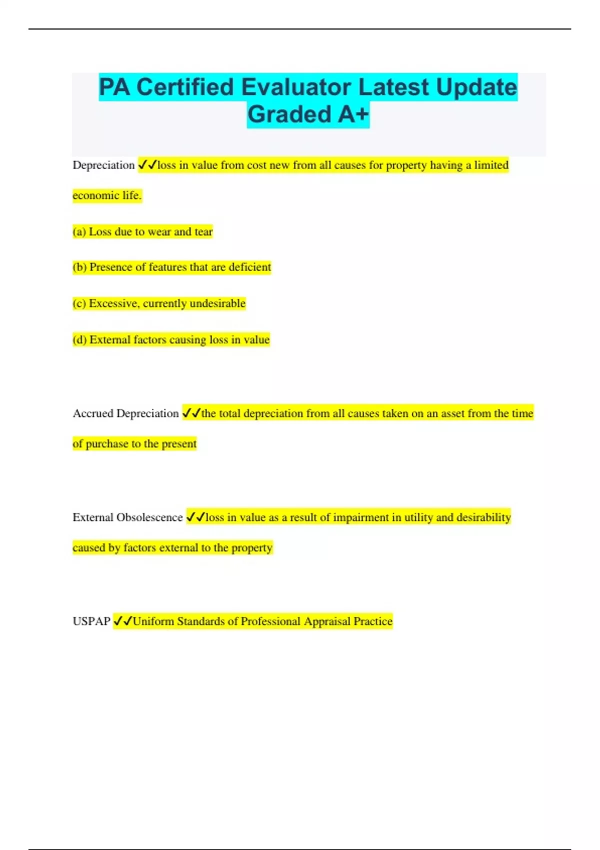 PA Certified Evaluator Latest Update Graded A+ Depreciation loss in value from cost new from all causes for property having a limited economic life. (a) Loss due to wear and tear (b) Presence of features that are deficient (c) Excessive, currently undesirable (d) External factors causing loss in value Accrued Depreciation the total depreciation from all causes taken on an asset from the time of purchase to the present External Obsolescence loss in value as a result of impairment in utility and desirability caused by factors external to the property USPAP Uniform Standards of Professional Appraisal Practice Intangible Property nonphysical assets, including but not limited to franchises, trademarks, patents, copyrights. (something we can't see) Market Value A type of value, stated as an opinion, that presumes the transfer of a property. Ethics Rule: An appraiser must promote and preserve the public trust inherent in appraisal practice by observing the highest standards of professional ethics. An appraiser must: perform assignments with impartiality, objectivity, and independence, and without accommodation of personal interests. How many years must an appraiser retain a work file? a period of at least 5 years after preparation, or at least 2 years after the final disposition. An appraiser must be.... competent to perform the assignment, acquire the necessary competency to perform the assignment, or decline or withdraw from the assignment. Apex on the street 35% Apex in the rear 65% An assessor is responsible for himself, tax payer, and taxing authorities Base Year the year in which property values are based. Predetermined Ratio A percentage of the base year value, set by the county commissioners to calculate taxes Assessed Value: Total value of base year less predetermined ratio. Taxable Assessed Value Total value of base year less predetermined ration What are the 4 agents of production Labor, Management Coordination, Capitol, Land S.L.U.G.E.R. Right to sell, Right to lease, right to use, right to give away, right to give away, right to enter and exit, right to refuse to do anything with. P.E.G.S Physical, Location, Location, Location Economic Governmental/Legal Social March 17, 1987 The Assessors Cert. Act requires that all persons responsible for the valuation of real property to be certified by the State Board of Certified Real Estate Appraisers. (THIS ACT SHALL NOT APPLY TO COUNTIES OF THE FIRST CLASS (PHILADELPHIA COUNTIES) Once certified an assessor must be re-certified every.. 2 years To become re-certified, the assessor must accumulate 28hrs of continuing education credits. (7hrs of USPAP) 2hrs on the assessors certification law. Act 28 1992. The AAP was founded in: 1949 Preamble: Certified PA Evaluators shall comply with Act 28 1992 The assessor and his staff should always consider themselves.. "Good Will" ambassadors Where can the PA statutes regarding assessments and taxation be found? Title 53 Pa. Purdons Sections Real Estate: The physical land and everything attached to it Real Property: Sum of the intangible rights in lands and improvements to land. It refers to the interest, benefits, and rights inherent in the ownership of physical real estate. Personal Property Moveable items not permanently affixed to, or part of, the real estate. Common Level Ratio: The ratio of the current existing assessments to the current validated sale price of properties that have sold. Set by S.T.E.B.(State Tax Equalization Board) before July 1st. (IF THE QUESTION IS "ON OR BEFORE?" Correct answer would be June 30th.) March 1st The last day to apply for the Homestead/Farmstead exclusion(ONLY THE BUILDING) June 1st Last day to apply for the Clean and Green program for the next tax year. July 1st Public notice must be given tax rolls open for public inspection STEB must certify to all assessment offices their CLR'S September 1st Last day to appeal and annual assessment; August 1st if the county has passed a resolution changing the date. October 31st All appeals must be heard and decided November 15th All notice of appeal decisions must be mailed. (Assessors Certification date.) Any aggrieved party has ________ days from the date of the notice to appeal to the ______________. 30 days; Court of common pleas of PA Once the court of common pleas has ruled, any aggrieved party has______ days to appeal to the _____________. 30 days; Commonwealth Court of PA Once the Commonwealth Court of PA rules any aggrieved party has_______ days to appeal to the____________. 30 days; Superior Court of PA The taxpayer trusts and expects the assessor to ___________ and __________ administer assessments. Uniformly and Equitably The assessment function involves__________, _________ and _____________property discovery, listing and valuing. Value The present worth of future benefits arising from the ownership of real property Cost The sacrifice made in terms of money, time or labor to acquire property Price The quantity of one thing which is exchanged for another; the amount of money paid, asked or offered where sale is contemplated. (Sets the upper limit)
