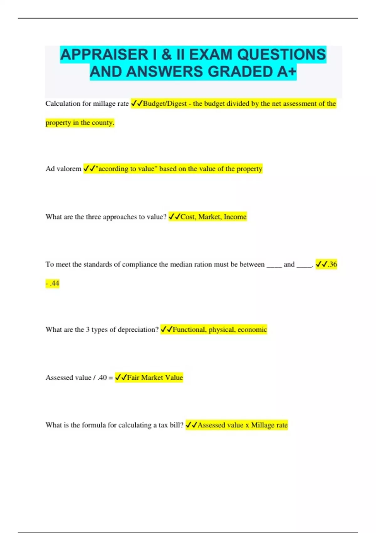 APPRAISER I & II EXAM QUESTIONS AND ANSWERS GRADED A+