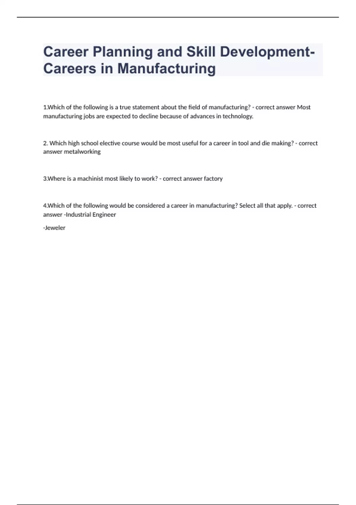 Career Planning and Skill Development-Careers in Manufacturing1.Which of the following is a true statement about the field of manufacturing? - correct answer Most manufacturing jobs are expected to decline because of advances in technology. 2. Which high school elective course would be most useful for a career in tool and die making? - correct answer metalworking 3.Where is a machinist most likely to work? - correct answer factory 4.Which of the following would be considered a career in manufacturing? Select all that apply. - correct answer -Industrial Engineer -Jeweler