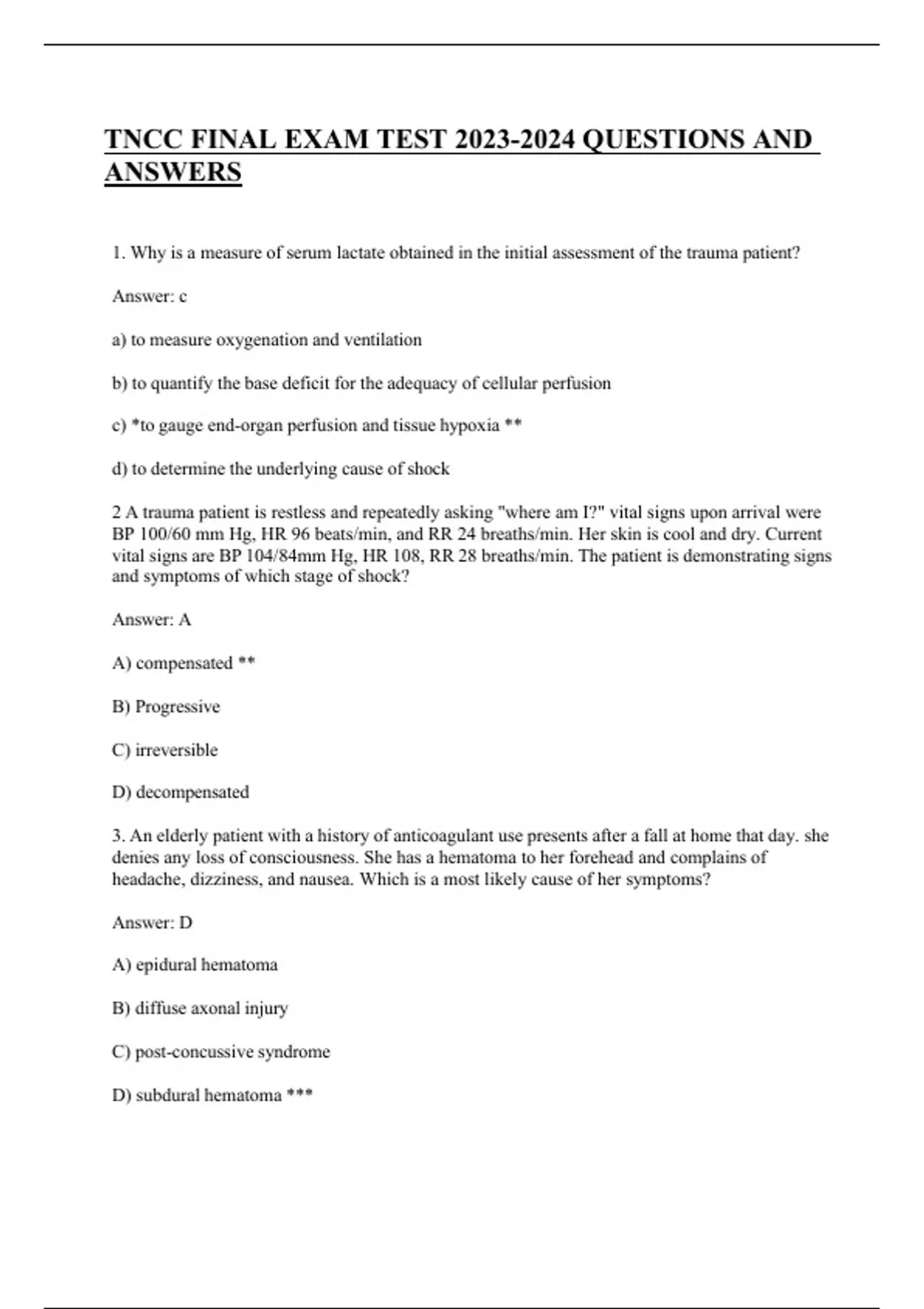 TNCC FINAL EXAM TEST QUESTIONS AND ANSWERS 1.Why is a measure of serum lactate obtained in the initial assessment of the trauma patient? Answer: c a)to measure oxygenation and ventilation b)to quantify the base deficit for the adequacy of cellular perfusion c)*to gauge end-organ perfusion and tissue hypoxia ** d)to determine the underlying cause of shock 2 A trauma patient is restless and repeatedly asking "where am I?" vital signs upon arrival were BP 100/60 mm Hg, HR 96 beats/min, and RR 24 breaths/min. Her skin is cool and dry. Current vital signs are BP 104/84mm Hg, HR 108, RR 28 breaths/min. The patient is demonstrating signs and symptoms of which stage of shock? Answer: A A)compensated ** B)Progressive C)irreversible D)decompensated
