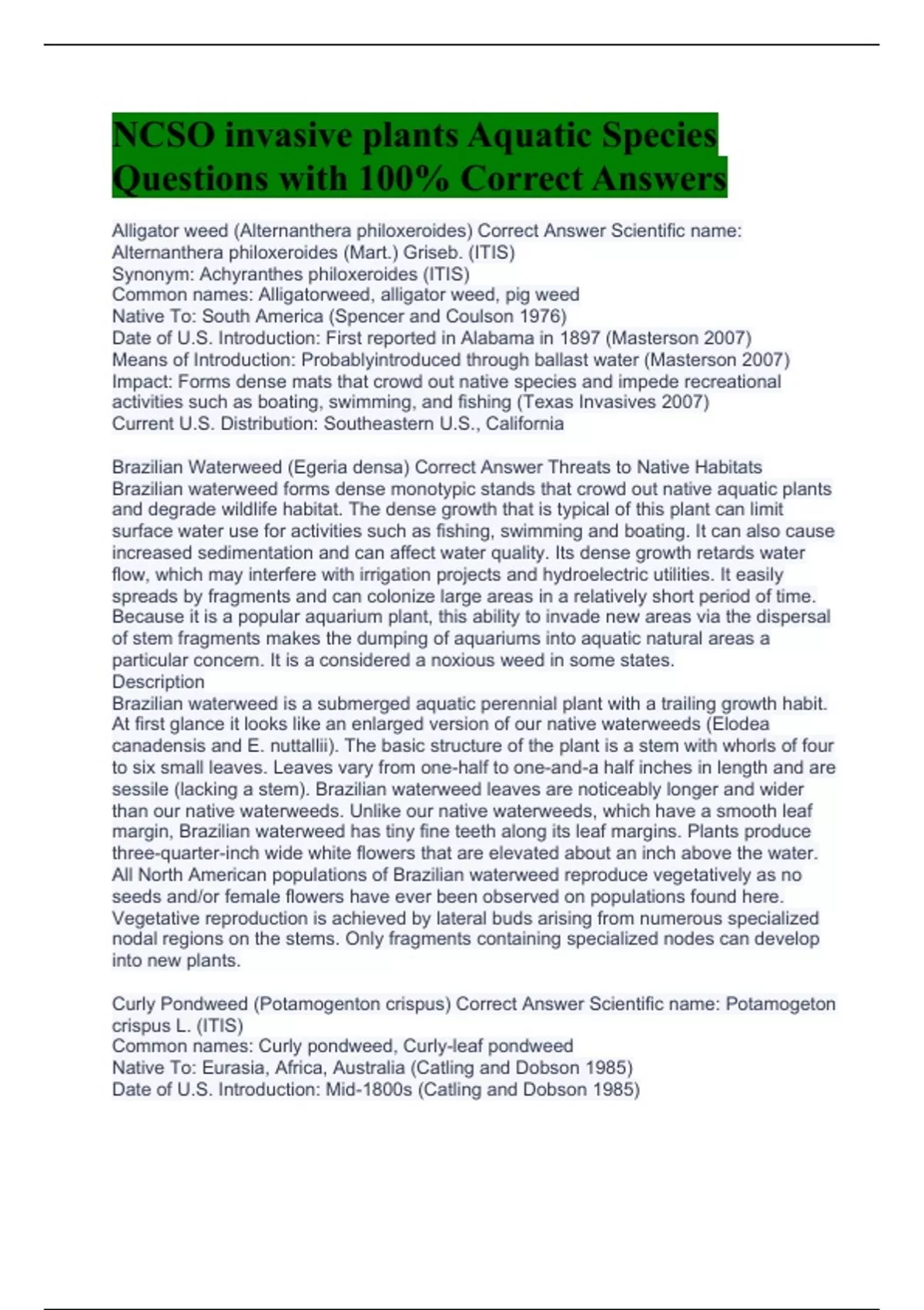 Alligator weed (Alternanthera philoxeroides) Correct Answer Scientific name: Alternanthera philoxeroides (Mart.) Griseb. (ITIS) Synonym: Achyranthes philoxeroides (ITIS) Common names: Alligatorweed, alligator weed, pig weed Native To: South America (Spencer and Coulson 1976) Date of U.S. Introduction: First reported in Alabama in 1897 (Masterson 2007) Means of Introduction: Probablyintroduced through ballast water (Masterson 2007) Impact: Forms dense mats that crowd out native species and impede recreational activities such as boating, swimming, and fishing (Texas Invasives 2007) Current U.S. Distribution: Southeastern U.S., California Brazilian Waterweed (Egeria densa) Correct Answer Threats to Native Habitats Brazilian waterweed forms dense monotypic stands that crowd out native aquatic plants and degrade wildlife habitat. The dense growth that is typical of this plant can limit surface water use for activities such as fishing, swimming and boating. It can also cause increased sedimentation and can affect water quality. Its dense growth retards water flow, which may interfere with irrigation projects and hydroelectric utilities. It easily spreads by fragments and can colonize large areas in a relatively short period of time. Because it is a popular aquarium plant, this ability to invade new areas via the dispersal of stem fragments makes the dumping of aquariums into aquatic natural areas a particular concern. It is a considered a noxious weed in some states. Description Brazilian waterweed is a submerged aquatic perennial plant with a trailing growth habit. At first glance it looks like an enlarged version of our native waterweeds (Elodea canadensis and E. nuttallii). The basic structure of the plant is a stem with whorls of four to six small leaves. Leaves vary from one-half to one-and-a half inches in length and are sessile (lacking a stem). Brazilian waterweed leaves are noticeably longer and wider than our native waterweeds. Unlike our native waterweeds, which have a smooth leaf margin, Brazilian waterweed has tiny fine teeth along its leaf margins. Plants produce three-quarter-inch wide white flowers that are elevated about an inch above the water. All North American populations of Brazilian waterweed reproduce vegetatively as no seeds and/or female flowers have ever been observed on populations found here. Vegetative reproduction is achieved by lateral buds arising from numerous specialized nodal regions on the stems. Only fragments containing specialized nodes can develop into new plants. Curly Pondweed (Potamogenton crispus) Correct Answer Scientific name: Potamogeton crispus L. (ITIS) Common names: Curly pondweed, Curly-leaf pondweed Native To: Eurasia, Africa, Australia (Catling and Dobson 1985) Date of U.S. Introduction: Mid-1800s (Catling and Dobson 1985)