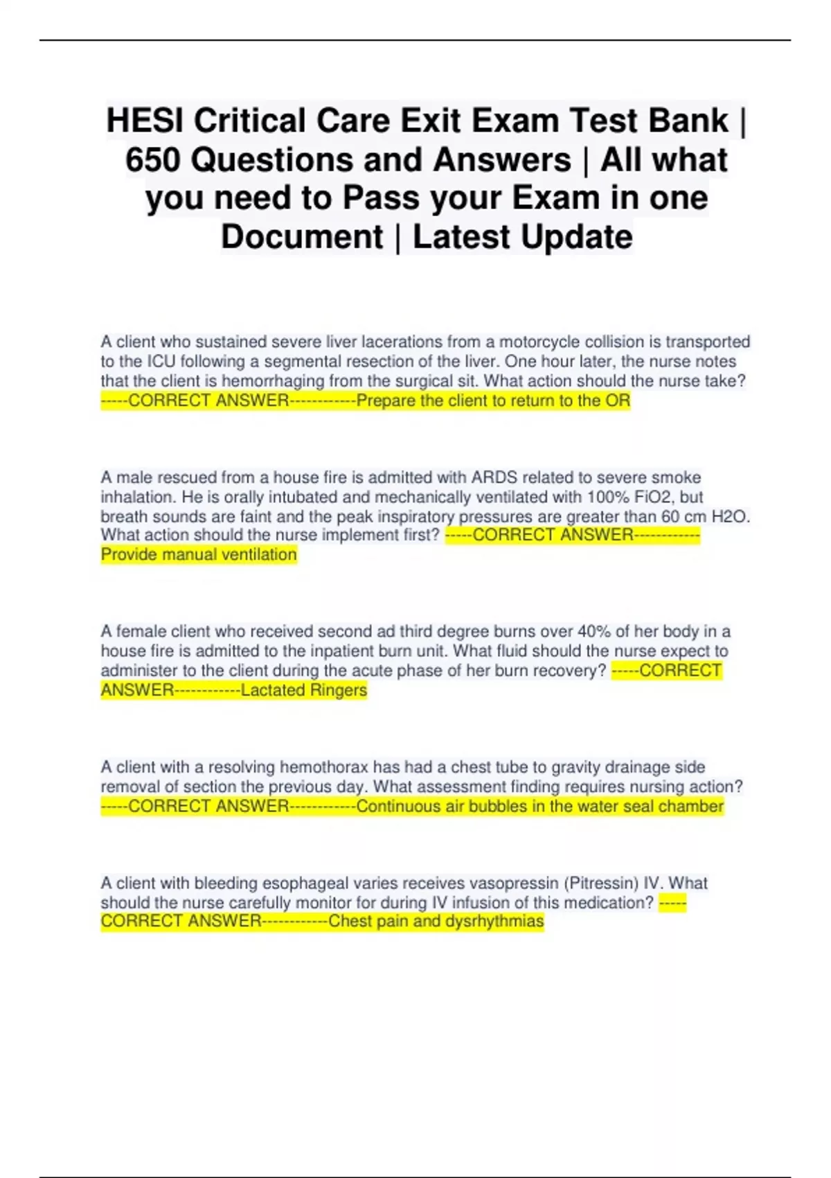 HESI Critical Care Exit Exam Test Bank | 650 Questions and Answers | All what you need to Pass your Exam in one Document | Latest Update