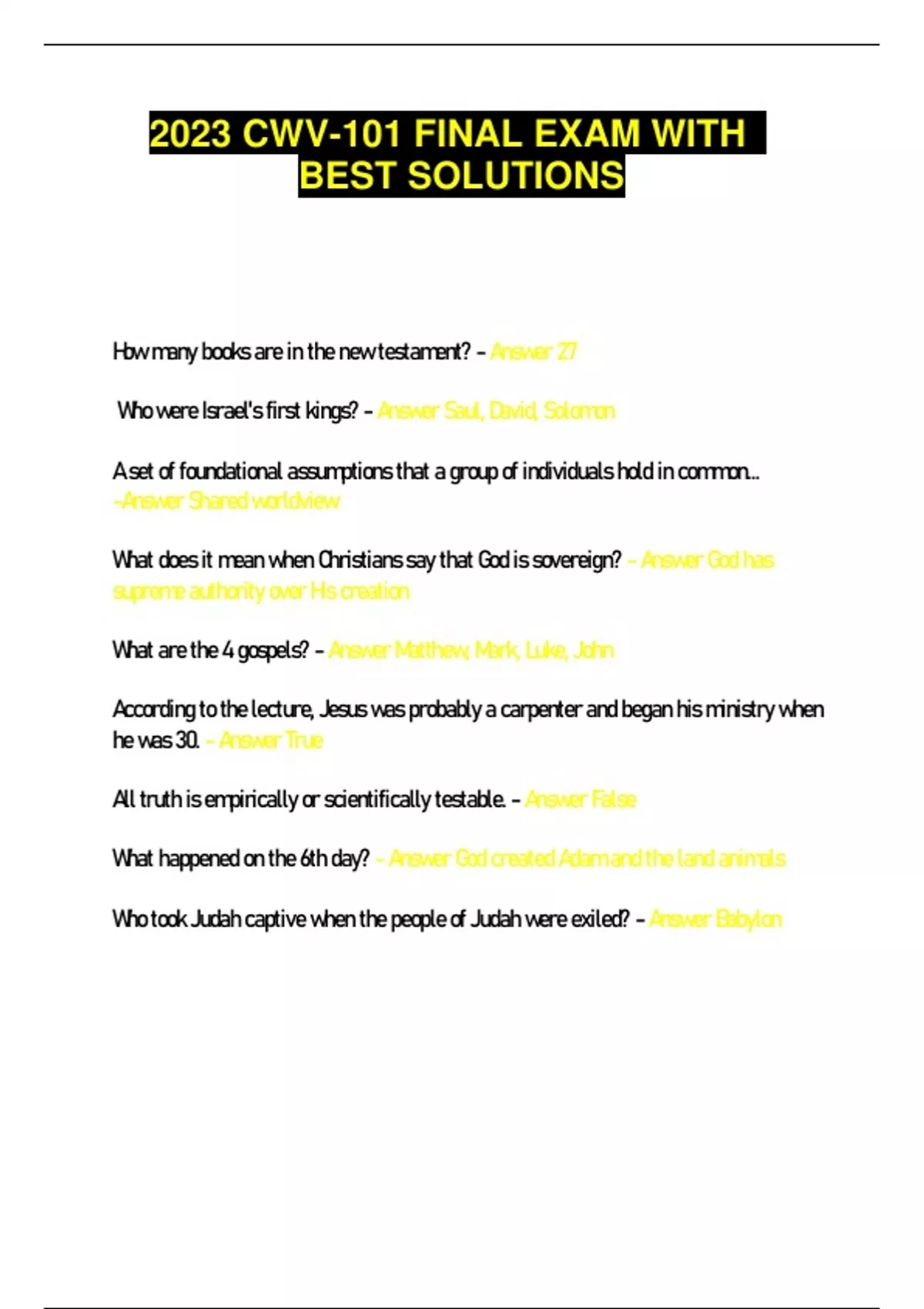 2023 CWV-101 FINAL EXAM WITH BEST SOLUTIONS How many books are in the new testament? - Answer 27 Who were Israel's first kings? - Answer Saul, David, Solomon A set of foundational assumptions that a group of individuals hold in common... -Answer Shared worldview What does it mean when Christians say that God is sovereign? - Answer God has supreme authority over His creation What arethe 4 gospels? - Answer Matthew, Mark, Luke, John According to thelecture, Jesus was probably a carpenter and began his ministry when he was 30. - Answer True All truth isempirically or scientifically testable. - Answer False What happened on the 6th day? - Answer God created Adam and the land animals Whotook Judah captive when the people of Judah were exiled? - Answer Babylon A solemn agreement between two parties in which both parties swear an oath to keepan oath... - Answer Covenant The concept of the trinity states that the father, son, and holy spirit are.... - Answer one God, three persons Why were people able to substantiate the resurrection? - Answer Eyewitness was stillalive When one professes Christ as savior, they are immediately granted eternal life... -Answer True The pronouncement of the forgiveness of our sins by Jesus Christ is called the incarnation... - Answer False, the incarnation is when God put on human flesh What arethe3 worldview tests? - Answer There are none. Which of thefollowing best describes the primary ministry of the Old Testament prophets? - Answer They pronounced judgements against Israel According to Isaiah 59:1-2... - Answer Our sins separate us from GodEvaluates a worldviews livability... - Answer Practical test What arethe 4 basic worldviews? - Answer Atheism, Pantheism, Theism, Deism A defenseof God's goodness and power despitethe presence of evil and suffering in the world... - Answer Theodicy Internalconsistency of a worldview to seeif one's specific values and beliefs contradict? - Answer Coherence Who is not mentioned in Genesis? - Answer MosesThe