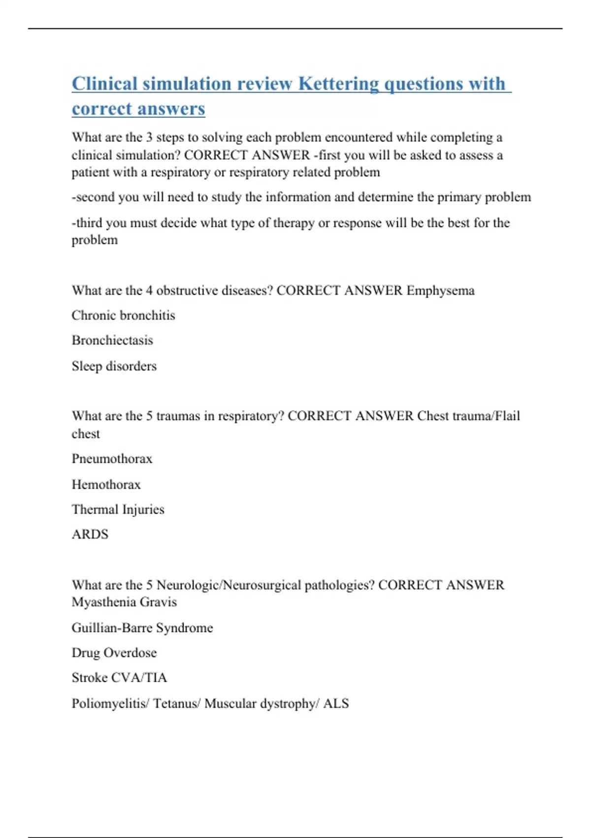 What are the 3 steps to solving each problem encountered while completing a clinical simulation? CORRECT ANSWER -first you will be asked to assess a patient with a respiratory or respiratory related problem -second you will need to study the information and determine the primary problem -third you must decide what type of therapy or response will be the best for the problem What are the 4 obstructive diseases? CORRECT ANSWER Emphysema Chronic bronchitis Bronchiectasis Sleep disorders What are the 5 traumas in respiratory? CORRECT ANSWER Chest trauma/Flail chest Pneumothorax Hemothorax Thermal Injuries ARDS What are the 5 Neurologic/Neurosurgical pathologies? CORRECT ANSWER Myasthenia Gravis Guillian-Barre Syndrome Drug Overdose Stroke CVA/TIA Poliomyelitis/ Tetanus/ Muscular dystrophy/