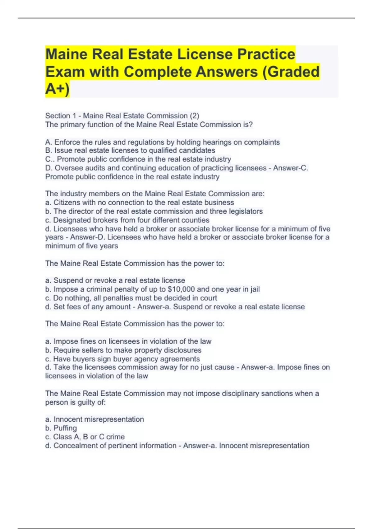 The Maine Real Estate Commission has the power to: a. Suspend or revoke a real estate license b. Impose a criminal penalty of up to $10,000 and one year in jail c. Do nothing, all penalties must be decided in court d. Set fees of any amount - Answer-a. Suspend or revoke a real estate license The Maine Real Estate Commission has the power to: a. Impose fines on licensees in violation of the law b. Require sellers to make property disclosures c. Have buyers sign buyer agency agreements d. Take the licensees commission away for no just cause - Answer-a. Impose fines on licensees in violation of the law The Maine Real Estate Commission may not impose disciplinary sanctions when a person is guilty of: a. Innocent misrepresentation b. Puffing c. Class A, B or C crime d. Concealment of pertinent information - Answer-a. Innocent misrepresentation Iris Clover has been an active Associate Broker licensee in Maine for nine years. She may a. Open her own real estate brokerage company b. Serve on the Maine Real Estate Commission as an industry member c. Not apply for the broker license for 1 more year d. Not provide a broker price opinion for a bank - Answer-b. Serve on the Maine Real Estate Commission as an industry member The Maine Real Estate Commission has how many members? a. 4 b. 6 c. 5 d. 7 - Answer-B. 6 The Maine Real Estate Commission has how many industry members? a. 2 b. 4 c. 6 d. 8 - Answer-B. 4 A licensee may lose their license for conduct which shows a. Dishonesty b. Dealing in bad faith c. Incompetency d. All of the above - Answer-D. All of the above. Dishonest, dealing in bad faith, incompetency Leo Allster is a licensee who was convicted of embezzlement of funds from his Designated Broker. Leo must a. Report his conviction to the Maine Real Estate Commission within ten days b. Surrender his real estate license immediately c. Pay a $2,000 fine to the Maine Real Estate Commission d. Secure independent errors and omissions insurance to continue to practice in Maine - Answer-a. Report his conviction to the Maine Real Estate Commission within ten days Which of the following is not a function of the Maine Real Estate Commission? a. Determine the type of agency relationships that a company will practice b. Conduct hearings c. Establish the fees it will charge d. Adopt rules governing the practice of real