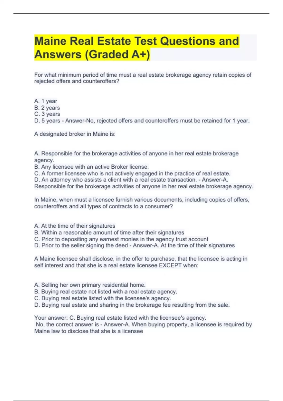 A. Responsible for the brokerage activities of anyone in her real estate brokerage agency. B. Any licensee with an active Broker license. C. A former licensee who is not actively engaged in the practice of real estate. D. An attorney who assists a client with a real estate transaction. - Answer-A. Responsible for the brokerage activities of anyone in her real estate brokerage agency. In Maine, when must a licensee furnish various documents, including copies of offers, counteroffers and all types of contracts to a consumer? A. At the time of their signatures B. Within a reasonable amount of time after their signatures C. Prior to depositing any earnest monies in the agency trust account D. Prior to the seller signing the deed - Answer-A. At the time of their signatures A Maine licensee shall disclose, in the offer to purchase, that the licensee is acting in self interest and that she is a real estate licensee EXCEPT when: A. Selling her own primary residential home. B. Buying real estate not listed with a real estate agency. C. Buying real estate listed with the licensee's agency. D. Buying real estate and sharing in the brokerage fee resulting from the sale. Your answer: C. Buying real estate listed with the licensee's agency. No, the correct answer is - Answer-A. When buying property, a licensee is required by Maine law to disclose that she is a licensee In Maine, a licensee is NOT required to provide a copy of the Real Estate Brokerage Relationships Form to a prospective buyer or seller: A. For a property with less than 1 or more than 4 residential dwelling units. B. If the licensee is acting solely as a principal, not as an agent for another. C. When the written communication from the licensee is a solicitation of business. D. All of the above. Your answer: . Yes, this is the correct answer as answers A, B and C are all correct. - Answer-D. All of the above