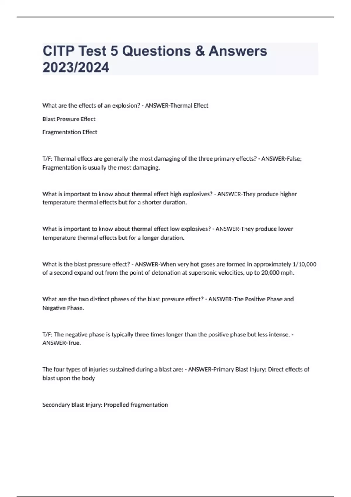 CITP Test 5 Questions & Answers 2023/2024 What are the effects of an explosion? - ANSWER-Thermal Effect Blast Pressure Effect Fragmentation Effect T/F: Thermal effecs are generally the most damaging of the three primary effects? - ANSWER-False; Fragmentation is usually the most damaging. What is important to know about thermal effect high explosives? - ANSWER-They produce higher temperature thermal effects but for a shorter duration. What is important to know about thermal effect low explosives? - ANSWER-They produce lower temperature thermal effects but for a longer duration. What is the blast pressure effect? - ANSWER-When very hot gases are formed in approximately 1/10,000 of a second expand out from the point of detonation at supersonic velocities, up to 20,000 mph. What are the two distinct phases of the blast pressure effect? - ANSWER-The Positive Phase and Negative Phase. T/F: The negative phase is typically three times longer than the positive phase but less intense. - ANSWER-True. The four types of injuries sustained during a blast are: - ANSWER-Primary Blast Injury: Direct effects of blast upon the body Secondary Blast Injury: Propelled fragmentation