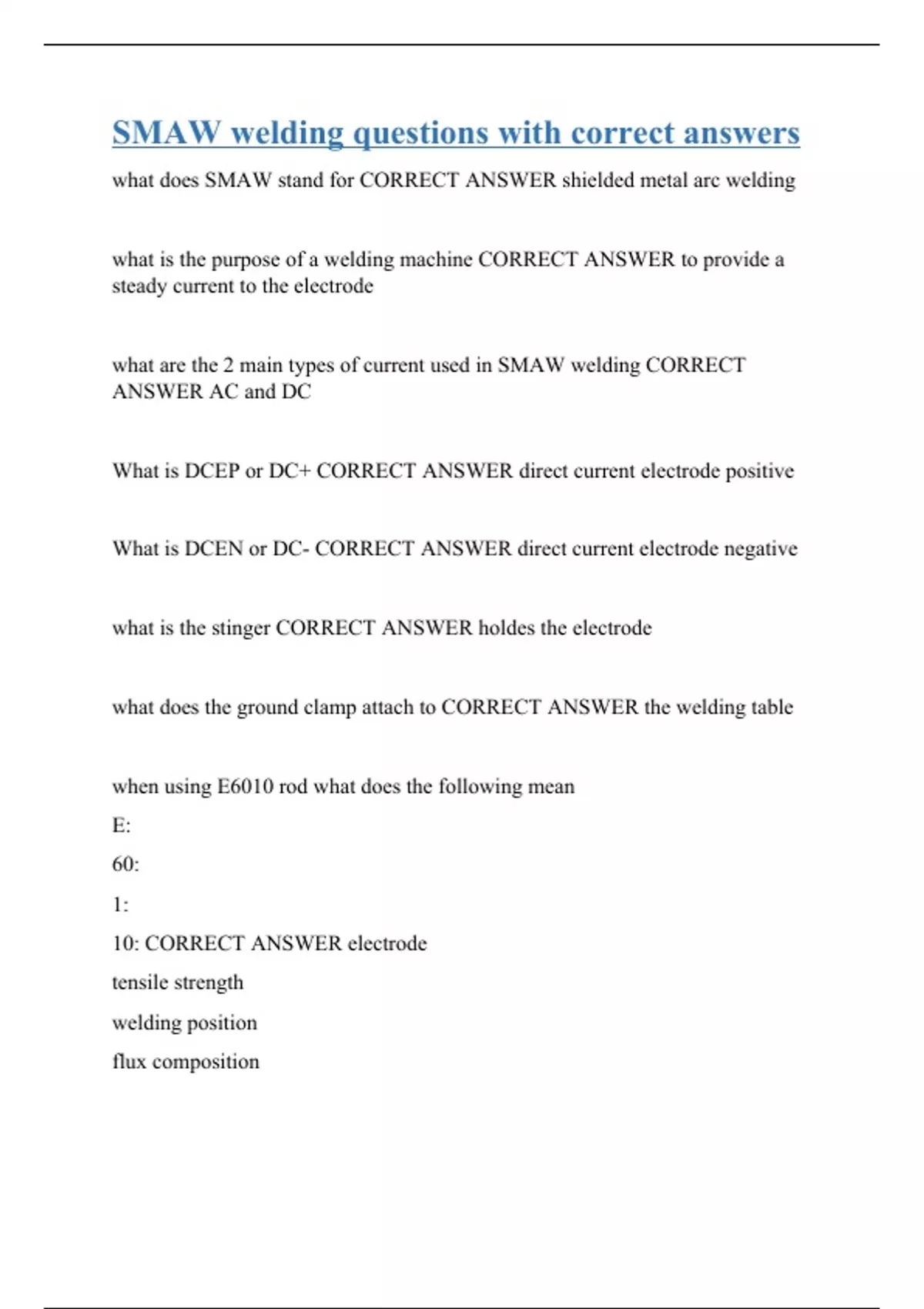 what does SMAW stand for CORRECT ANSWER shielded metal arc welding what is the purpose of a welding machine CORRECT ANSWER to provide a steady current to the electrode what are the 2 main types of current used in SMAW welding CORRECT ANSWER AC and DC What is DCEP or DC+ CORRECT ANSWER direct current electrode positive What is DCEN or DC- CORRECT ANSWER direct current electrode negative what is the stinger CORRECT ANSWER holdes the electrode what does the ground clamp attach to CORRECT ANSWER the welding table when using E6010 rod what does the following mean E: 60: 1: 10: CORRECT ANSWER electrode tensile strength welding position flux composition