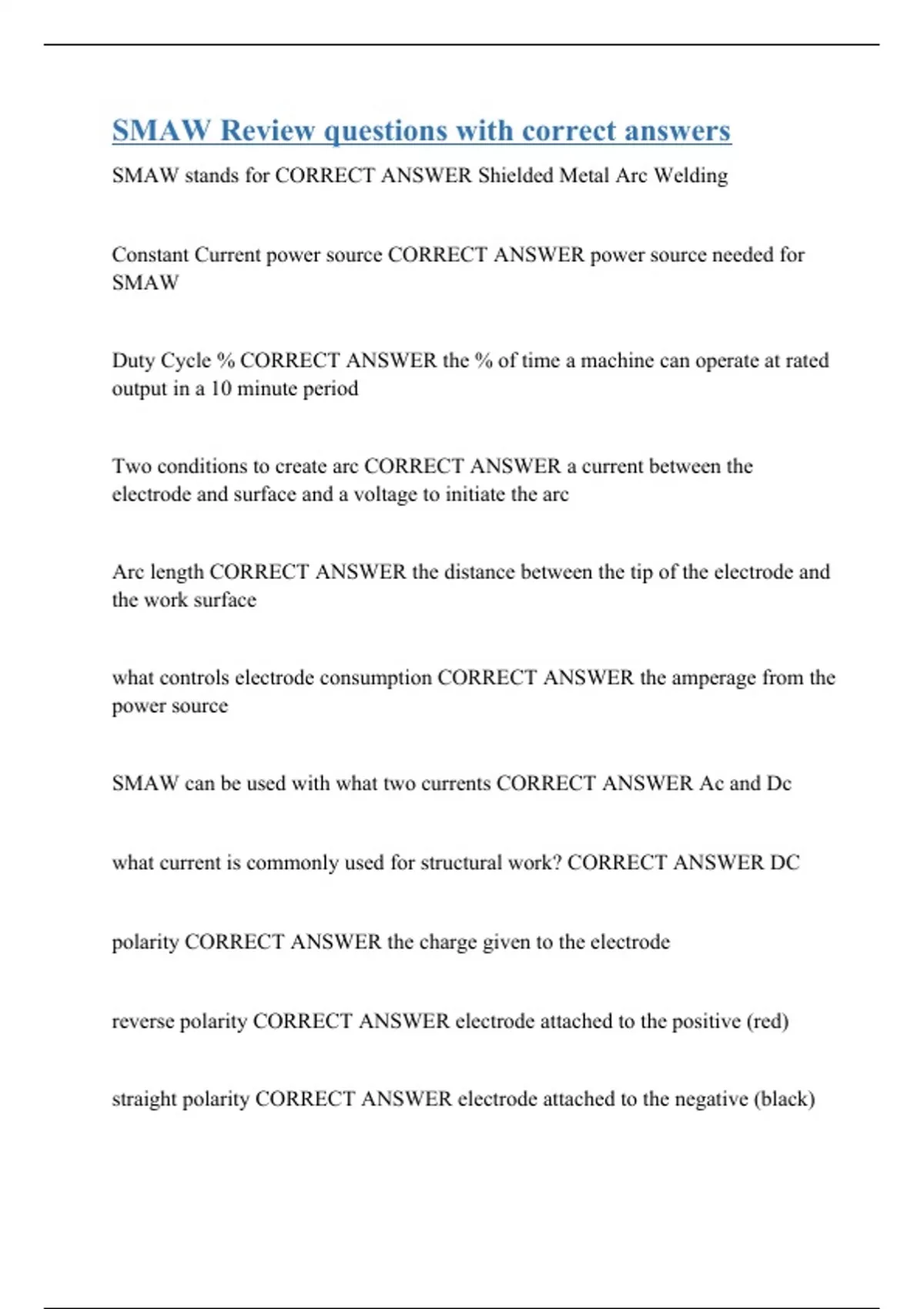 SMAW stands for CORRECT ANSWER Shielded Metal Arc Welding Constant Current power source CORRECT ANSWER power source needed for SMAW Duty Cycle % CORRECT ANSWER the % of time a machine can operate at rated output in a 10 minute period Two conditions to create arc CORRECT ANSWER a current between the electrode and surface and a voltage to initiate the arc Arc length CORRECT ANSWER the distance between the tip of the electrode and the work surface what controls electrode consumption CORRECT ANSWER the amperage from the power source SMAW can be used with what two currents CORRECT ANSWER Ac and Dc what current is commonly used for structural work? CORRECT ANSWER DC polarity CORRECT ANSWER the char