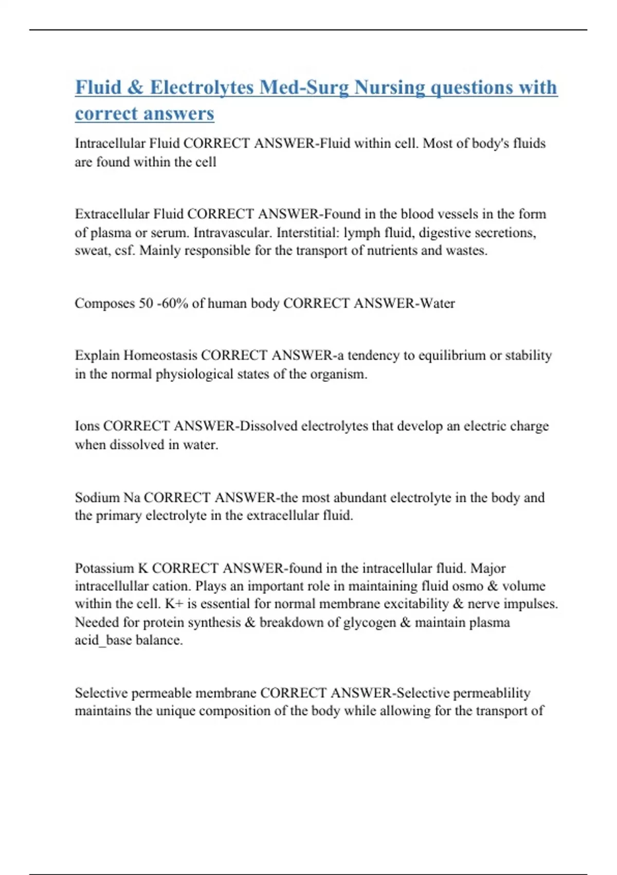 Intracellular Fluid CORRECT ANSWER-Fluid within cell. Most of body's fluids are found within the cell Extracellular Fluid CORRECT ANSWER-Found in the blood vessels in the form of plasma or serum. Intravascular. Interstitial: lymph fluid, digestive secretions, sweat, csf. Mainly responsible for the transport of nutrients and wastes. Composes 50 -60% of human body CORRECT ANSWER-Water Explain Homeostasis CORRECT ANSWER-a tendency to equilibrium or stability in the normal physiological states of the organism. Ions CORRECT ANSWER-Dissolved electrolytes that develop an electric charge when dissolved in water. Sodium Na CORRECT ANSWER-the most abundant electrolyte in the body and the primary electrolyte in the extracellular fluid. Potassium K CORRECT ANSWER-found in the intracellular fluid. Major intracellullar cation. Plays an important role in maintaining fluid osmo & volume within the cell. K+ is essential for normal membrane excitability & nerve impulses. Needed for protein synthesis & breakdown of glycogen & maintain plasma acid_base balance. Selective permeable membrane CORRECT ANSWER-Selective permeablility maintains the unique composition of the body