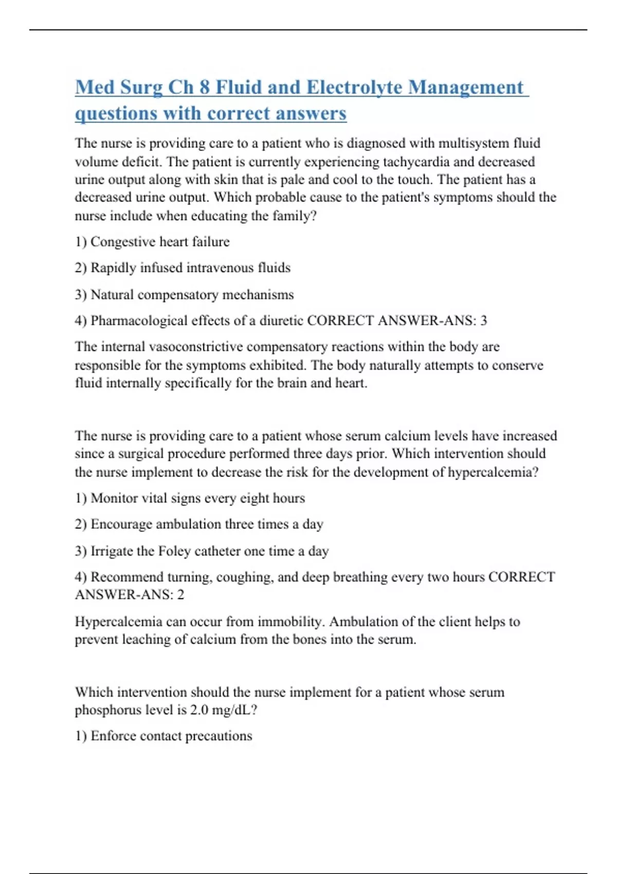 The nurse is providing care to a patient who is diagnosed with multisystem fluid volume deficit. The patient is currently experiencing tachycardia and decreased urine output along with skin that is pale and cool to the touch. The patient has a decreased urine output. Which probable cause to the patient's symptoms should the nurse include when educating the family? 1) Congestive heart failure 2) Rapidly infused intravenous fluids 3) Natural compensatory mechanisms 4) Pharmacological effects of a diuretic CORRECT ANSWER-ANS: 3 The internal vasoconstrictive compensatory reactions within the body are responsible for the symptoms exhibited. The body naturally attempts to conserve fluid internally specifically for the brain and heart. The nurse is providing care to a patient whose serum calcium levels have increased since a surgical procedure performed three days prior. Which intervention should the nurse implement to decrease the risk for the development of hypercalcemia? 1) Monitor vital signs every eight hours 2) Encourage ambulation three times a day 3) Irrigate the Foley catheter one time a day 4) Recommend turning, coughing, and deep breathing every two hours CORRECT ANSWER-ANS: 2 Hypercalcemia can occur from immobility. Ambulation of the client helps to prevent leaching of calcium from the bone