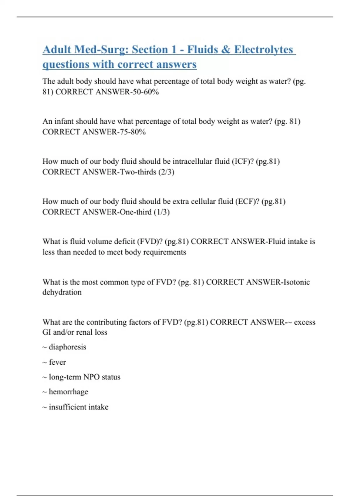The adult body should have what percentage of total body weight as water? (pg. 81) CORRECT ANSWER-50-60%