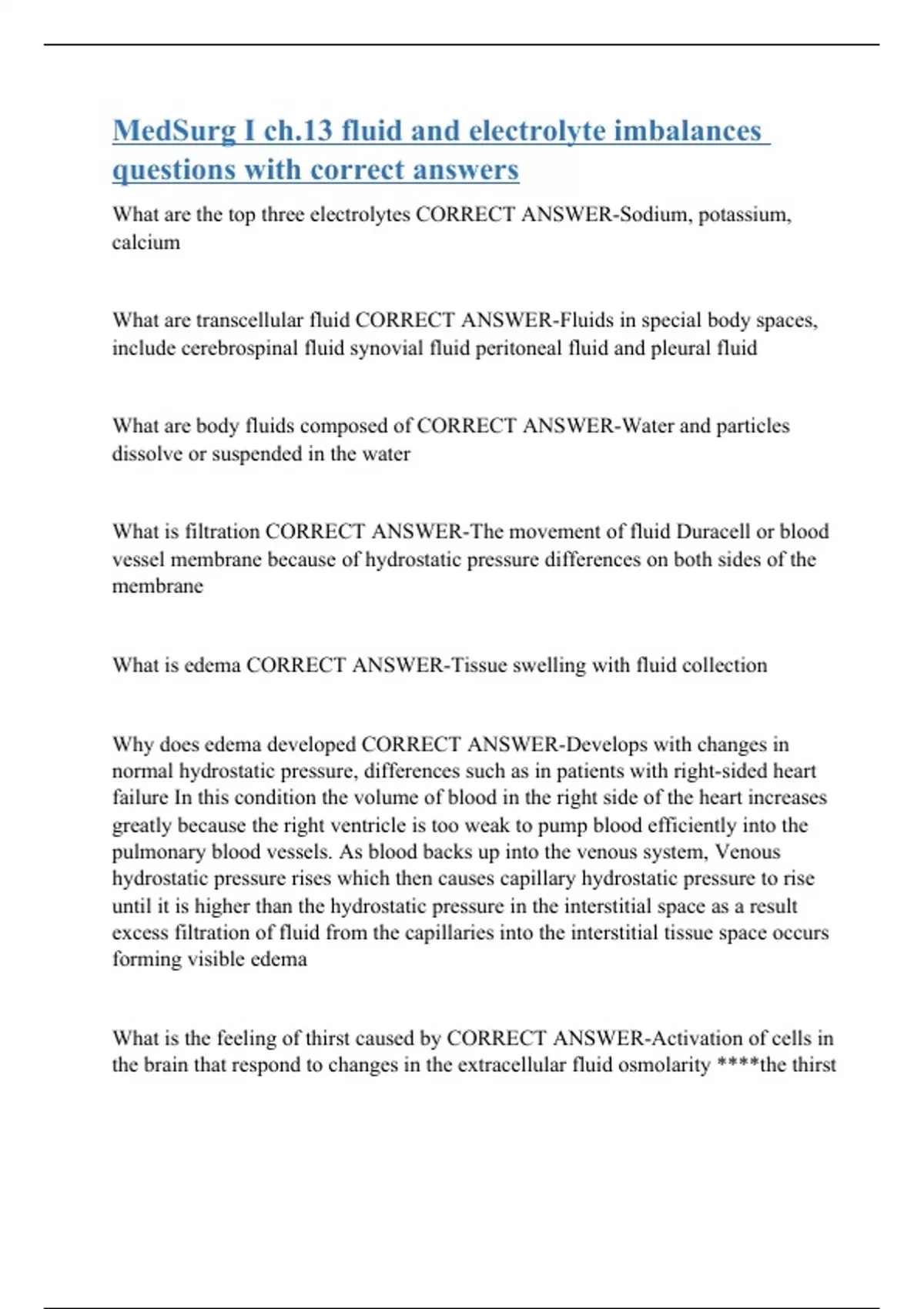 What are the top three electrolytes CORRECT ANSWER-Sodium, potassium, calcium What are transcellular fluid CORRECT ANSWER-Fluids in special body spaces, include cerebrospinal fluid synovial fluid peritoneal fluid and pleural fluid What are body fluids composed of CORRECT ANSWER-Water and particles dissolve or suspended in the water What is filtration CORRECT ANSWER-The movement of fluid Duracell or blood vessel membrane because of hydrostatic pressure differences on both sides of the membrane What is edema CORRECT ANSWER-Tissue swelling with fluid collection Why does edema developed CORRECT ANSWER-Develops with changes in normal hydrostatic pressure, differences such as in patients with right-sided heart failure In this condition the volume of blood in the right side of the heart increases greatly because the right ventricle is too weak to pump blood efficiently into the pulmonary blood vessels. As blood backs up into the venous system, Venous hydrostatic pressure rises which then causes capillary hydrostatic pressure to rise until it is higher than the hydrostatic pressure in t