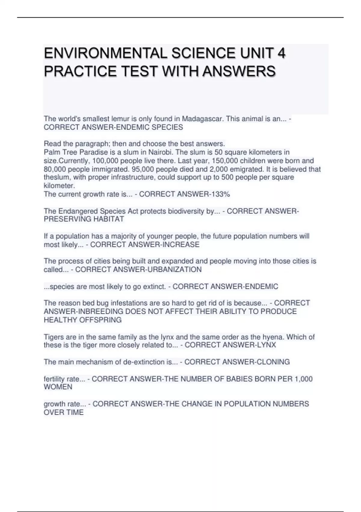 ENVIRONMENTAL SCIENCE UNIT 4 PRACTICE TEST WITH ANSWERS The world's smallest lemur is only found in Madagascar. This animal is an... - CORRECT ANSWER-ENDEMIC SPECIES Read the paragraph; then and choose the best answers. Palm Tree Paradise is a slum in Nairobi. The slum is 50 square kilometers in size.Currently, 100,000 people live there. Last year, 150,000 children were born and 80,000 people immigrated. 95,000 people died and 2,000 emigrated. It is believed that theslum, with proper infrastructure, could support up to 500 people per square kilometer. The current growth rate is... - CORRECT ANSWER-133% The Endangered Species Act protects biodiversity by... - CORRECT ANSWERPRESERVING HABITAT If a population has a majority of younger people, the future population numbers will most likely... - CORRECT ANSWER-INCREASE The process of cities being built and expanded and people moving into those cities is called... - CORRECT ANSWER-URBANIZATION ...species are most likely to go extinct. - CORRECT ANSWER-ENDEMIC The reason bed bug infestations are so hard to get rid of is because... - CORRECT ANSWER-INBREEDING DOES NOT AFFECT THEIR ABILITY TO PRODUCE HEALTHY OFFSPRING Tigers are in the same family as the lynx and the same order as the hyena. Which of these is the tiger more closely related to... - CORRECT ANSWER-LYNX The main mechanism of de-extinction is... - CORRECT ANSWER-CLONING fertility rate... - CORRECT ANSWER-THE NUMBER OF BABIES BORN PER 1,000 WOMEN growth rate... - CORRECT ANSWER-THE CHANGE IN POPULATION NUMBERS OVER TIME replacement level... - CORRECT ANSWER-THE NUMBEROF CHILDREN EACH WOMAN MUST HAVE IN ORDER FOR POPULATION LEVELS TO REMAIN THE SAME IN THE FUTURE total fertility rate... - CORRECT ANSWER-THE AVERAGE TOTAL NUMBER OF CHILDREN A WOMAN WILL HAVE IN HER LIFETIME IN A CERTAIN AREA Palm Tree Paradise is a slum in Nairobi. The slum is 50 square kilometers in size.Currently, 100,000 people live there. Last year, 150,000 children were born and 80,000 people immigrated. 95,000 people died and 2,000 emigrated. It is believed that the slum, with proper infrastructure, could support up to 500 people per square kilometer. The total carrying capacity of the slum is... - CORRECT ANSWER-25,000 PEOPLE Define conservation... - CORRECT ANSWER-THE PRESERVATION AND RESTORATION OF SOMETHING A group of closely related species is a... - CORRECT ANSWER-GENUS Invasive species cost the United States $138... every year. - CORRECT ANSWERBILLION Palm Tree Paradise is a slum in Nairobi. The slum is 50 square kilometers in size.Currently, 100,000 people live there. Last year, 150,000 children were born and 80,000 people immigrated. 95,000 people died and 2,000 emigrated. It is believed that theslum, with proper infrastructure, could support up to 500 people per square kilometer. The current population density is... - CORRECT ANSWER-2,000 PEOPLE/SQ KM Define biodiversity... - CORRECT ANSWER-THE NUMBERS AND VARIETY OF DIFFERENT SPECIES IN A GIVEN AREA Kikuyu grass has a long photosynthetic period and is most likely to be an... - CORRECT ANSWER-INVASIVE SPECIES The conflict between preserving biodiversity and fulfilling human needs most often centers on... - CORRECT ANSWER-ECONOMICS The current mass extinction is thought to be caused by... - CORRECT ANSWERHUMANS ...species are least likely to go extinct. - CORRECT ANSWER-INVASIVE carrying capacity... - CORRECT ANSWER-THE MAXIMUM NUMBER OF A SPECIES AN ECOSYSTEM CAN SUPPORT INDEFINITELY limiting resources... - CORRECT ANSWER-NATURAL RESOURCES THAT LIMIT POPULATION GROWTH population dispersion... - CORRECT ANSWER-THE ARRANGEMENT OF INDIVIDUALS WITHIN A CERTAIN AMOUNT OF SPACE reproductive potential... - CORRECT ANSWER-THE MAXIMUM NUMBER OF OFFSPRING AN INDIVDUAL OF THE POPULATION CAN PRODUCE The development of land at the edges of cities is called... - CORRECT ANSWERURBAN SPRAWL Endemic... - CORRECT ANSWER-NATIVE SPECIES THAT ARE ONLY FOUND IN ONE LOCATION AND NOWHERE ELSE ON EARTH Indigenous... - CORRECT ANSWER-NATIVE SPECIES THAT ARE FOUND IN MORE THAN ONE LOCATION ON THE EARTH Native... - CORRECT ANSWER-A SPECIES THAT HAS EXISTED IN A CERTAIN AREA FOR A LONG PERIOD OF TIME, USUALLY THOUSANDS OF YEARS Using the precautionary principle helps conservationists decide... - CORRECT ANSWER-WHICH HABITATS TO SPEND MONEY ON WITH LIMITED RESOURCES Define invasive species... - CORRECT ANSWER-AN INTRODUCED SPECIES THAT REPRODUCES AND SPREADS RAPIDLY, CAUSES GREAT DAMAGE, AND IS DIFFICULT TO CONTROL Define infectious disease... - CORRECT ANSWER-AN ILLNESS THAT IS CAUSED BY ONE ORGANISM OR SUBSTANCE ENTERING ANOTHER ORGANISM AND INFECTING IT ...species are one of the main threats to biodiversity. - CORRECT ANSWER-INVASIVE During the... phase of human population growth, fertility rates begin to fall below replacement levels, leading to population decline. - CORRECT ANSWERPOSTINDUSTRIAL Populations with low genetic diversity are more threatened by extinction through... - CORRECT ANSWER-INFECTIOUS DISEASE During the... phase, both rates and death rates are high, creating stable population levels. - CORRECT ANSWER-PREINDUSTRIAL United States legislation, which seeks to conserve species on the brink of extinction, is called the... - CORRECT ANSWER-ENDANGERED SPECIES ACT All... species are dangerous to ecosystems. - CORRECT ANSWER-INVASIVE The best way to preserve biodiversity is to preserve... - CORRECT ANSWERHABITATS Slash-and-burn agriculture often leads to... - CORRECT ANSWER-DESERTIFICATION Which name correctly identifies the scientific name of the cougar... - CORRECT ANSWER-Puma concolor (italicized)