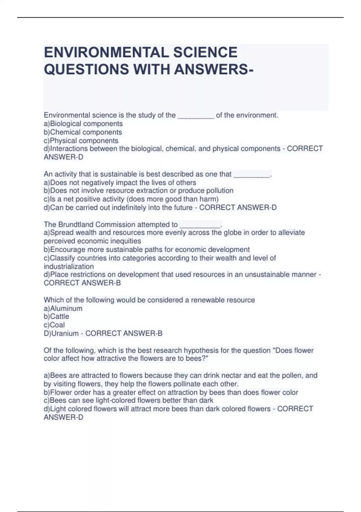 ENVIRONMENTAL SCIENCE QUESTIONS WITH ANSWERSEnvironmental science is the study of the _________ of the environment. a)Biological components b)Chemical components c)Physical components d)Interactions between the biological, chemical, and physical components - CORRECT ANSWER-D An activity that is sustainable is best described as one that _________. a)Does not negatively impact the lives of others b)Does not involve resource extraction or produce pollution c)Is a net positive activity (does more good than harm) d)Can be carried out indefinitely into the future - CORRECT ANSWER-D The Brundtland Commission attempted to __________. a)Spread wealth and resources more evenly across the globe in order to alleviate perceived economic inequities b)Encourage more sustainable paths for economic development c)Classify countries into categories according to their wealth and level of industrialization d)Place restrictions on development that used resources in an unsustainable manner - CORRECT ANSWER-B Which of the following would be considered a renewable resource a)Aluminum b)Cattle c)Coal D)Uranium - CORRECT ANSWER-B Of the following, which is the best research hypothesis for the question "Does flower color affect how attractive the flowers are to bees?" a)Bees are attracted to flowers because they can drink nectar and eat the pollen, and by visiting flowers, they help the flowers pollinate each other. b)Flower order has a greater effect on attraction by bees than does flower color c)Bees can see light-colored flowers better than dark d)Light colored flowers will attract more bees than dark colored flowers - CORRECT ANSWER-D A scientific theory is best described as a(n). a)Widely-supported scientific explanation b)Hunch c)Educated guess d)Hypothesis that has not yet been thoroughly tested - CORRECT ANSWER-A What is the role of creativity in science? a)Scientists must be creative in order to get the statistical results that support their hypothesis b)Scientists must be creative in order to design experiments that will give them the results that they predicted c)Scientists must be creative in order to design appropriate experiments and think critically about unexpected results d)Scientists are not supposed to be creative because creativity is subject to human emotions and desires, and scientists are supposed to be objective. - CORRECT ANSWER-C To be valid, a scientific observation needs to be ________. a)Accurate and repeatable b)Performed over a period of several years c)Performed in a controlled lab setting d)Performed by multiple researchers to make sure the observations were not made up - CORRECT ANSWER-A _________ experiments are those that involve the use of observations on a group that receives the same manipulations as the treatment group except for the one factor being studied or varied a)Accurate b)Observational c)Manipulative d) Controlled - CORRECT ANSWER-D What is the role of statistics in science? a)Statistics are used to collect data in an experiment b)Statistics are used to create results in an experiment c)Statistics are used to determine whether results of an experiment are meaningful d)Statistics are used to prove that a theory is true - CORRECT ANSWER-C Models are used in scientific research in order to _________. a)Study systems that would be too complicated or too large to manipulate b)Determine the best research design for testing a hypothesis c)Study systems that would be too expensive to manipulate d)Acquire research grant money from rich donors - CORRECT ANSWER-A Which one of the following best describes the scientific peer review process? a)A scientist's friends vouch for the scientist's honesty in order for the scientist;s research to be published b)Other scientists oversee the collection of data for an experiment to verify that a researcher is not making up the results c)Scientists anonymously evaluate the research of another scientist d)It is the only known process by which certain species of birds can be monitored without affecting the birds' behavior - CORRECT ANSWER-C Pseudoscience is __________ a) A punk rock band from the 1980s b)An alternative form of science that is becoming more popular in the scientific community c)Not published in peer-reviews journals d)Valid if its findings are supported by a scientist with a PhD - CORRECT ANSWER-C You should be skeptical of scientific claims if ___________ a)The person making claims has no financial stake in the matter b)They are supported by the findings of several studies c)You don't want to believe or do not think they can possibly be true d)They have not been published in peer-review journals - CORRECT ANSWER-D Which one of the following would be an emergent property of a vegetable garden? a) the need for water b)The changing nutrient levels in the garden's soil during the growing season c)The tomatoes and green beans grown in the garden d)The soil, the plants, and the earthworms living in the garden - CORRECT ANSWER-B Which of the following best illustrates the concept of a negative feedback loop? a)A forest fire denudes a mountain landscape, leading to erosion because of the lack of vegetation, causing the loss of the soil needed by plants that can colonize recently burned landscapes b)You get a bad grade on a paper, causing you to become distraught about your grade, leading you to stress and more bad grades c)Global warming causes permafrost to melt, releasing tons of trapped methane (a greenhouse gas) into the atmosphere, causing further warming d)When your body overheats you begin to sweat, which causes evaporative cooling, which cools you down. - CORRECT ANSWER-D A scientists is said to be "uncertain" when __________ a)His/Her statistical results are weak b)He/She is pretty sure that his/her hypothesis is incorrect c)He/She is more uncertain than certain d)He/She is less than 100% certain - CORRECT ANSWER-D Which of the following best illustrates quantitative data? a) whether you like this class b)Your gender c)Your d