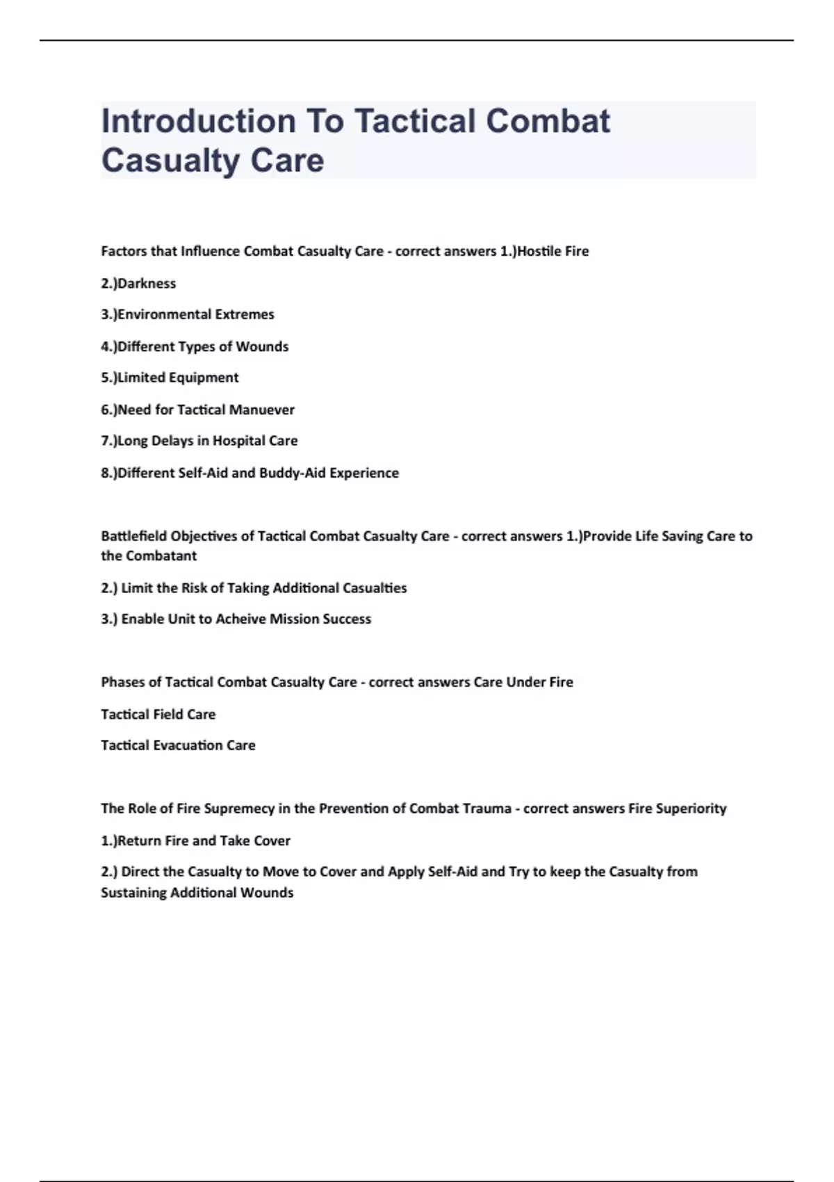 Introduction To Tactical Combat Casualty CareFactors that Influence Combat Casualty Care - correct answers 1.)Hostile Fire 2.)Darkness 3.)Environmental Extremes 4.)Different Types of Wounds 5.)Limited Equipment 6.)Need for Tactical Manuever 7.)Long Delays in Hospital Care 8.)Different Self-Aid and Buddy-Aid Experience Battlefield Objectives of Tactical Combat Casualty Care - correct answers 1.)Provide Life Saving Care to the Combatant 2.) Limit the Risk of Taking Additional Casualties 3.) Enable Unit to Acheive Mission Success Phases of Tactical Combat Casualty Care - correct answers Care Under Fire Tactical Field Care Tactical Evacuation Care The Role of Fire Supremecy in the Prevention of Combat Trauma - correct answers Fire Superiority 1.)Return Fire and Take Cover 2.) Direct the Casualty to Move to Cover and Apply Self-Aid and Try to keep the Casualty from Sustaining Additional Wounds