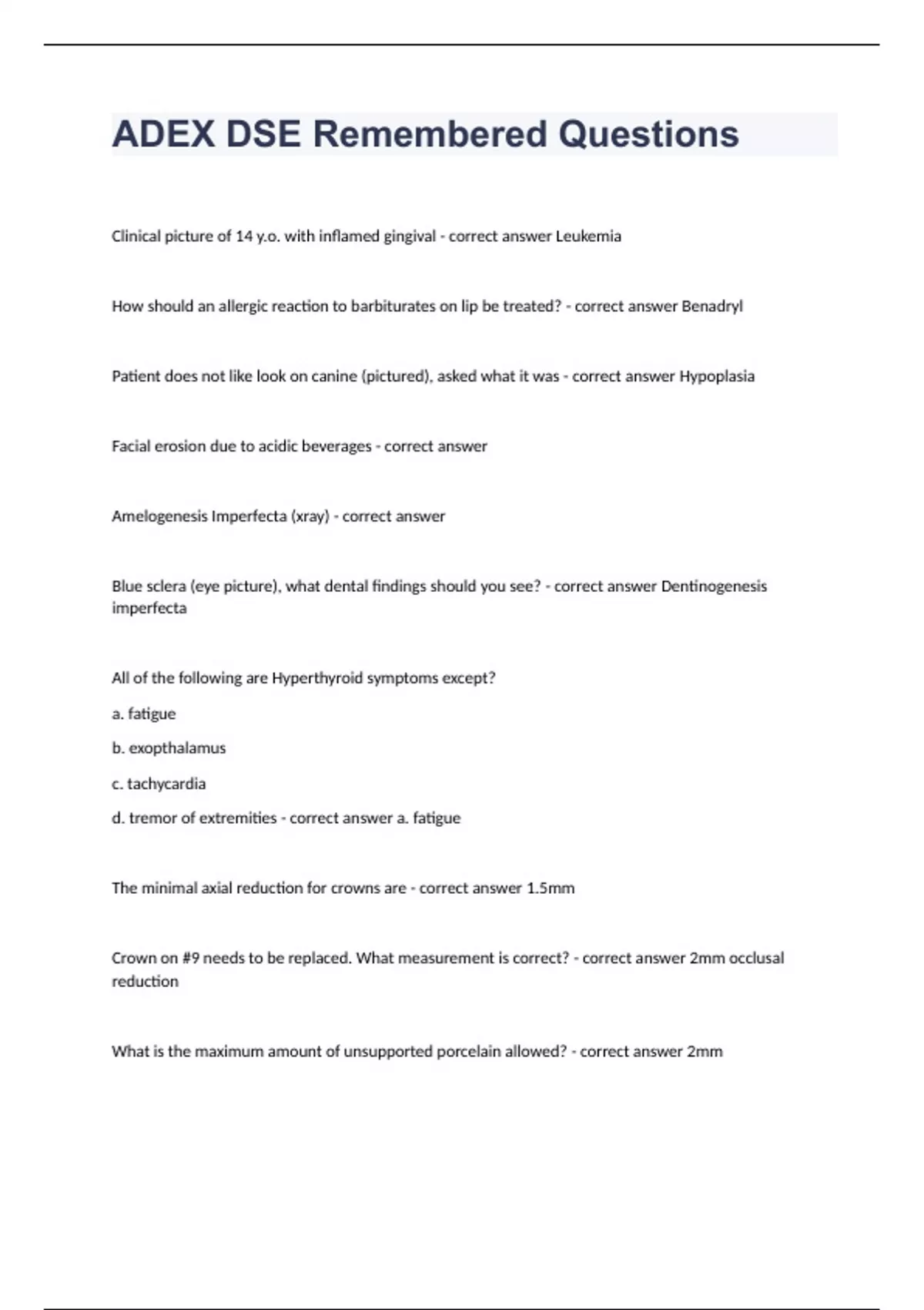 ADEX DSE Remembered Questions with complete solution 2023/2024Clinical picture of 14 y.o. with inflamed gingival - correct answer Leukemia How should an allergic reaction to barbiturates on lip be treated? - correct answer Benadryl Patient does not like look on canine (pictured), asked what it was - correct answer Hypoplasia Facial erosion due to acidic beverages - correct answer Amelogenesis Imperfecta (xray) - correct answer Blue sclera (eye picture), what dental findings should you see? - correct answer Dentinogenesis imperfecta All of the following are Hyperthyroid symptoms except? a. fatigue