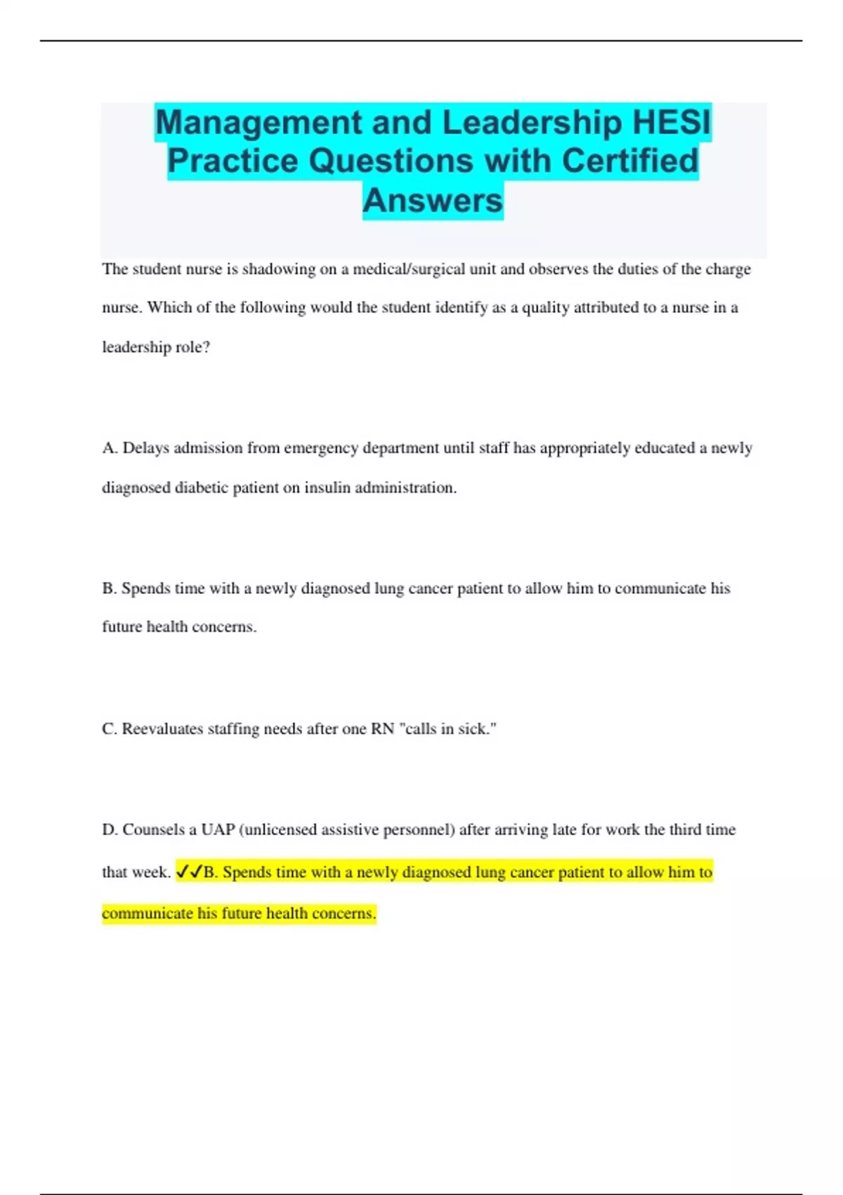 Management and Leadership HESI Practice Questions with Certified Answers The student nurse is shadowing on a medical/surgical unit and observes the duties of the charge nurse. Which of the following would the student identify as a quality attributed to a nurse in a leadership role? A. Delays admission from emergency department until staff has appropriately educated a newly diagnosed diabetic patient on insulin administration. B. Spends time with a newly diagnosed lung cancer patient to allow him to communicate his future health concerns. C. Reevaluates staffing needs after one RN "calls in sick." D. Counsels a UAP (unlicensed assistive personnel) after arriving late for work the third time that week. B. Spends time with a newly diagnosed lung cancer patient to allow him to communicate his future health concerns. Rationale: Leaders do the right thing. Therefore focus on effectiveness whereas a manager focuses on efficiencies. Which of the following is NOT a task or responsibility of the first-level manager? Staff assignments for patient care during shifts Conducting staff meetings Making daily patient rounds Initiate changes to unit policies based on current evidence Initiate changes to unit policies based on current evidence Rationale: Initiating change to the unit policies based on current evidence is done by the middle-level manage. The other options describe tasks of the first-level manager. A new nurse is interviewed at a facility where various models of patient care delivery are used. The nurse is interested in developing clinical decision-making skills. After the interview, the nurse determines the best position for enhancing those skills is the unit that uses which of the following models? Primary nursing Team nursing Functional nursing Case management Primary Nursing In primary nursing, clinical decision making is focused at the bedside by the nurse administering the care. The other options are a patient care delivery model whose focus is not bedside decision making. Which of the following is NOT an example of the behavioral theory of leadership? Democratic leader Republican leader Laissez faire leader Bureaucratic leader Republican Leader Republican is a political party not a behavioral characteristic. The others are behavioral characteristics. An agency nurse is assigned to work on a unit that uses the team nursing model of health care delivery. The nurse understands that the advantage to patient care delivery in this model is that the nurse must make all patient care decisions. can delegate patient care to other team members. begins working on discharge plans at the time of admission. administers all medications to the team patients. Can delegate patient care The advantage to the team nursing patient care delivery model is that UAPs are used to assist the RN and tasks can be delegated to them. The other options are examples of the primary nursing delivery model. In a primary care delivery model, which of the following would be an expected assignment for a staff member for the day? Two UAPs taking vital signs and blood sugars on all patients Two LPNs administering medications to all patients RN verifies new order for patient started on Lopressor (metoprolol) with a history of asthma. RN holds morning dose of Lopressor (metoprolol) on a patient scheduled for an exercise stress test today. Hold lopressor In a primary care delivery model, the nurse acts autonomously. Options A and B indicate functional nursing. Option C should be seen in any delivery system. Key tasks that the care manager may perform including all of the following EXCEPT deal with personal issues arising during a shift. use resources efficiently. observe whether unit policies and objectives are meeting the needs of the patients and staff. perform staff evaluations. objectives are meeting the needs of the patients and staff. Option C is a task for the middle-level manager. The other options are tasks of the care manager. The management process consists of all of the following five phases EXCEPT budgeting. identification of needs. planning organization and direction. identification of resources. budgeting. Budgeting is not part of the five phases of the management process. A patient tells the day shift nurse that the night shift did not answer her call light for over an hour. Which statement by the nurse is most appropriate when practicing in a primary nurse delivery model? "The night shift staff must care for more patients than does the day shift." "I will notify my charge nurse." "I will answer your call light promptly today." "I will be sure the UAP is doing her job." Option C is correct because the nurse works autonomously in the primary nurse delivery model. The other options are incorrect because they indicate other or no delivery care models. The following traits are seen in a leader EXCEPT they are present oriented. they empower others to set and achieve organizational goals. they are visionary. they focus on purposes. Option A is correct because all leaders are future oriented, not present oriented. The other options are leader traits. A patient tells the day shift nurse that the night shift did not answer her call light for over an hour. Which statement by the nurse is most appropriate when practicing in a functional nurse delivery model? "The night shift staff must care for more patients than does the day shift." "I will notify my charge nurse." "I will answer your call light promptly today." "I will speak to the individual privately." Option D is correct because in a functional model, each staff member is assigned one task for all patients. The other options may be seen in other or no models of care delivery. There are four core components of transformational leadership. Which one is one of the four core components? Emotional Stimulation (EI) Spiritual Motivation (SM) Idealized Influence (II) Individualized Courtesy (IC) Idealized Influence is one of the four core components of transformational leadersh