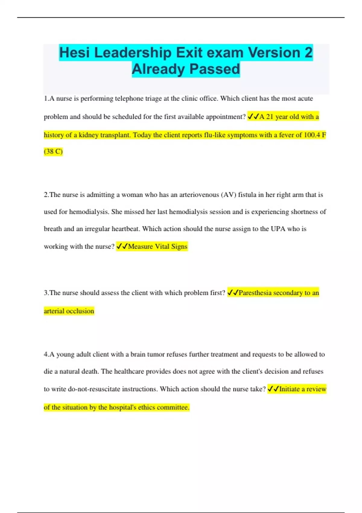 Hesi Leadership Exit exam Version 2 Already Passed 1.A nurse is performing telephone triage at the clinic office. Which client has the most acute problem and should be scheduled for the first available appointment? A 21 year old with a history of a kidney transplant. Today the client reports flu-like symptoms with a fever of 100.4 F (38 C) 2.The nurse is admitting a woman who has an arteriovenous (AV) fistula in her right arm that is used for hemodialysis. She missed her last hemodialysis session and is experiencing shortness of breath and an irregular heartbeat. Which action should the nurse assign to the UPA who is working with the nurse? Measure Vital Signs 3.The nurse should assess the client with which problem first? Paresthesia secondary to an arterial occlusion 4.A young adult client with a brain tumor refuses further treatment and requests to be allowed to die a natural death. The healthcare provides does not agree with the client's decision and refuses to write do-not-resuscitate instructions. Which action should the nurse take? Initiate a review of the situation by the hospital's ethics committee. 5.A healthcare provider notifies the nurse that new prescriptions have been written for a client. Which is the 1st action the nurse should implement? Read all of the new prescriptions for the client written by the provider 6.The nurse is observing the staff provide care to a client with acquired immune deficiency syndrome Unlicensed assistive personnel wearing a mask to take client's blood pressure. 7.The nurse caring for a client with bacterial meningitis is preparing report for the oncoming nurse. It is most important to include which assessment finding in the report? Increasing Pulse Pressure 8.The charge nurse notices that a respiratory therapist who has been cross-trained to work as a phlebotomist and unlicensed assistive personnel (UAP) seems to be avoiding HIV positive clients Provide the employee with feedback about observed behavior 9.The nursing supervisor sends an unlicensed assistant personnel ( UAP) to a medical unit to replace an absent UAP. When delegating the task of obtaining client's blood sugar levels using a glucometer, which action is most important for the nurse to implement? Observe the UAP obtain a fingerstick glucose level using the glucometer. 10.The nurse manager conducts regular audits of patient care medication records and notices that the amount of narcotic pain medications administered during the evening shift on a postsurgical unit Conduct a closer examination of staff nurse's distribution of pain medication from evening shift 11.The smell of cigarette smoke is coming from a client's bathroom. Which action should the nurse Educate the client about the hospital smoking policy. 12.The practical nurse (PN) reports to the charge nurse that the transparent dressing covering a single lumen central venous catheter inserted in the subclavian vein of a client has come loose and the insertion site is inflamed. Which action should the charge nurse implement? Confirm the findings of the PN while securing the transparent dressing and notify the healthcare provider. 13.At 0200 the nurse phones the healthcare provider to request a PRN medication for a client who is unable to sleep. The healthcare provider is awakened and gives the nurse a prescription for four times the normal dosage. When questioned by the nurse, the healthcare provider responds in a sleepy Call the healthcare or back, and report that the dosage prescribed is our times the normal dosage. 14.The charge nurse notices that a female practical nurse (PN), who has a long work history on the unit and is a valued employee, seems tired and slow to respond verbally during the change of shift report. One hour later the charge nurse overhears the PN telling an unlicensed assistive personnel (UAP) that she took a sleeping pill 4 hours ago and she is still feeling its effects. Which action should the charge nurse take? Send the PN to the employee health center for a urine drug Screen 15.It is most important to assign which client to a registered nurse rather than a practical nurse? After ambulating, a postoperative client grimaces and reports incisional pain at a "9" on a point scale. 16.After receiving a change of shift report for clients on a medical surgical unit, which task should the nurse Apply hydrocolloid dressings to venous 17.The charge nurse observes unlicensed assistive personnel (UAP) and a nurse arguing at the nurse's station. What action is best for the charge nurse to implement? Inform both individuals that their behavior is inappropriate in a work setting 18.A male client with metastatic lung cancer has requested that "no heroic measures" are used to extend his life, so the healthcare provider prescribes transferring the client to the palliative care Ensure the prescriptions or transfer include the client's end-of-life choice. 19.The charge nurse observes that a client with a nasogastric tube applied to low intermittent suction is drinking a glass of water immediately after the unlicensed assistive personnel (UAP) left the room. What is the best initial action for the charge nurse to take. Remove the glass of water and speak to the UAP. 20.The nurse hears a newly employed unlicensed assistive personnel (UAP) who is working in a long-term care facility calling the adult residents "honey" and "dearie." What is the best action for the nurse to take? Meet with the UAP to discuss respectful client care strategies. 21.The charge nurse is providing instructions to unlicensed assistive personnel (UAP) who will be assisting with the care of a client who has a hiatal hernia. Which instruction should the charge provide the UPA? Elevate the head of the bed before the client begins to eat 22.A nurse (RN), practical nurse (PN), and unlicensed assistive personnel (UAP) are working as a team to provide care for an acutely ill client requiring immediate bedside insertion of a chest tube. Which assignment is best u