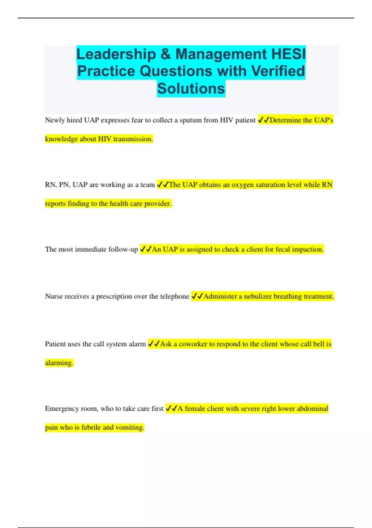 Leadership & Management HESI Practice Questions with Verified Solutions Newly hired UAP expresses fear to collect a sputum from HIV patient Determine the UAP's knowledge about HIV transmission. RN, PN, UAP are working as a team The UAP obtains an oxygen saturation level while RN reports finding to the health care provider. The most immediate follow-up An UAP is assigned to check a client for fecal impaction. Nurse receives a prescription over the telephone Administer a nebulizer breathing treatment. Patient uses the call system alarm Ask a coworker to respond to the client whose call bell is alarming. Emergency room, who to take care first A female client with severe right lower abdominal pain who is febrile and vomiting. No heroic measures Give detailed report to accepting nurse. Evaluate cardiac monitor system Organize a committee of ICU nurses to identify potential problems of the new monitoring system. Client has reported feeling of being constipated Assist the client to drink warm prune juice. Sequential compression devices Report any change in color in the client's feet or legs. Respiratory therapist cross-trained avoiding HIV positive client Provide the employee with feedback about the observed behavior. Medication error remains unchanged Examine medication administration data to determine use of new policy by nursing staff. Increase of nurse-to-patient ratio by 25% Disseminate factual information to all nursing staff to avoid misinformation and rumors. Respiratory rate decreases 14/ min -> 6/ min -> 4/min The decision regarding when to call the health care provider Glucometer checks post 2 days consistently 50-60 mg/dl higher Evaluate calibration of glucometer in use per manufacturer guidelines. Receptionist is responsible for taking client calls. Who to call back first? Casted right leg has a funny feeling tingling sensation. Two clients in one room. One client has MRSA the other one neutropenia. What intervention should the nurse implement? Transfer client with neutropenia to a private room. Signed witnessed DNR Confirm current resuscitation wishes with client and family hospice nurse end of life care MUCOUS MEMBRANE MOIST old client to rn (going to give to most experienced nurse) 72 YEAR OLD WITH DM 1 4 clients, iv infusing CEFTATRIAXONE IN 5% DEXTROSE uap, colostomy record amount charge nurse, rn, pn cardiac cath, no pedal pulses .Charge nurse takes over for nurse on break, which client checked first 40 ml dark colored urine UAP stuck in palm by needle with Hep -wash hands with soap and water Assess first -coronary syndrome with increasing SOB New clinical documentation -Need to discuss new clinical documentation that helps save lifes and require one more document PCA to PO. BP increases 120/72 to 150/90. Additional questions/comments to HCP -can PCA be reinitiated Most immediate, intervention by nurse Pneumothorax with 80 SpO2% Intervention best to delegate to LPN Duragesic Morning lab, follow-up first BNP assay, MI with SOB 1000 UAP to assemble nephrostomy tube -change bag to leg bag Women health fair, PN helping RN -assist with bone density prep Warrants immediate attention -female with RLQ pain in abd, febrile and vomiting Delegated to UAP` apply abdominal binder Multidisplinary team -elderly man with BGL 400 Assess first -constipation -weakness -pressure ulcer with skin flap -hep A Triaging ER client assess first -elderly -child -female -male 67 y/o female client recently widowed, increased confusion/disorientation. -medical eval, managed healthcare plan Female resident who is mentally alert and lives in a long-term care facility reports that a staff member slapped her -does she know the name of the person Most important to assign which client to a RN rather than PN -Pain scale of 9 PN reports to RN, patient pulled out CVC, UAP is with him in room. Stat dose of oral antianxiety med. RN assign care -RN with CVC, PN stat med, UAP VS on new admission RN assigned to care for four surgical clients. Which client should nurse see first. 3 postop, 1 preop The nurse is caring for a group of clients on a surgical unit. What action should the nurse implement first prepared for OR 0200 nurse phones HCP to request med for client who is unable to sleep four times the the dose. Nurse questions, HCP sleepy says "yea, ok" action first call HCP about dosage Telephone triage at clinic office. Which client is most acute and should be scheduled for the first available appointment. 21 y/o with kidney transplant, fever of 102, flu-like symptoms Nurse should assess the client with which problem first arterial occlusion RN gathering supplies to assist HCP with bedside thoracentesis when ED calls to report on a client with unstable angina PN assist with thoracentesis, RN gets report, UAP prepares room UAP give bath and change bed linen on Kaposi sarcoma (associated with HIV) -tell UAP to wear gloves and gown when handling linen Safely assess last drainage -Jackson-Pratt, no postop drainage after 8 hours Postop RR decrease from 14 to 6 after opioid. 30 minutes later decreases to 4. Narcan given -why wait so long to call HCP Nurse determines that an IV vesicant chemo infusion is infiltrated -apply cold compress 5 y/o boy with mumps is transferred to the peds unit. Nursing intervention most important to implement? PPE cart placed in front of the clients door Evening shift on med unit is busy, only nurse on the unit is busy with an unstable patient. HTC is on the phone with the unit secretary for an order for OTC laxative PRN. What is the best response? -the nurse will call you back as soon as possible to obtain the order Elderly male who is ketoacidotic becomes agitated when the nurse attempts to orient the client to time and place. What room is the best for this client? -the room next to nurses station Pt diagnosed with unstable angina is scheduled for cardiac cath. Select all. -assess chest pain or armpit pain, check pulses on both feet, assess groin access site, monitory VS per post op protocol. 