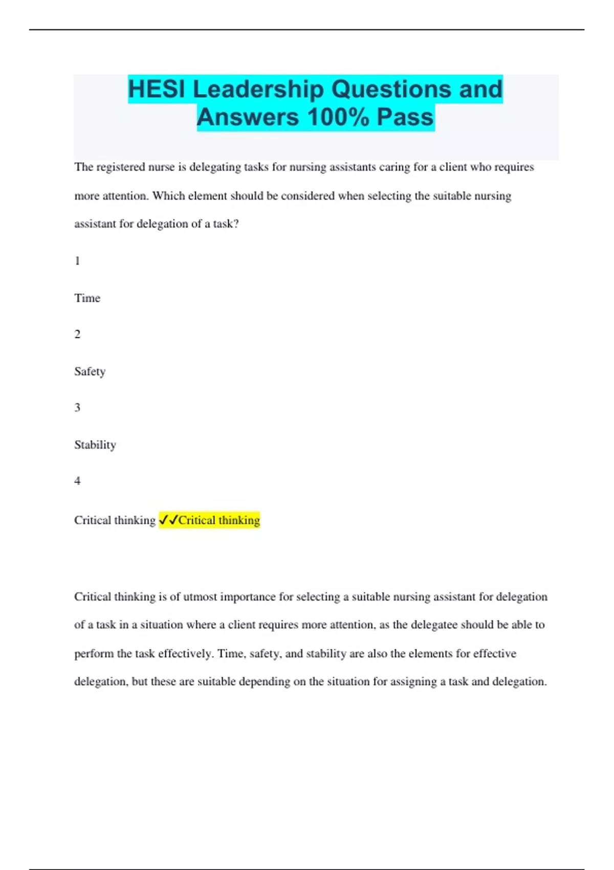 HESI Leadership Questions and Answers 100% Pass The registered nurse is delegating tasks for nursing assistants caring for a client who requires more attention. Which element should be considered when selecting the suitable nursing assistant for delegation of a task? 1 Time 2 Safety 3 Stability 4 Critical thinking Critical thinking Critical thinking is of utmost importance for selecting a suitable nursing assistant for delegation of a task in a situation where a client requires more attention, as the delegatee should be able to perform the task effectively. Time, safety, and stability are also the elements for effective delegation, but these are suitable depending on the situation for assigning a task and delegation. What is the proper order of events the nurse follows for performing critical analysis using the nursing process as a guide for delegation? 1. Planning an intervention 2. Implementing the plan including an observation of the delegation 3. Assessing the situation to determine what is legally appropriate to delegate 4. Evaluating whether the delegation process was completed safely and effectively 5. Determining whether the delegatee is competent to perform the task safely Assessing the situation to determine what is legally appropriate to delegate Planning an intervention Determining whether the delegatee is competent to perform the task safely Implementing the plan including an observation of the delegation Evaluating whether the delegation process was completed safely and effectively To perform a critical analysis, the registered nurse uses the nursing process as a guide for delegation. The registered nurse in this situation determines what is legally appropriate to delegate. Then the registered nurse plans an intervention for it and determines whether the delegatee is competent to perform the task safely. The registered nurse implements the plan including an observation of the delegatee. Then the registered nurse evaluates whether the delegation process was completed safely and effectively.1 Which characteristics of the delegatee should be considered to determine that he or she is the "right person"? Select all that apply. 1 Experience 2 Supervision 3 Willingness 4 Competence 5 Communication Experience Willingness Competence