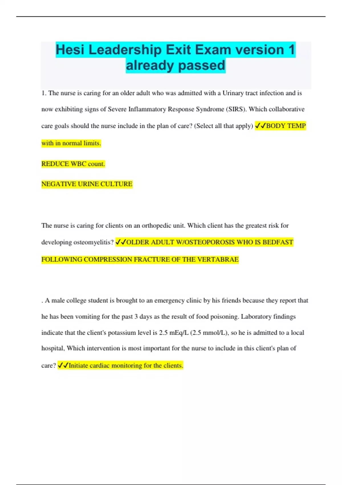 Hesi Leadership Exit Exam version 1 already passed 1. The nurse is caring for an older adult who was admitted with a Urinary tract infection and is now exhibiting signs of Severe Inflammatory Response Syndrome (SIRS). Which collaborative care goals should the nurse include in the plan of care? (Select all that apply) BODY TEMP with in normal limits. REDUCE WBC count. NEGATIVE URINE CULTURE The nurse is caring for clients on an orthopedic unit. Which client has the greatest risk for developing osteomyelitis? OLDER ADULT W/OSTEOPOROSIS WHO IS BEDFAST FOLLOWING COMPRESSION FRACTURE OF THE VERTABRAE . A male college student is brought to an emergency clinic by his friends because they report that he has been vomiting for the past 3 days as the result of food poisoning. Laboratory findings indicate that the client's potassium level is 2.5 mEq/L (2.5 mmol/L), so he is admitted to a local hospital, Which intervention is most important for the nurse to include in this client's plan of care? Initiate cardiac monitoring for the clients. The practical nurse (PN) is visiting a client who has stage four colon cancer and is receiving palliative home care the day. Which intervention should the nurse ask the PN to ensure the family is providing the client? MUCOUS MEMBRANE MOIST The nurse is caring for a group of five clients with the assistance of an experienced and capable unlicensed assistive personnel (UAP). Which nursing actions can the nurse delegate to the UP? (Select all that apply.) POST OP VITAL SIGNS HYGIENE CARE FOLLOWING TRAUMATIC FOOT AMPUTATION When triaging emergency room clients, which client should the nurse assess first? FEMALE WITH SEVERE RIGHT LOWER ABDOMINAL PAIN FEBRILE AND VOMITING *Confirm While eating breakfast, a client admitted with syncope and a 2-month history of vertigo complains of dizziness. Using the standard communication tool SBAR (Situation, Background, Assessment, Recommendation), which statement is best for the nurse to provide the healthcare provider about the client's background? The client's significant history includes atrial fibrillation and hypoglycemia. Several nurses are elected by their peers to serve on a negotiating committee to recommend new healthcare benefits BE AVAILABLE TO ALL SHIFTS TO DISCUSS CHANGES IN HEALTH BENEFITS Several family members are visiting a client who had a myocardial infarction 4 days ago. The unlicensed assistive one of the visitors is lying on the client's bed. Which action should the nurse implement? EXPLAIN THE CLIENT HAS THE RIGHT TO HAVE VISITOR LIE ON THE BED . The healthcare provider prescribes an oral medication to be given daily for 3 days. However, the medication was also given on the fourth day. REVIEW MEDICATION TRANSCRIPTION WITH THE NURSE. . The nurse initiates the procedure to remove a client's peripherally inserted central catheter (PICC) when a code blue is called for another collapsed in the hallway while ambulating with the unlicensed assistive personnel (UAP). Which action should the nurse take Respond to the code. OR Finish the procedure Not sure Which client requires the most immediate intervention by the nurse? CLIENT WITH ACUTE KIDNEY INJURY who is somnolent and does respond to verbal commands. . The nurse receives a telephone prescription from the healthcare provider for a client's persistent cough and wheezing, The prescription includes a chest xray, an antibiotic, and a nebulizer treatment now and PRN. Alter reading the prescription back to the healthcare provider to ensure accuracy, which intervention should the nurse implement first? NEBULIZER BREATHING TREATMENT An experienced, female practical nurse (PN) is hired to work on the surgical unit of a tertiary hospital. The first day she is working on the unit, the PN tells the charge nurse that she has excellent wound care skills. It is a busy day and a postoperative client needs to have a sterile dressing change. Which action is best for the charge nurse to take? Watch the PN perform sterile wound care to validate her skill level A male client is admitted with difficulty breathing related to a recent diagnosis of metastatic lung cancer. He tells the nurse that he does not want to be "hooked up to any machines". His vital signs are heart rate 120 beats/minute, blood pressure 98/50 mm, respirations 30 breaths/minute, and oxygen saturation rate is 88%. Which action should the nurse take? Discontinue the intravenous infusion A child is admitted to the pediatric unit after being diagnosed with pertussis. The nurse observes an unlicensed assistive personnel (UP) donning on a pair of gloves before entering the room to give the child a popsicle. Which action should the nurse take? REVIEW THE NEED TO WEAR A FACE MASK WHILE IN CLOSE CONTACT. The healthcare provider discusses with a male client the need for a cardiac catheterization, describes the risks and benefits of the procedure, and asks the nurse to have the client sign the consent form. When the nurse presents the consent form for signature, the client hesitates and asks the nurse how the wires will keep his heart going. Which action should the nurse take? NOTIFY THE HEALTHCARE PROVIDER OF THE CLIENTS LACK OF UNDERSTANDING A client with leukemia is hospitalized for weakness, fatique, and anemia. The client is restless and tachycardic. Which intervention is most important nurse to include in the plan of care? MAINTAIN PROTECTIVE ISOLATION An adult client is admitted via the Emergency Department with a head injury that will initially require intensive care. Which nurse should be responsible in coordinating the progression or this client's care through rehabilitation and discharge? NURSE CASE MANAGER When making assignments for residents of a long-term care facility who require assistance with FEEDING which client give to PRACTICAL NURSE and which client to licensed assistive personnel (UAP) Client who drools, but swallows solids after many Which staff assignment, made by the primary nurse, requires the most i