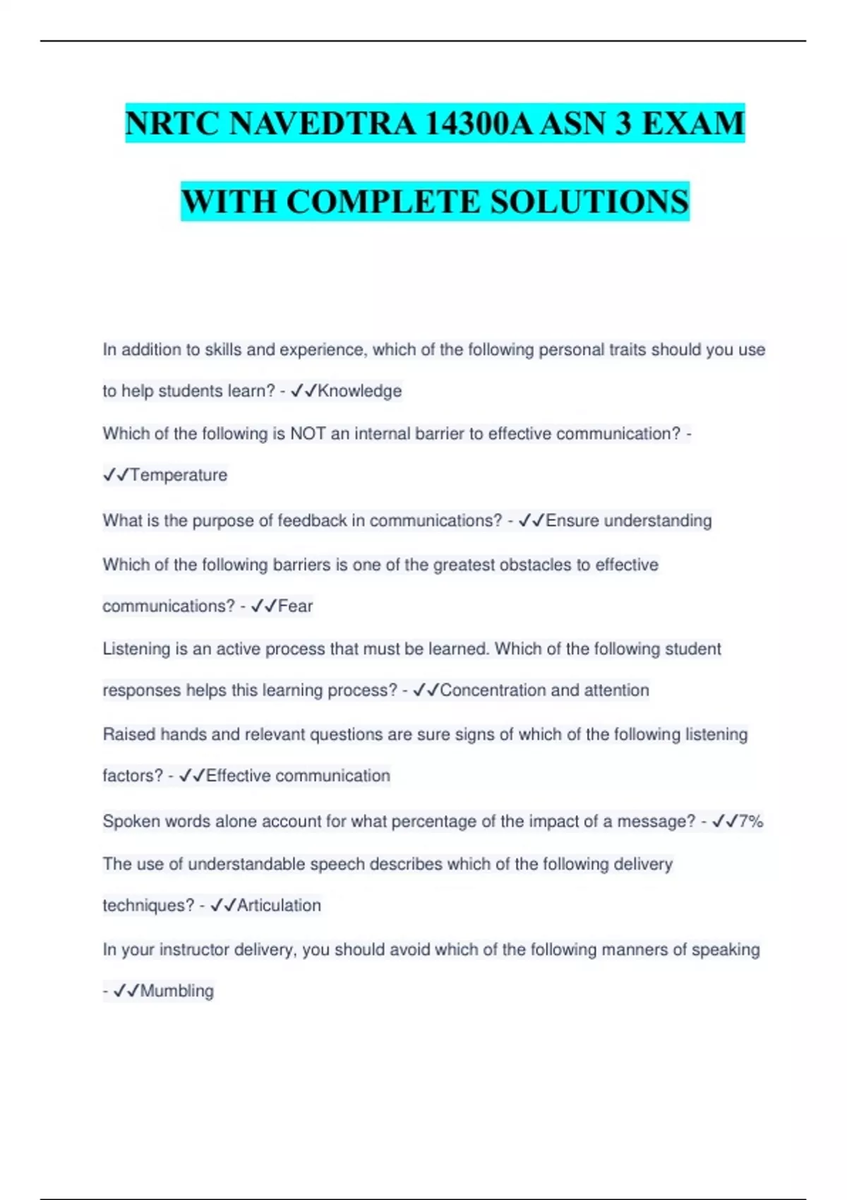 NRTC NAVEDTRA 14300A ASN 3 EXAM WITH COMPLETE SOLUTIONS In addition to skills and experience, which of the following personal traits should you use to help students learn? - ️️ Knowledge Which of the following is NOT an internal barrier to effective communication? - ️️ Temperature What is the purpose of feedback in communications? - ️️ Ensure understanding Which of the following barriers is one of the greatest obstacles to effective communications? - ️️ Fear Listening is an active process that must be learned. Which of the following student responses helps this learning process? - ️️ Concentration and attention Raised hands and relevant questions are sure signs of which of the following listening factors? - ️️ Effective communication Spoken words alone account for what percentage of the impact of a message? - ️️ 7% The use of understandable speech describes which of the following delivery techniques? - ️️ Articulation In your instructor delivery, you should avoid which of the following manners of speaking - ️️ Mumbling