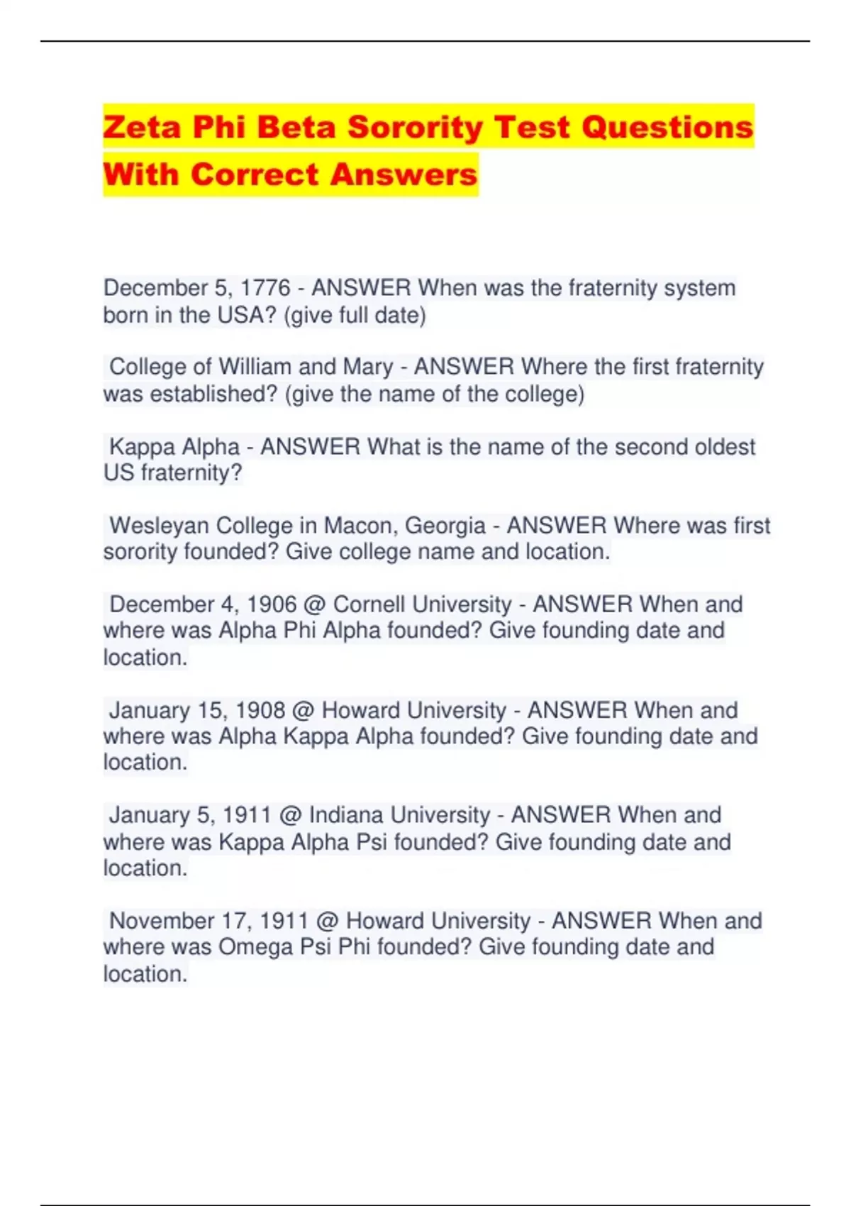 Zeta Phi Beta Sorority Test Questions With Correct Answers December 5, 1776 - ANSWER When was the fraternity system born in the USA? (give full date) College of William and Mary - ANSWER Where the first fraternity was established? (give the name of the college) Kappa Alpha - ANSWER What is the name of the second oldest US fraternity? Wesleyan College in Macon, Georgia - ANSWER Where was first sorority founded? Give college name and location. December 4, 1906 @ Cornell University - ANSWER When and where was Alpha Phi Alpha founded? Give founding date and location. January 15, 1908 @ Howard University - ANSWER When and where was Alpha Kappa Alpha founded? Give founding date and location. January 5, 1911 @ Indiana University - ANSWER When and where was Kappa Alpha Psi founded? Give founding date and location. November 17, 1911 @ Howard University - ANSWER When and where was Omega Psi Phi founded? Give founding date and location. January 13, 1913 @ Howard University - ANSWER When and where was Delta Sigma Theta founded? Give founding date and location.