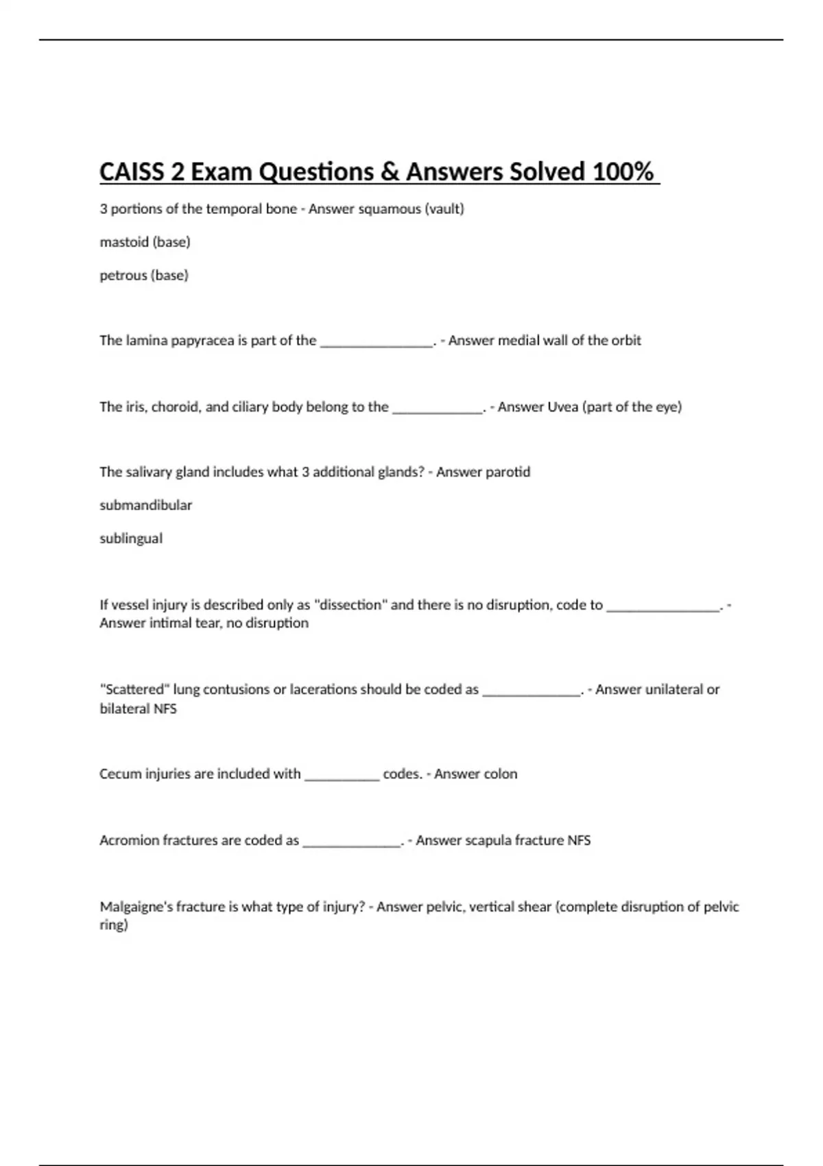 3 portions of the temporal bone - Answer squamous (vault) mastoid (base) petrous (base) The lamina papyracea is part of the _______________. - Answer medial wall of the orbit The iris, choroid, and ciliary body belong to the ____________. - Answer Uvea (part of the eye) The salivary gland includes what 3 additional glands? - Answer parotid submandibular sublingual If vessel injury is described only as "dissection" and there is no disruption, code to _______________. - Answer intimal tear, no disruption "Scattered" lung contusions or lacerations should be coded as _____________. - Answer unilateral or bilateral NFS Cecum injuries are included with __________ codes. - Answer colon Acromion fractures are coded as _____________. - Answer scapula fracture NFS Malgaigne's fracture is what type of injury? - Answer pelvic, vertical shear (complete disruption of pelvic ring) For hypothermia, do you round up? or down? when coding - Answer neither, code to whole number only Is Asphyxia a codable sequela? - Answer Yes "blood along tentorium" codes to __________. - Answer cerebrum Code soft palate perforation as ____________. - Answer laceration Code hard palate perforation as ____________. - Answer fracture If palate is not specified as soft or hard, code as _____________. - Answer fracture If carotid artery injury is not specified, what artery should it be coded to? - Answer common carotid If jugular vein injury is not specified, what vein should it be coded to? - Answer internal jugular What joint is rotator cuff injury assigned to? - Answer glenohumeral joint (shoulder) T/F hanging/drowning deaths with medical examiner's diagnosis counts as "cardiac arrest documented by medical personnel" - Answer True Pseudoaneurysm is coded as _____________. - Answer minor artery laceration What type of injury is a Morel Lavallee Lesion? - Answer degloving of an extremity or internal shearing Pterygoid plates are part of the ____________ bone and coded to the ______________ if injured in isolation. - Answer sphenoid, skull base T/F If pterygoid plates are part of a Lefort fracture, they are not coded additionally as a skull base fracture. - Answer True T/F A spinal cord injury (compression, epidural, or subdural) with associated fracture but NO deficit is coded as cord injury OR fracture, not both. - Answer TRUE What anatomical spine structure is pars interarticularis coded to? - Answer pedicle Persistent air leak (442203.4) in the thorax lasts for more than ______ hours, and is more severe than simple pneumothorax. - Answer 48 Intracardiac septum may also be identified as ____________. - Answer intraventricular septum Abdominal serosal tear is coded as a ________________. - Answer partial thickness injury "Hip fracture" with no other description is coded as ___________. - Answer proximal femur fracture (853111.3) "slipped epiphysis" in children is coded as __________. - Answer femur neck fracture (853161.3) When can you use the Caustic injury NFS (040099.9) - Answer only when specific location is not known What is retrobulbar hemorrhage coded as? - Answer eye, NFS (240499.1) What is nose amputation coded as? - Answer skin avulsion T/F mandible fractures documented as "minimally displaced" are coded as non-displaced. - Answer True - displacement must be significant Soft tissue injuries to the thorax or abdomen described as "degloving" should be coded as _____________. - Answer avulsion What structure is papillary muscle injury coded to? - Answer intracardiac chordae tendineae What are cauda equina lacerations coded as? - Answer cauda equina contusion What are named ligament injuries in the upper extremity coded as? - Answer sprain in the associated joint T/F Electrical injury w/cardiac arrest documented by medical personnel includes documentation from EMS or pre-hospital personnel. - Answer True Hole, break, or opening made through entire thickness of a membrane, wall or tissue of an organ or structure of the body. - Answer perforation Breaking open or bursting to forcibly disrupt tissue resulting in a hole, break or opening with stellate edges or devitalized/fragmented tissue, made through entire thickness of membrane or other tissue of an organ or structure. - Answer rupture What are GSW with missile "lodged in" bone coded as? - Answer open fracture T/F LOC codes may be used even in the absence of a diagnoses of "concussion" as long as the LOC is documented by a physician or APP. - Answer True Any penetrating injury involving the brain stem should be coded to _______________, no matter how many other regions of the brain are also involved. - Answer brain stem, penetrating injury (140216.6) What is the surgical neck of the humerus coded to? - Answer proximal humerus - extra articular (751151.2) What is the general structure of the chapters in the AIS dictionary? - Answer whole area vessels nerves internal organs skeletal What additional section does the head chapter have in the AIS dictionary? - Answer concussion What additional sections does the upper/lower extremity chapters have in the AIS dictionary? - Answer muscle, tendon, ligaments joints Represents AIS coding rules and conventions - Answer boxed and bold text Denotes inclusive or exclusive information? - Answer brackets Includes synonyms or occasionally, non-clinical terms - Answer parentheses Separates injury descriptors that are comparable in severity - Answer semicolons Identifies an anatomical structure - Answer bold type Used for proper-named anatomical structures or injuries, and for OIS grades - Answer italics What system used if the coder requires further degrees of injury specificity? - Answer localizers How many digits could the full post-dot code be for coder's using the localizer system? - Answer five What are the 2 components of the localizer system? - Answer localizer 1 (L1) localizer 2 (L2) _______________ includes any injury to an intracranial vessel resulting in its occlusion (e.g. intimal tear, dissection) - Answer thrombosis What is 