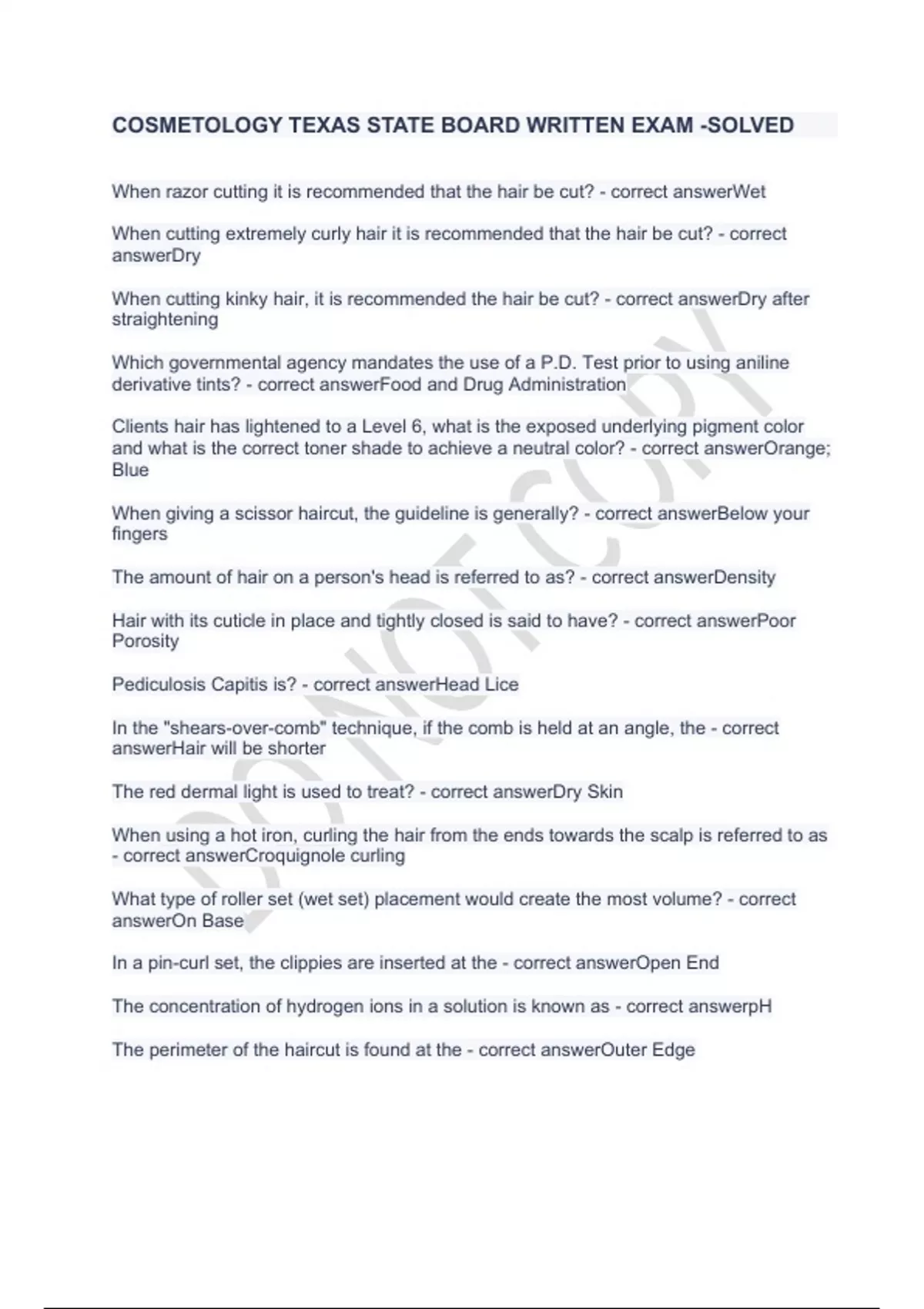 COSMETOLOGY TEXAS STATE BOARD WRITTEN EXAM -SOLVED