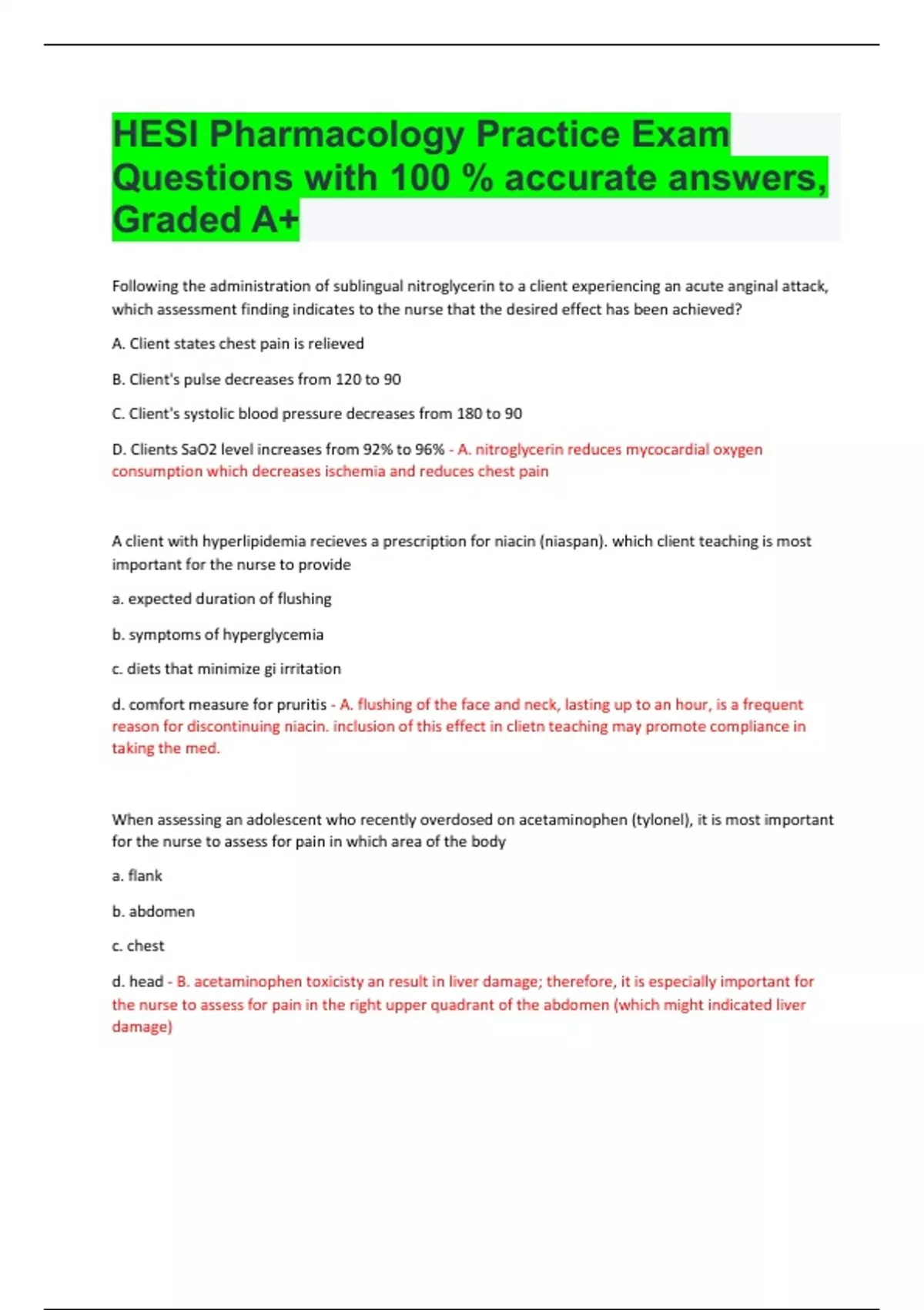 HESI Pharmacology Practice Exam Questions with 100 % accurate answers, Graded A+ Following the administration of sublingual nitroglycerin to a client experiencing an acute anginal attack, which assessment finding indicates to the nurse that the desired effect has been achieved? A. Client states chest pain is relieved B. Client's pulse decreases from 120 to 90 C. Client's systolic blood pressure decreases from 180 to 90 D. Clients SaO2 level increases from 92% to 96% - A. nitroglycerin reduces mycocardial oxygen consumption which decreases ischemia and reduces chest pain A client with hyperlipidemia recieves a prescription for niacin (niaspan). which client teaching is most important for the nurse to provide a. expected duration of flushing b. symptoms of hyperglycemia c. diets that minimize gi irritation d. comfort measure for pruritis - A. flushing of the face and neck, lasting up to an hour, is a frequent reason for discontinuing niacin. inclusion of this effect in clietn teaching may promote compliance in taking the med. When assessing an adolescent who recently overdosed on acetaminophen (tylonel), it is most important for the nurse to assess for pain in which area of the body a. flank b. abdomen c. chest d. head - B. acetaminophen toxicisty an result in liver damage; therefore, it is especially important for the nurse to assess for pain in the right upper quadrant of the abdomen (which might indicated liver damage) A client is admitted to the coronary care unit with a medical diagnosis of acute myocardial infarction. which medication prescription decreases both preload and afterload a. nitroglycerin b. propranolol c. propranolol d. captopril - A. nitroglycerin is a nitrate that causes peripheral vasodilation and decreases contractility, thereby decreasing both preload and afterload A client is being treated for hyperthyroidism with propylthiouracil (PTU). The nurse knows that the action of this drug is to A. decrease the amount of the thyroid-stimulating hormone circulating in the blood B. increase the amount of thyroid-stimulating hormone circulating in the blood C. increase the amount of T4 and decrease the amount of T3 produced by the thyroid D. inhibit synthesis of T3 and T4 by the thyroid gland - D. PTU is an adjunct therapy used to control hyperthyroidism by inhibiting production of thyroid hormones. It is often prescribed in prep for thyroidectomy or radioactive iodine therapy Which change in data indicates to the nurse the desired effect of the angiotensin II receptor antagonist has been achieved A. Dependent edema reduced form +3 to +1 B. Serum HDL increased from 35 to 55mg/dl C. PUlse rate reduced from 150 to 90 beats/min D. Blood pressure reducedf rom 160/90 to 130.80 - D. angiotensin II receptor antagonist (blocker), prescribed from treatment of HTN. The desired effect is a decrease in blood pressure. Which instructions should the nurse give to a female client who just recieved a prescription for oral metronidazole (flagyl) for treatment of trichomonas vaginalis (select all that apply) A. increase fluid intake, especially cranberry juice B. Do not abruptly discontinue the medication; taper use C. Check blood pressure daily to detect hypertension D. Avoid drinking alcohol while taking this medication E. Use condoms until treatment is completed