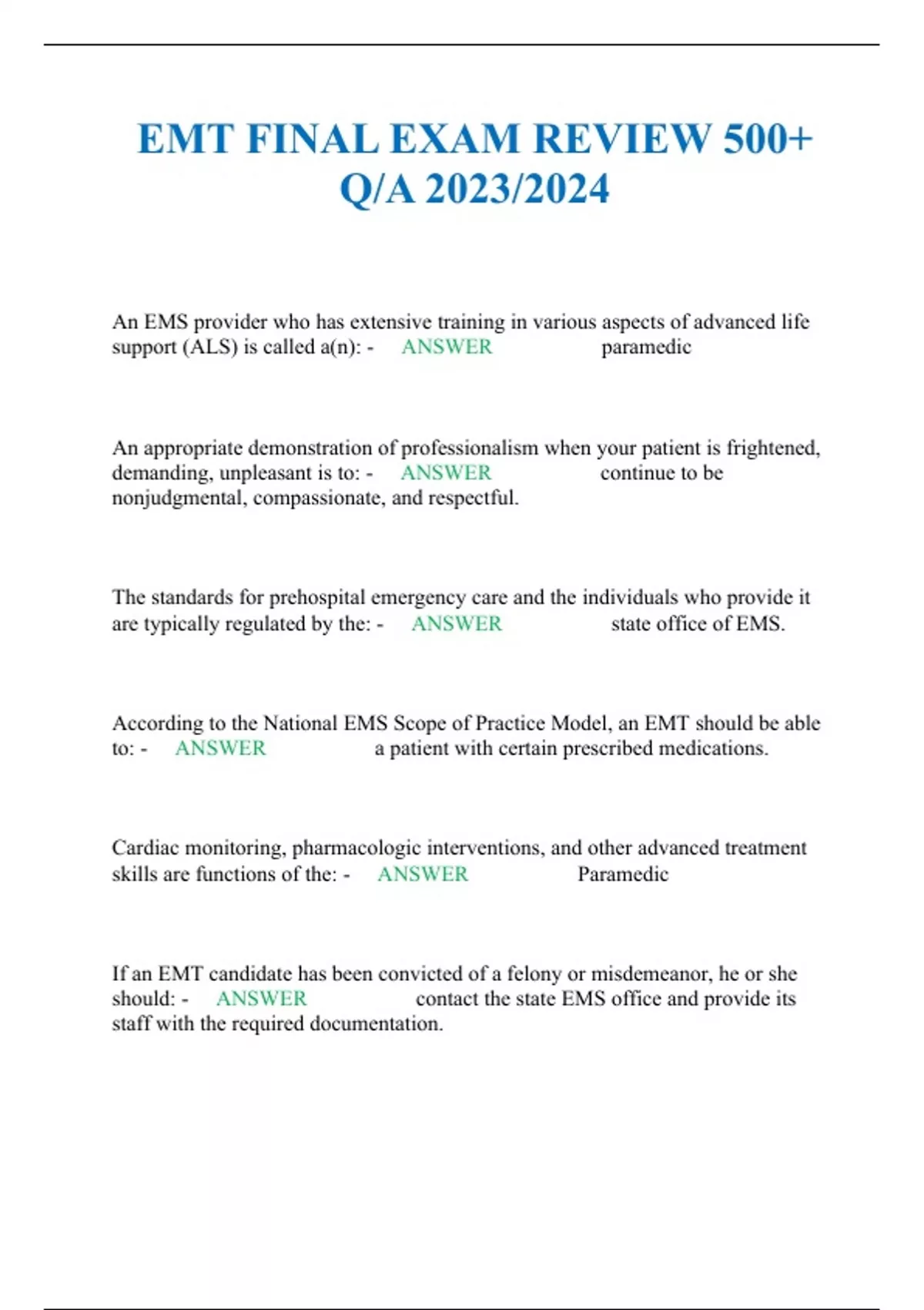 EMT FINAL EXAM REVIEW 500+ Q/A 2023/2024 An EMS provider who has extensive training in various aspects of advanced life support (ALS) is called a(n): - ANSWER paramedic An appropriate demonstration of professionalism when your patient is frightened, demanding, unpleasant is to: - ANSWER continue to be nonjudgmental, compassionate, and respectful. The standards for prehospital emergency care and the individuals who provide it are typically regulated by the: - ANSWER state office of EMS. According to the National EMS Scope of Practice Model, an EMT should be able to: - ANSWER a patient with certain prescribed medications. Cardiac monitoring, pharmacologic interventions, and other advanced treatment skills are functions of the: - ANSWER Paramedic If an EMT candidate has been convicted of a felony or misdemeanor, he or she should: - ANSWER contact the state EMS office and provide its staff with the required documentation. Which of the following scenarios involves the administration of ALS? - ANSWER A 48-year-old patient whose airway is secured with a supraglottic device The person who is responsible for authorizing EMTs to perform emergency medical care in the field is the: - ANSWER medical director. Continuing education in EMS serves to: - ANSWER maintain, update, and expand the EMT's knowledge and skills.
