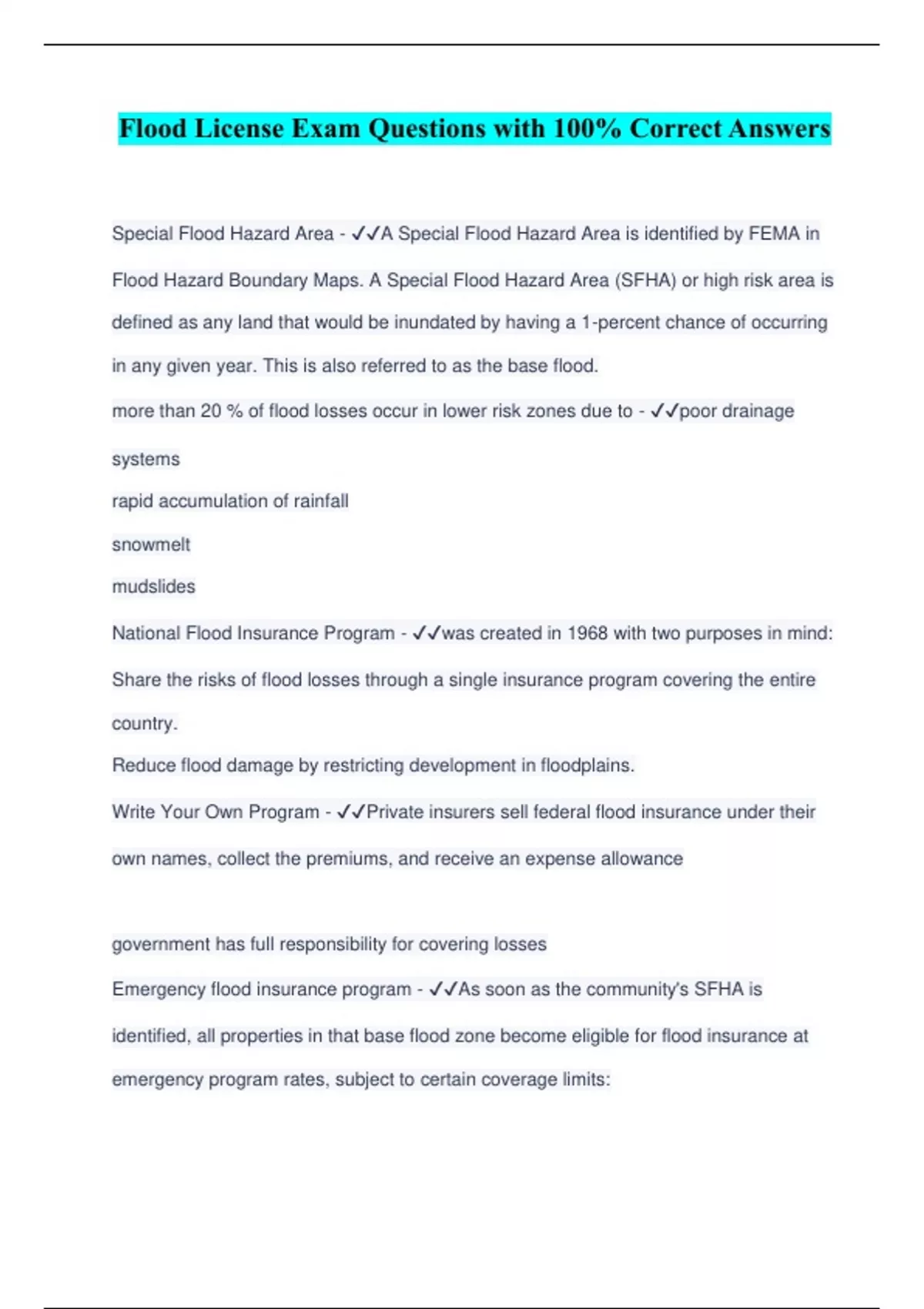 Flood License Exam Questions with 100% Correct Answers Special Flood Hazard Area - ️️ A Special Flood Hazard Area is identified by FEMA in Flood Hazard Boundary Maps. A Special Flood Hazard Area (SFHA) or high risk area is defined as any land that would be inundated by having a 1-percent chance of occurring in any given year. This is also referred to as the base flood. more than 20 % of flood losses occur in lower risk zones due to - ️️ poor drainage systems rapid accumulation of rainfall snowmelt mudslides National Flood Insurance Program - ️️ was created in 1968 with two purposes in mind: Share the risks of flood losses through a single insurance program covering the entire country. Reduce flood damage by restricting development in floodplains. Write Your Own Program - ️️ Private insurers sell federal flood insurance under their own names, collect the premiums, and receive an expense allowance government has full responsibility for covering losses Emergency flood insurance program - ️️ As soon as the community's SFHA is identified, all properties in that base flood zone become eligible for flood insurance at emergency program rates, subject to certain coverage limits