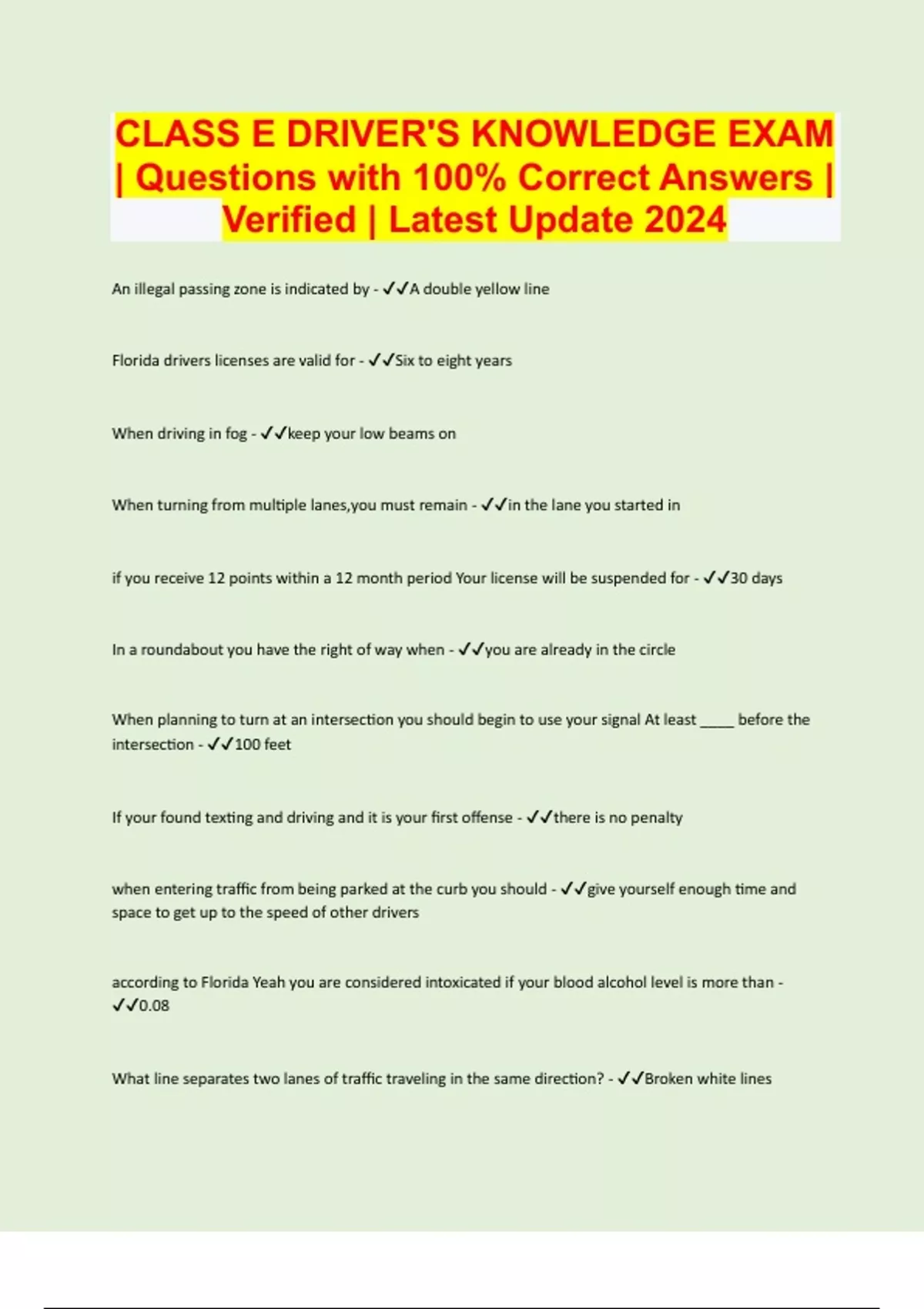 CLASS E DRIVER'S KNOWLEDGE EXAM | Questions with 100% Correct Answers | Verified | Latest Update 2024