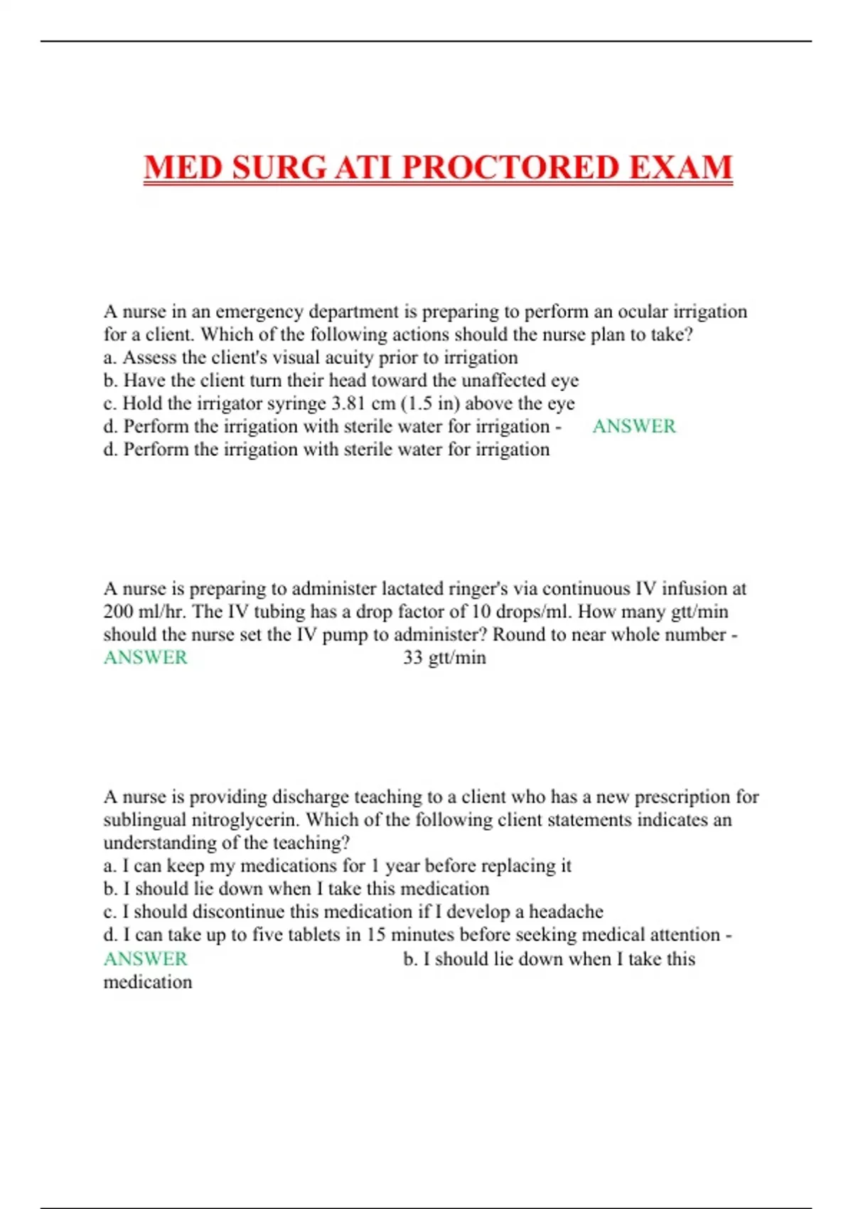 MED SURG ATI PROCTORED EXAM A nurse in an emergency department is preparing to perform an ocular irrigation for a client. Which of the following actions should the nurse plan to take? a. Assess the client's visual acuity prior to irrigation b. Have the client turn their head toward the unaffected eye c. Hold the irrigator syringe 3.81 cm (1.5 in) above the eye d. Perform the irrigation with sterile water for irrigation - ANSWER d. Perform the irrigation with sterile water for irrigation A nurse is preparing to administer lactated ringer's via continuous IV infusion at 200 ml/hr. The IV tubing has a drop factor of 10 drops/ml. How many gtt/min should the nurse set the IV pump to administer? Round to near whole number - ANSWER 33 gtt/min A nurse is providing discharge teaching to a client who has a new prescription for sublingual nitroglycerin. Which of the following client statements indicates an understanding of the teaching? a. I can keep my medications for 1 year before replacing it b. I should lie down when I take this medication c. I should discontinue this medication if I develop a headache d. I can take up to five tablets in 15 minutes before seeking medical attention - ANSWER b. I should lie down when I take this medication A nurse is providing discharge teaching to an older adult client following a left total hip arthroplasty. Which of the following instructions should the nurse include in the teaching? a. Clean the incision daily with hydrogen peroxide b. You can cross your legs the ankles when sitting down c. You should use an incentive spirometer every 8 hours d. Install a raised toilet seat in your bathroom - ANSWER d. Install a raised toilet seat in your bathroom A nurse is planning care for a client following a cardiac catheterization. Which of the following actions should the nurse take? a. Keep the client on bed rest for 24 hours b. Limit the client's fluid intake to 1 l per day c. Maintain the client's affected extremity in extension d. Change the client's dressing every 8 hour - ANSWER c. Maintain the client's affected extremity in extension A nurse is caring for a client who has a lower extremity fracture and a prescription for crutches. Which of the following client statements indicates that the client is adapting to their role change? a. I will need to have my partner take over shopping for groceries and cooking the meals for us b. These crutches will make it impossible to care for my child c. I feel bad that I have to ask my partner to keep the house clean d. Its going to be difficult to tell my parents I cant take them to their appointments anymore - ANSWER a. I will need to have my partner take over shopping for groceries and cooking the meals for us A nurse is caring for a client who has gastroenteritis. Which of the following assessment findings should the nurse recognize as an indication that the client is experiencing dehydration? a. Pitting, dependent edema b. Distended jugular veins c. Increased BP d. Decreased BP - ANSWER d. Decreased BP A nurse is caring for a client who has a contusion of the brainstem and reports thirst. The client's urinary output was 4,000 ml over the past 24 hour. The nurse should anticipate a prescription for which of the following IV medication? a. Desmopressin b. Epinephrine c. Furosemide d. Nitroprusside - ANSWER a. Desmopressin