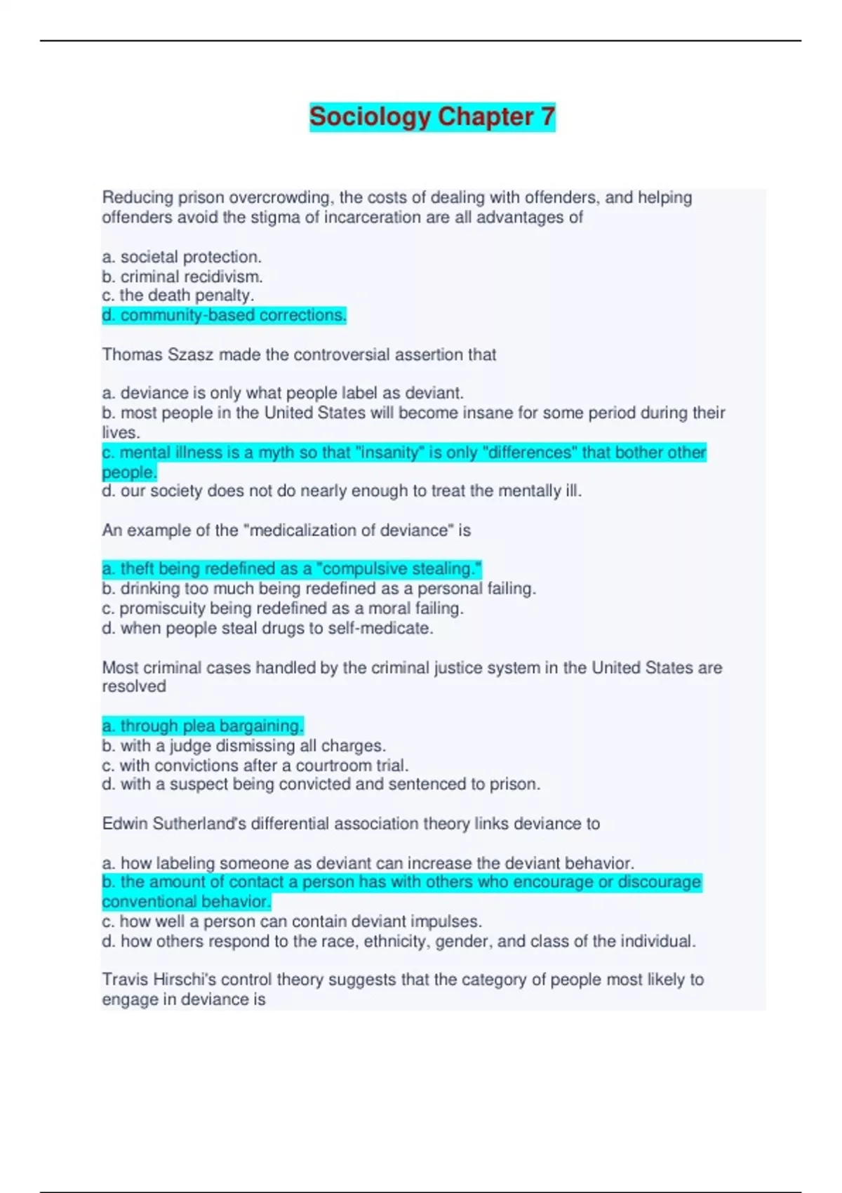 Sociology Chapter 7 - Questions and Answers Reducing prison overcrowding, the costs of dealing with offenders, and helping offenders avoid the stigma of incarceration are all advantages of a. societal protection. b. criminal recidivism. c. the death penalty. d. community-based corrections. Thomas Szasz made the controversial assertion that a. deviance is only what people label as deviant. b. most people in the United States will become insane for some period during their lives. c. mental illness is a myth so that "insanity" is only "differences" that bother other people. d. our society does not do nearly enough to treat the mentally ill. An example of the "medicalization of deviance" is a. theft being redefined as a "compulsive stealing." b. drinking too much being redefined as a personal failing. c. promiscuity being redefined as a moral failing. d. when people steal drugs to self-medicate. Most criminal cases handled by the criminal justice system in the United States are resolved a. through plea bargaining. b. with a judge dismissing all charges. c. with convictions after a courtroom trial. d. with a suspect being convicted and sentenced to prison. Edwin Sutherland's differential association theory links deviance to a. how labeling someone as deviant can increase the deviant behavior. b. the amount of contact a person has with others who encourage or discourage conventional behavior. c. how well a person can contain deviant impulses. d. how others respond to the race, ethnicity, gender, and class of the individual. Travis Hirschi's control theory suggests that the category of people most likely to engage in deviance is a. students enrolled in college. b. teenagers on sports teams with after-school jobs. c. youngsters who "hang out" waiting for something to happen. d. young people with respect for their parents. According to the social-conflict approach, what a society labels as deviant is based primarily on a. how often the act occurs. b. the moral foundation of the culture. c. how harmful the act is to the public as a whole. d. differences in power between various categories of people. Alexander Liazos speaks for the social-conflict approach when he states that a. powerless people are at the highest risk of being defined as deviant. b. deviance has both functions and dysfunctions. c. deviance exists only in the eye of the beholder. d. society should ignore victimless crime. Using a Marxist approach, Steven Spitzer claims that prime targets for deviant labeling include a. people who try to take the property of others. b. people who work hard but are poor. c. perpetrators of white-collar crime. d. people who have social power. Crime committed by persons of high social position during the course of their occupations is called a. victimless crime. b. white-collar crime. c. organized crime. d. street crime. Edwin Sutherland stated that white-collar crime a. almost always leads to a criminal conviction. b. provokes a strong response from the community. c. is usually resolved in a civil rather than a criminal court. d. rarely involves serious harm to the public as a whole. _________ _______ refers to the illegal actions of a corporation or people acting on its behalf.