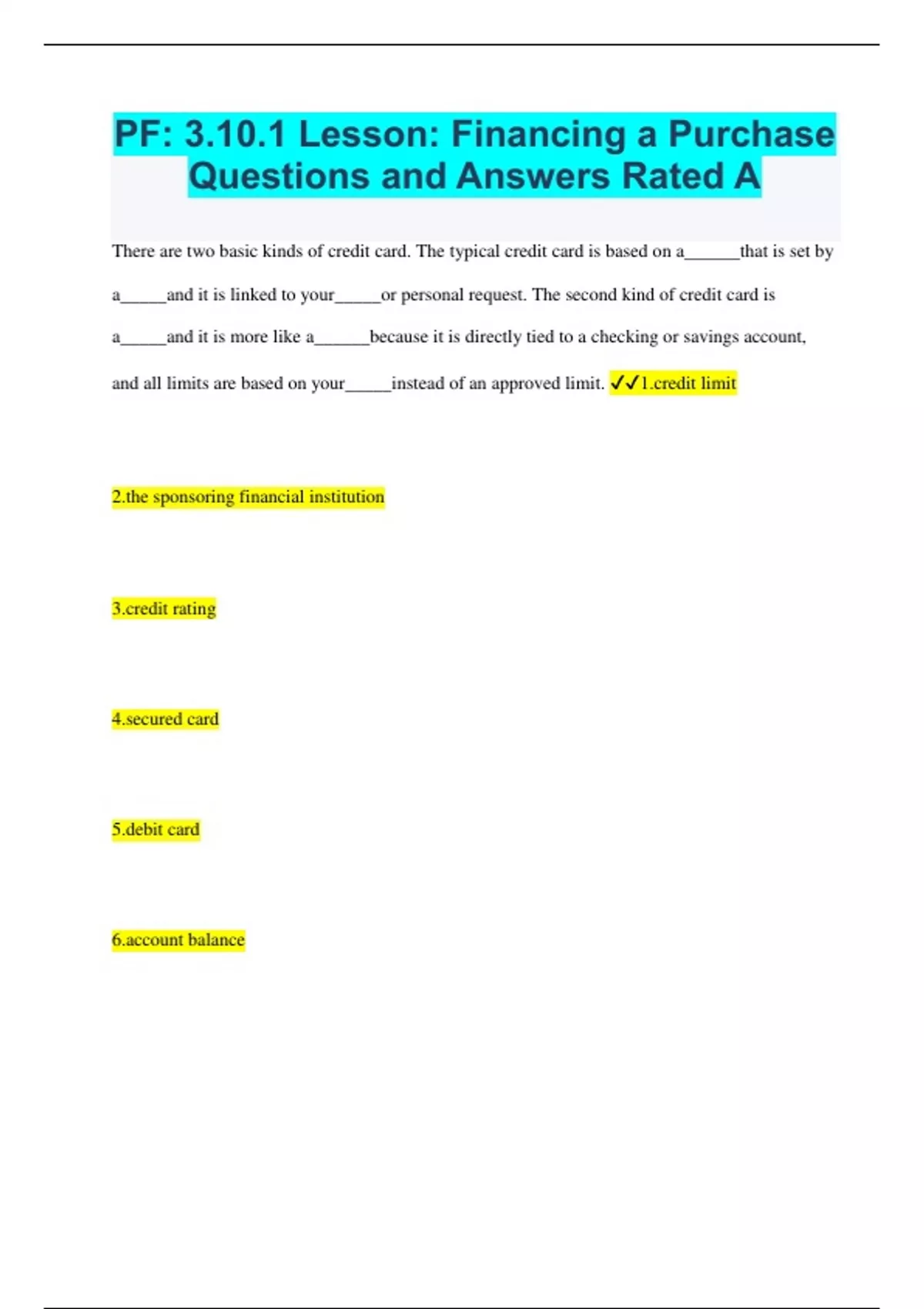 PF: 3.10.1 Lesson: Financing a Purchase Questions and Answers Rated A There are two basic kinds of credit card. The typical credit card is based on a______that is set by a_____and it is linked to your_____or personal request. The second kind of credit card is a_____and it is more like a______because it is directly tied to a checking or savings account, and all limits are based on your_____instead of an approved limit. t limit sponsoring financial institution t rating ed card card nt balance When you have a credit card, it comes with certain stated policies and privileges. Select all that pertain to being a credit card customer. - late fees can/will be assessed if your payment is past due - some credit cards come with rewards points or cash back programs -most cards have a grace period of 25-30 days where no interest is charged on purchases - minimum payment due based on your account balance and percentages - annual fees are assessed yearly by some credit card companies, especially for premier accounts - APR interest rates tend to be between 8-24% Of all the types of credit offered to consumers, which ones are the worst ones to use because of both the fees and interest rates and how they will affect your credit rating. Choose two. -Payday loans -Car title loans A department store sponsored card offers special incentives to shop with the store, but also carry higher interest rates. These cards... cannot be used anywhere you want since they are sponsored by a specific store