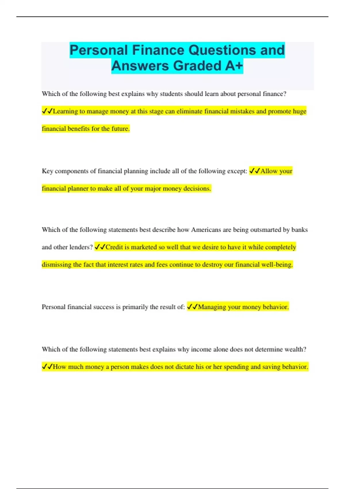 Personal Finance Questions and Answers Graded A+ Which of the following best explains why students should learn about personal finance? Learning to manage money at this stage can eliminate financial mistakes and promote huge financial benefits for the future. Key components of financial planning include all of the following except: Allow your financial planner to make all of your major money decisions. Which of the following statements best describe how Americans are being outsmarted by banks and other lenders? Credit is marketed so well that we desire to have it while completely dismissing the fact that interest rates and fees continue to destroy our financial well-being. Personal financial success is primarily the result of: Managing your money behavior. Which of the following statements best explains why income alone does not determine wealth? How much money a person makes does not dictate his or her spending and saving behavior. Which of the following is a consequence of spending more than you make? Missed opportunity to save and invest, stress, a cycle of debt, ALL OF THE ABOVE Which of the following is not a true statement? The credit industry in America has not changed much since 1917. Whent it comes to managing money, success is about __% knowledge and __% behavior. 20, 80 The widespread financial insecurity of Americans is probably because The savings rate of Americans is low and many borrow in order to spend more than they earn. Which of the following is not a factor in becoming money smart? Learn how to read your credit card statements. Which of the following is not a benefit of understanding your own money personality? Knowing your money personality allows you to excuse excessive spending because it is simply part of your nature. Why was the use of credit uncommon prior to 1917? Laws prevented lenders from charging high interest rates, borrowing money was generally not socially acceptable, lending money to others was not profitable, ALL OF THE ABOVE When it comes to personal finance, the math is easy. What's challenging is managing your behavior Which of the following is not a reason credit is marked heavily to consumers in the United States? The use of credit is not socially accepted in the United States. During the Great Depression, New Deal policymakers came up with mortgage (home loans) and consumer lending policies that convinced commercial banks that: Consumer credit could be profitable True financial security is achieved when your money begins to generate an income--your money starts working for you. True Since you are a teenager, what you do now with money will have little effect on your financial future. False Most Americans today are wealthy and will have financial security when they retire. False Most Americans avoid the use of credit when it comes to buying big-ticket items like a car or furniture for their home. False Learning the language of money is not that important because you will be able to depend on financial planners to manage your money. False Having debt keeps you from building wealth. True The credit system today is structured to accommodate a state of uncertain employment and income instability, utilizing high interest rates and fees to turn huge profits. True Expensive houses and new cars are a true indication of wealth. False When developing a personal financial plan, one of the first things you should do is assess your current financial situation. This includes your income, assets, and liabilities. True Everyone should have the same financial plan. A budget that works for one person should be sufficient for everyone. False Explain why understanding your money personality is important when it comes to developing a money plan that's right for you. Understanding your personal strengths and weaknesses when it comes to money will help you manage your spending and saving behavior. Explain how marketing can affect your decision when it comes to spending money. Marketing affects where and how we spend our money through advertisements; it can encourage us to buy now and pay later. Describe some of the mistakes Americans often make when it comes to money. Lack of budgeting, overspending, relying on credit. Does managing your money well mean that you can't have fun with your money? No; you can always budget some money for fun activities. A person or business that offers loans at extremely high interest rates loan shark A person or organization that uses a product or service consumer An obligation of repayment owed by one party to a second party debt The granting of a loan and the creation of debt; any for of deferred payment credit The knowledge and skill set necessary to be an informed consumer and manage finances effectively financial literacy A fee paid by a borrower to the lender for the use of borrowed money interest A system by which goods and services are produced and distributed economy A debt evidenced by a "note," which specifies the principal amount, interest rate, and date of repayment loan A period of temporary economic decline during which trade and industrial activity are reduced; generally identified by a fall in a gross domestic product recession All of the decisions and activities of an individual or family regarding their money, including spending, saving, budgeting, etc. personal finance