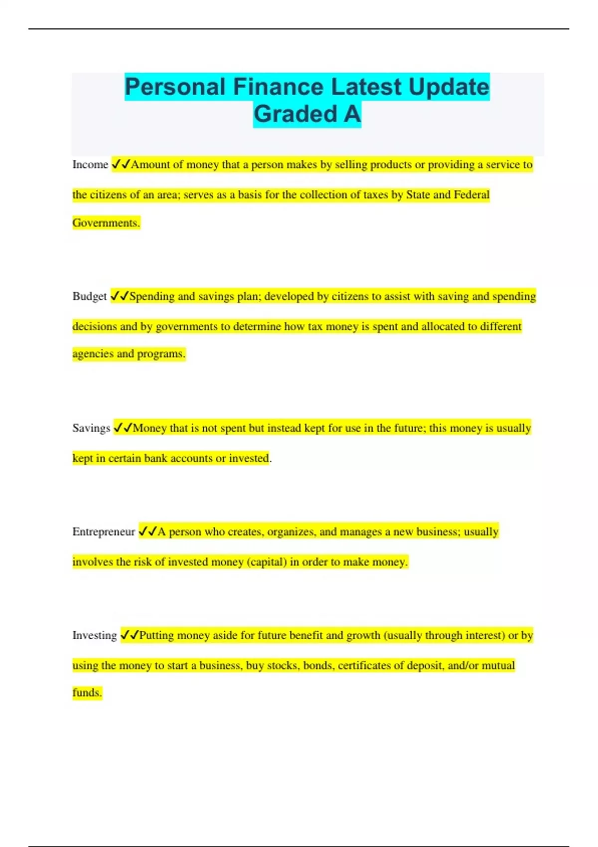 Personal Finance Latest Update Graded A Income Amount of money that a person makes by selling products or providing a service to the citizens of an area; serves as a basis for the collection of taxes by State and Federal Governments. Budget Spending and savings plan; developed by citizens to assist with saving and spending decisions and by governments to determine how tax money is spent and allocated to different agencies and programs. Savings Money that is not spent but instead kept for use in the future; this money is usually kept in certain bank accounts or invested. Entrepreneur A person who creates, organizes, and manages a new business; usually involves the risk of invested money (capital) in order to make money. Investing Putting money aside for future benefit and growth (usually through interest) or by using the money to start a business, buy stocks, bonds, certificates of deposit, and/or mutual funds. Profit Monetary gain a business owner makes by selling goods or providing services; calculated by subtracting the total expenses from the total income. Credit Terms that applies to the ability to buy something now and pay for it later over a period of time (usually with having to pay a finance charge and/or the addition of interest). Coca-Cola Delta Airlines Home Depot Georgia-Pacific List three (3) examples of large businesses from Georgia that provide jobs for Georgia's citizens, products for people across Georgia and the United States and additional tax revenue for our state.