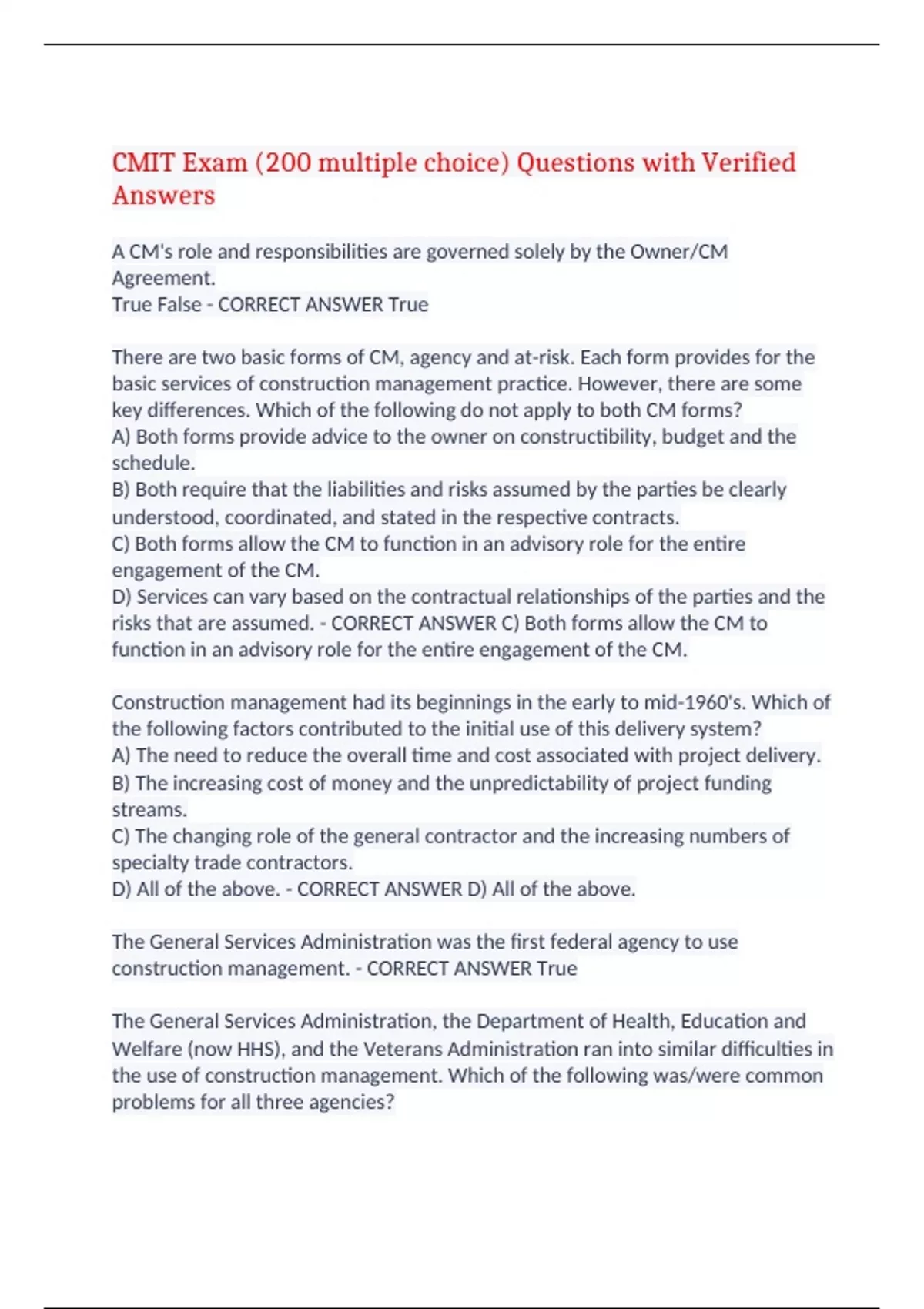 CMIT Exam (200 multiple choice) Questions with Verified Answers A CM's role and responsibilities are governed solely by the Owner/CM Agreement. True False - CORRECT ANSWER True There are two basic forms of CM, agency and at-risk. Each form provides for the basic services of construction management practice. However, there are some key differences. Which of the following do not apply to both CM forms? A) Both forms provide advice to the owner on constructibility, budget and the schedule. B) Both require that the liabilities and risks assumed by the parties be clearly understood, coordinated, and stated in the respective contracts. C) Both forms allow the CM to function in an advisory role for the entire engagement of the CM. D) Services can vary based on the contractual relationships of the parties and the risks that are assumed. - CORRECT ANSWER C) Both forms allow the CM to function in an advisory role for the entire engagement of the CM. Construction management had its beginnings in the early to mid-1960's. Which of the following factors contributed to the initial use of this delivery system? A) The need to reduce the overall time and cost associated with project delivery. B) The increasing cost of money and the unpredictability of project funding streams. C) The changing role of the general contractor and the increasing numbers of specialty trade contractors. D) All of the above. - CORRECT ANSWER D) All of the above. The General Services Administration was the first federal agency to use construction management. - CORRECT ANSWER True The General Services Administration, the Department of Health, Education and Welfare (now HHS), and the Veterans Administration ran into similar difficulties in the use of construction management. Which of the following was/were common problems for all three agencies? A) Funding restrictions B) Claims C) Change conditions D) All of the above - CORRECT ANSWER D) All of the above CMAA was formed and incorporated 1982 with its primary focus being the growth and development of the construction management profession. - CORRECT ANSWER True The CMAA Construction Management Standards of Practice is intended as a guide to the range of services that constitute professional construction management. They seek to meet the documented need for definitions of what construction management services are, without unduly structuring the methodologies by which those services are provided by the CM. - CORRECT ANSWER True The goals of the Construction Management Association of America (CMAA) include: A) Setting standards and developing contract documents for construction management practice. B) Expanding the understanding of the construction management concept and its use in the marketplace. C) Advocacy for construction management in the legislative, regulatory, and judicial arenas of federal, state, and local governments. D) All of the above. - CORRECT ANSWER D) All of the above The fact that an individual is certified or licensed in any other profession does not, per se, establish him/her as a qualified CM. True False - CORRECT ANSWER True Certification as a CM means the construction management practitioner has "state of the art" knowledge and capability to practice construction management. True False - CORRECT ANSWER False Recruiting and training are business matters and normally do not involve ethical concerns. True False - CORRECT ANSWER False Construction management is a concept that is susceptible to overselling. True False - CORRECT ANSWER True Failure to provide quality services is a business and not an ethical question. True False - CORRECT ANSWER False Contracting for adequate fees is both a business and an ethical issue. True False - CORRECT ANSWER True The ethics of the CM profession focus primarily on a CM's relationships in dealing with its clients. True False - CORRECT ANSWER True The possible approaches for delivering a project are virtually unlimited. A key reason for such variations is: A) The different roles that can be assumed by project participants. B) Different forms of contracts and methods of compensation that can be used. C) The different levels of care, responsibility, and risks assumed by the parties involved. D) All of the above. - CORRECT ANSWER D) All of the above The traditional delivery system is characterized by executing the major phases of a project in: A) An overlapping concept B) A linear sequence C) A fast track method D) All of the above - CORRECT ANSWER B) A linear sequence A key advantage of the traditional delivery approach is: A) With the traditional delivery system, the cost of the construction phase is known before construction starts. B) Facility features are fully determined & specified. C) When the construction contract is signed, the major risk belongs to the contractor. D) All of the above - CORRECT ANSWER B) Facility features are fully determined & specified. Design-build and at-risk construction management delivery systems allow the option to fast-track or phase a project. True False - CORRECT ANSWER True Most definitions of construction management are similar. However, a contractual definition is not known until: A) The legal form of the CM contract is chosen. B) The specific scope of services to be provided is identified. C) The relationship of the CM to others and the risks and authority assumed by the parties are clearly defined. D) All of the above - CORRECT ANSWER D) All of the above 21. In a CM-at-Risk arrangement once construction begins and the CM converts from the professional advisory role of a CM to the contractual role of a general contractor, the CM has no implied duties of loyalty and care to the owner. True False - CORRECT ANSWER True The agency CM does not perform design or actual construction work. True False - CORRECT ANSWER True Under the CM-at-Risk delivery method, the owner usually must deal with the hybrid of a construction manager and a general contractor. True False - CORRECT ANSWER True Under a CM-at