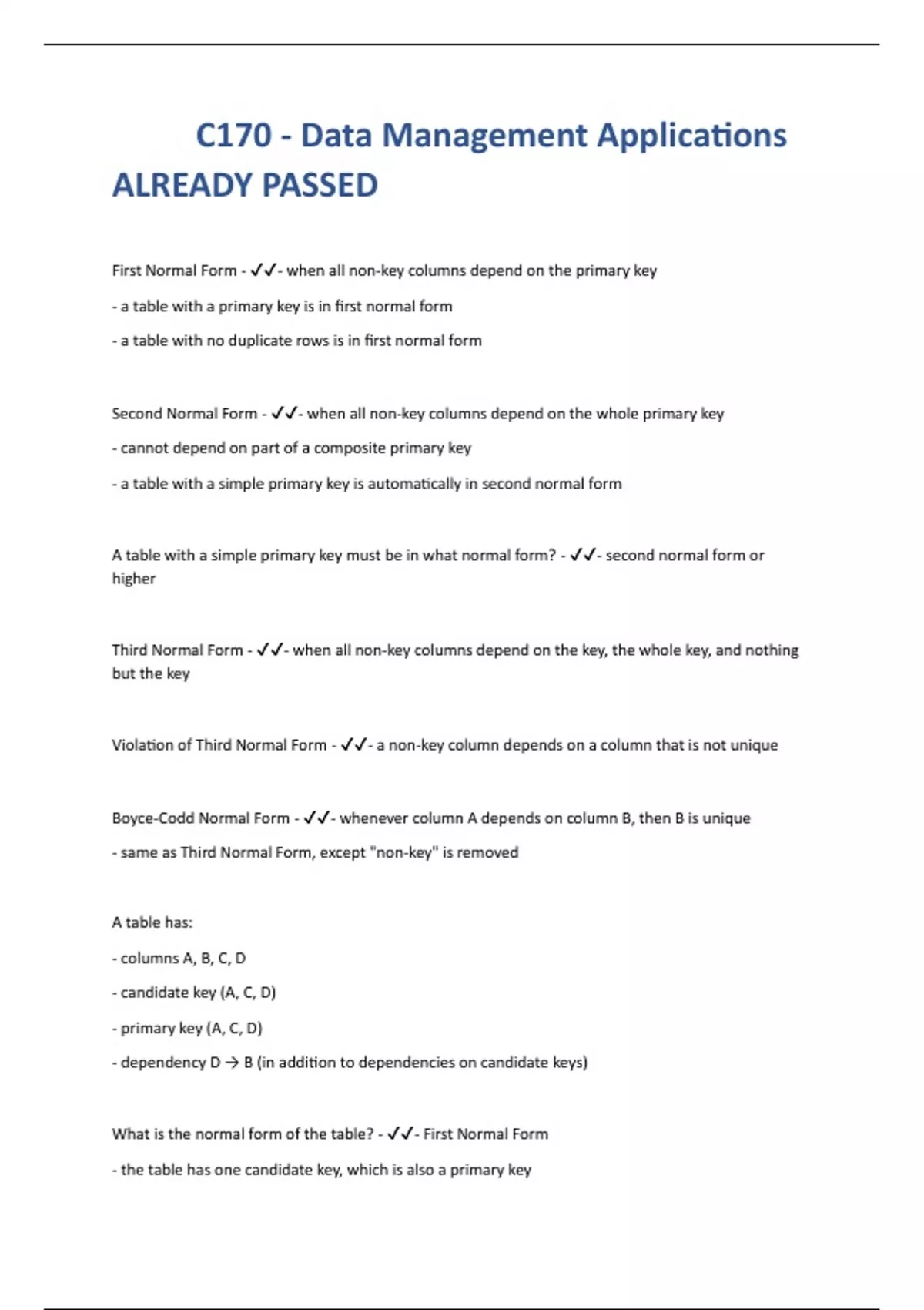 First Normal Form - - when all non-key columns depend on the primary key - a table with a primary key is in first normal form - a table with no duplicate rows is in first normal form Second Normal Form - - when all non-key columns depend on the whole primary key - cannot depend on part of a composite primary key - a table with a simple primary key is automatically in second normal form A table with a simple primary key must be in what normal form? - - second normal form or higher Third Normal Form - - when all non-key columns depend on the key, the whole key, and nothing but the key Violation of Third Normal Form - - a non-key column depends on a column that is not unique Boyce-Codd Normal Form - - whenever column A depends on column B, then B is unique - same as Third Normal Form, except "non-key" is removed A table has: - columns A, B, C, D - candidate key (A, C, D) - primary key (A, C, D) - dependency D → B (in addition to dependencies on candidate keys) What is the normal form of the table? - - First Normal Form - the table has one candidate key, which is also a primary key
