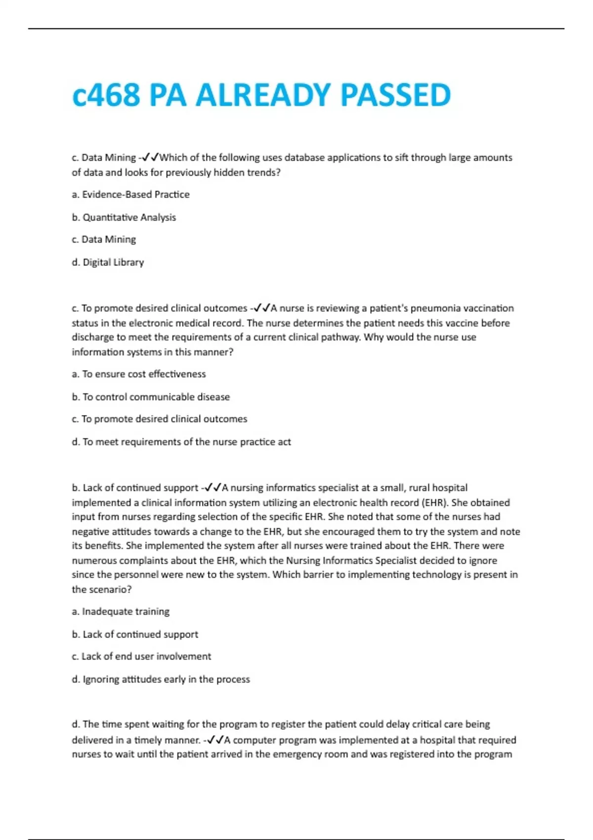 c. Data Mining -Which of the following uses database applications to sift through large amounts of data and looks for previously hidden trends? a. Evidence-Based Practice b. Quantitative Analysis c. Data Mining d. Digital Library c. To promote desired clinical outcomes -A nurse is reviewing a patient's pneumonia vaccination status in the electronic medical record. The nurse determines the patient needs this vaccine before discharge to meet the requirements of a current clinical pathway. Why would the nurse use information systems in this manner? a. To ensure cost effectiveness b. To control communicable disease c. To promote desired clinical outcomes d. To meet requirements of the nurse practice act b. Lack of continued support -A nursing informatics specialist at a small, rural hospital implemented a clinical information system utilizing an electronic health record (EHR). She obtained input from nurses regarding selection of the specific EHR. She noted that some of the nurses had negative attitudes towards a change to the EHR, but she encouraged them to try the system and note its benefits. She implemented the system after all nurses were trained about the EHR. There were numerous complaints about the EHR, which the Nursing Informatics Specialist decided to ignore since the personnel were new to the system. Which barrier to implementing technology is present in the scenario? a. Inadequate training b. Lack of continued support c. Lack of end user involvement d. Ignoring attitudes early in the process d. The time spent waiting for the program to register the patient could delay critical care being delivered in a timely manner. -A computer program was implemented at a hospital that required nurses to wait until the patient arrived in the emergency room and was registered into the program before orders for critical time-sensitive treatment could be written. How could this program become a barrier to the nurses attempting to deliver patient-centered care? a. The computer program could intimidate the nurses and cause them to shy away from the patients. b. The time spent waiting for the program to register the patient could allow the nurses to restock patient rooms. c. The computer program could interest the nurses more than the patients do, thus entertaining the nurses away from their focus on the patient. d. The time spent waiting for the program to register the patient could delay critical care being delivered in a timely manner. a. Information is data that have been interpreted -How is information related to data? a. Information is data that have been interpreted b. Information forms the base for accurate data collection c. Data provide an explanation of information d. Data is constructed through information synthesis a. The nurse can discern research findings that can be applied to practice d. Nurses must frequently consult resources including peers and general internet searches -How does information literacy support the use of evidence-based-practice (EBP) in nursing? Choose 2 answers a. The nurse can discern research findings that can be applied to practice b. Nurses consistently role-model this behavior in their practice environment c. Nurses are comfortable in performing data base searches d. Nurses must frequently consult resources including peers and general internet searches a. Information system -A nurse documents care of a patient with a decubitus ulcer in the electronic health record. Which term describes the electronic health record in this situation? a. Information system b. Information science c. Information technology d. Information processing