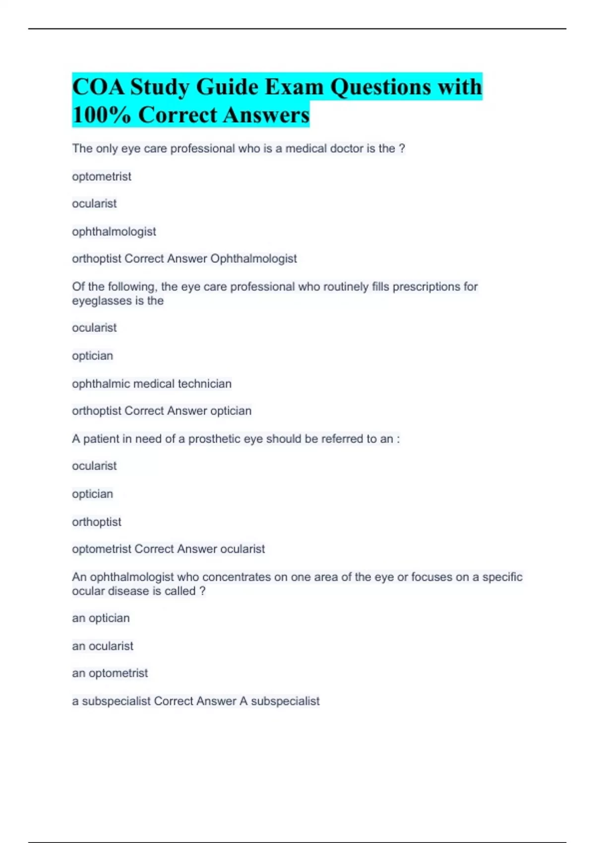The only eye care professional who is a medical doctor is the ? optometrist ocularist ophthalmologist orthoptist Correct Answer Ophthalmologist Of the following, the eye care professional who routinely fills prescriptions for eyeglasses is the ocularist optician ophthalmic medical technician orthoptist Correct Answer optician A patient in need of a prosthetic eye should be referred to an : ocularist optician orthoptist optometrist Correct Answer ocularist An ophthalmologist who concentrates on one area of the eye or focuses on a specific ocular disease is called ? an optician an ocularist an optometrist a subspecialist Correct Answer A subspecialist The level directly above certified ophthalmic medical assistant on JCAHPO's certification ladder is : certified ophthalmic medical technologist certified ophthalmic registered nurse certified ophthalmic technician certified ophthalmic photographer Correct Answer Certified ophthalmic technician Of the following, the responsibility that routinely falls to the ophthalmic medical assistant is : diagnosing certain conditions making prognostic estimates performing certain diagnostic tests prescribing treatment for certain problems Correct Answer performing certain diagnostic tests An orthoptist is a specialized member of the eye care team who : fits prosthesis evaluates double vision dispenses contact lenses grinds eyeglass lenses Correct Answer evaluates double vision JCAHPO is an abbreviation for : Joined Command of Alternate Healthcare Personnel in Ophthalmology Joined Committee of All Healthcare Personnel in Ophthalmology Joint Commission on Allied Health Personnel in Ophthalmology Joint Committee of All Health Personnel in Ophthalmology Correct Answer Joint Commission on Allied Health Personnel in Ophthalmology