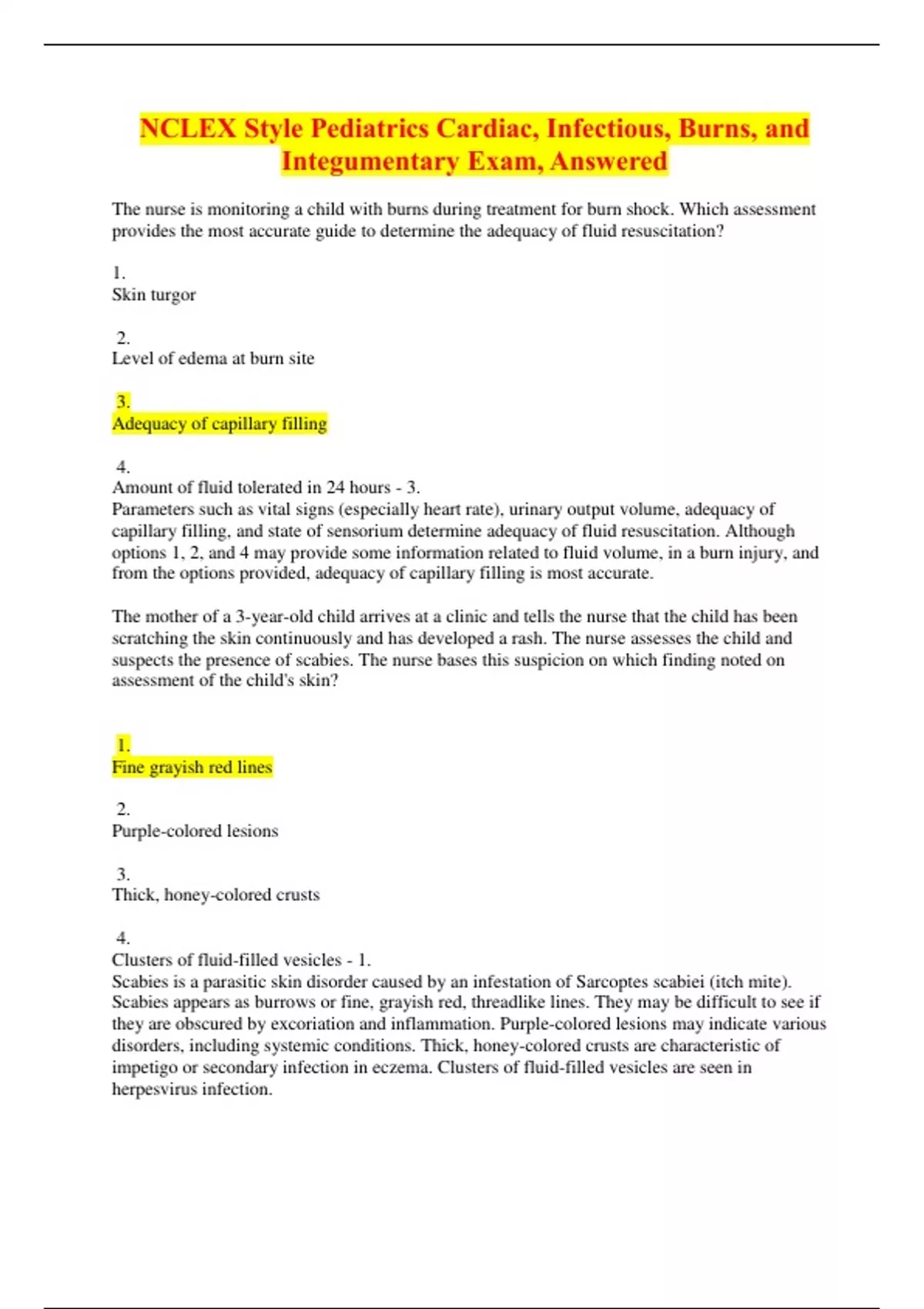 NCLEX Style Pediatrics Cardiac, Infectious, Burns, and Integumentary Exam, Answered-The nurse is monitoring a child with burns during treatment for burn shock. Which assessment provides the most accurate guide to determine the adequacy of fluid resuscitation? 1. Skin turgor 2. Level of edema at burn site 3. Adequacy of capillary filling 4. Amount of fluid tolerated in 24 hours - 3. Parameters such as vital signs (especially heart rate), urinary output volume, adequacy of capillary filling, and state of sensorium determine adequacy of fluid resuscitation. Although options 1, 2, and 4 may provide some information related to fluid volume, in a burn injury, and from the options provided, adequacy of capillary filling is most accurate. The mother of a 3-year-old child arrives at a clinic and tells the nurse that the child has been scratching the skin continuously and has developed a rash. The nurse assesses the child and suspects the presence of scabies. The nurse bases this suspicion on which finding noted on assessment of the child's skin? 1. Fine grayish red lines 2. Purple-colored lesions 3. Thick, honey-colored crusts 4. Clusters of fluid-filled vesicles - 1. Scabies is a parasitic skin disorder caused by an infestation of Sarcoptes scabiei (itch mite). Scabies appears as burrows or fine, grayish red, threadlike lines. They may be difficult to see if they are obscured by excoriation and inflammation. Purple-colored lesions may indicate various disorders, including systemic conditions. Thick, honey-colored crusts are characteristic of impetigo or secondary infection in eczema. Clusters of fluid-filled vesicles are seen in herpesvirus infection. Permethrin is prescribed for a child with a diagnosis of scabies. The nurse should give which instruction to the parents regarding the use of this treatment? 1. Apply the lotion to areas of the rash only. 2. Apply the lotion and leave it on for 6 hours. 3. Avoid putting clothes on the child over the lotion. 4. Apply the lotion to cool, dry skin at least 30 minutes after bathing. - 4. Permethrin is massaged thoroughly and gently into all skin surfaces (not just the areas that have the rash) from the head to the soles of the feet. Care should be taken to avoid contact with the eyes. The lotion should not be applied until at least 30 minutes after bathing and should be applied only to cool, dry skin. The lotion should be kept on for 8 to 14 hours, and then the child should be given a bath. The child should be clothed during the 8 to 14 hours of treatment contact time. The school nurse has provided an instructional session about impetigo to parents of the children attending the school. Which statement, if made by a parent, indicates a need for further instruction? 1. "It is extremely contagious." 2. "It is most common in humid weather." 3. "Lesions most often are located on the arms and chest." 4. "It might show up in an area of broken skin, such as an insect bite." - 3. Impetigo is a contagious bacterial infection of the skin caused by β-hemolytic streptococci or staphylococci, or both. Impetigo is most common during hot, humid summer months. Impetigo may begin in an area of broken skin, such as an insect bite or atopic dermatitis. Impetigo is extremely contagious. Lesions usually are located around the mouth and nose, but may be present on the hands and extremities. The clinic nurse is reviewing the health care provider's prescription for a child who has been diagnosed with scabies. Lindane has been prescribed for the child. The nurse questions the prescription if which is noted in the child's record? 1. The child is 18 months old. 2. The child is being bottle-fed. 3. A sibling is using lindane for the treatment of scabies. 4. The child has a history of frequent respiratory infections. - 1. Lindane is a pediculicide product that may be prescribed to treat scabies. It is contraindicated for children younger than 2 years because they have more permeable skin, and high systemic absorption may occur, placing the children at risk for central nervous system toxicity and seizures. Lindane also is used with caution in children between the ages of 2 and 10 years. Siblings and other household members should be treated simultaneously. Options 2 and 4 are unrelated to the use of lindane. Lindane is not recommended for use by a breast-feeding woman because the medication is secreted into breast milk. A topical corticosteroid is prescribed by the health care provider for a child with atopic dermatitis (eczema). Which instruction should the nurse give the parent about applying the cream? 1. Apply the cream over the entire body. 2. Apply a thick layer of cream to affected areas only. 3. Avoid cleansing the area before application of the cream. 4. Apply a thin layer of cream and rub it into the area thoroughly - 4. Atopic dermatitis is a superficial inflammatory process involving primarily the epidermis. A topical corticosteroid may be prescribed and should be applied sparingly (thin layer) and rubbed into the area thoroughly. The affected area should be cleaned gently before application. A topical corticosteroid should not be applied over extensive areas. Systemic absorption is more likely to occur with extensive application. The school nurse is performing pediculosis capitis (head lice) assessments. Which assessment finding indicates that a child has a "positive" head check? 1. Maculopapular lesions behind the ears 2. Lesions in the scalp that extend to the hairline or neck 3. White flaky particles throughout the entire scalp region 4. White sacs attached to the hair shafts in the occipital area - 4. Pediculosis capitis is an infestation of the hair and scalp with lice. The nits are visible and attached firmly to the hair shaft near the scalp. The occiput is an area in which nits can be seen. Maculopapular lesions behind the ears or lesions that extend to the hairline or neck are indicative of an infectious process, not pediculosis. White flaky particles are indic