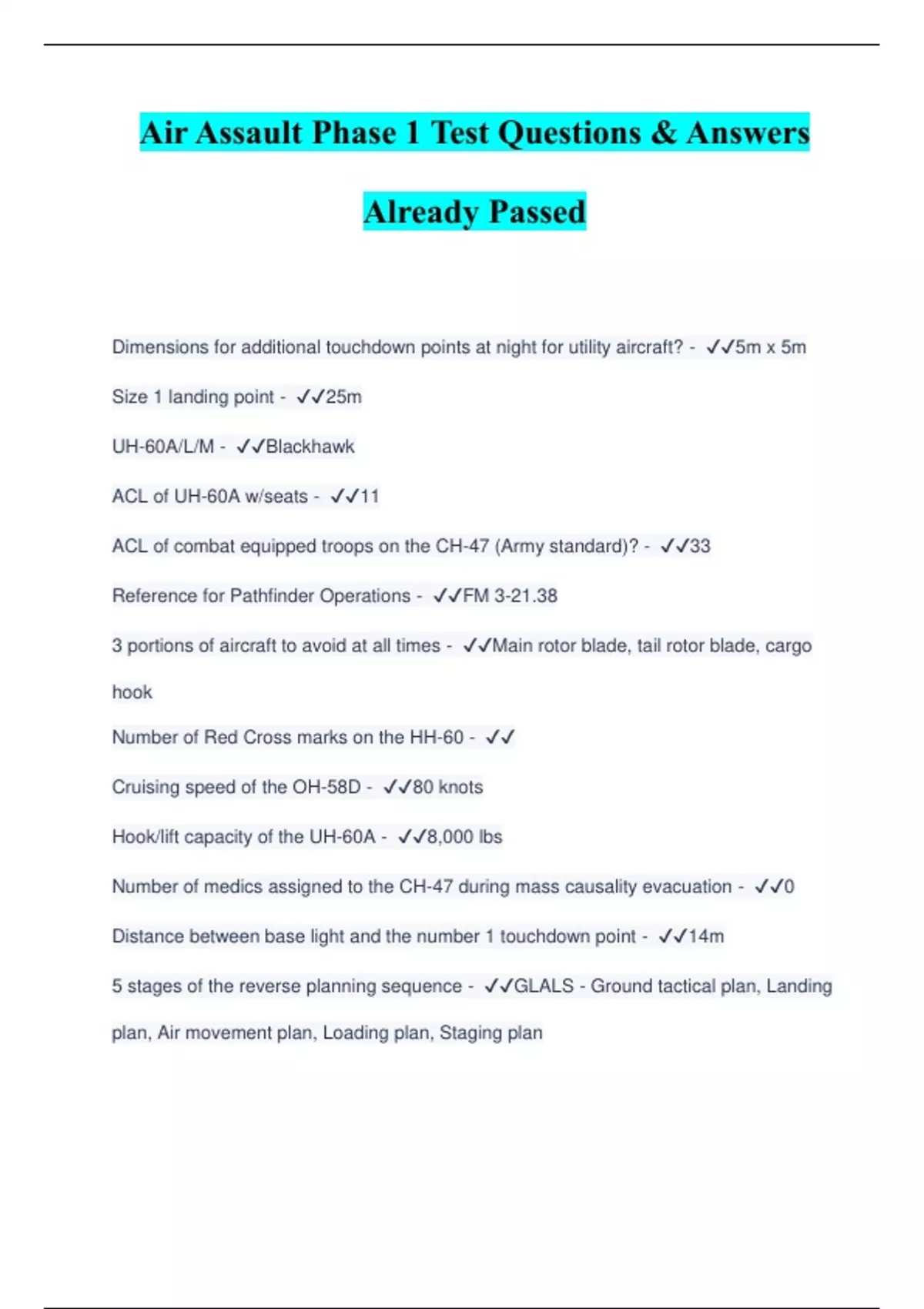 Air Assault Phase 1 Test Questions & Answers Already Passed